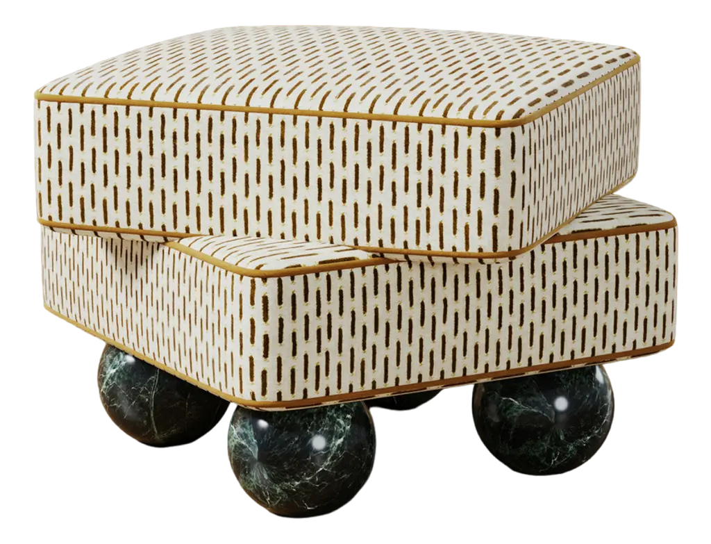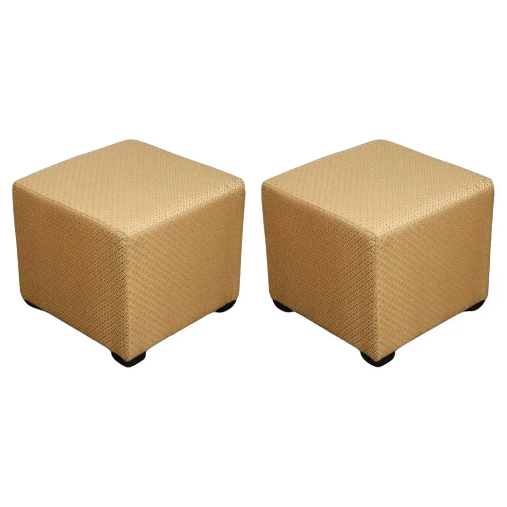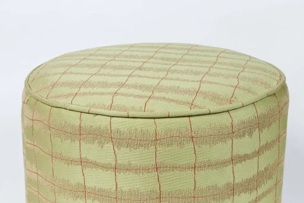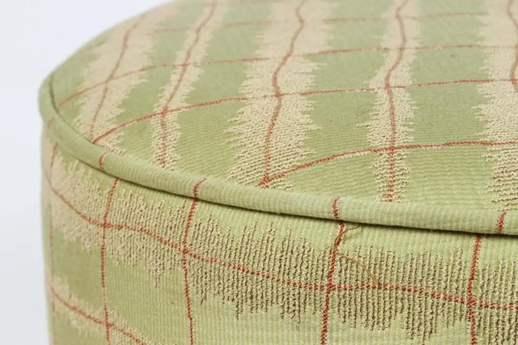 Pair of Art Deco Style jade green and gold Moroccan style stools. Pair of modern Contemporary round Moroccan Moorish style stool in lime green fabric upholstery in 1970s style. Art Deco Style little pouf hassock, upholstered footstool or modern circular ottoman. This versatile Arabian accent piece, pouf is designed primarily for seating but can be used as both seating and as a pull up table.Multiple upholstered stools available, great to use in a Middle Eastern restaurant, for a Moroccan party as extra seats, or for kids room as they are very light to carry around. Please call us if you need more than two. We have more available.Art Deco Style, Hollywood Regency or Moroccan style pouf in Maison Jansen or Jean Royere style. Measures: Size is 18 inches diameter x 17 inches height. The weight 10 lbs each.