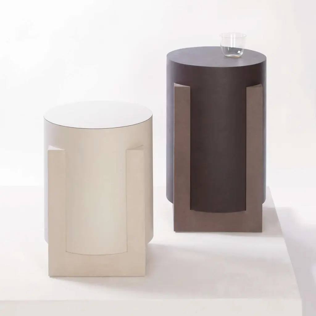 For nearly twenty years, the Giobagnara brand has combined traditional know-how and leading-edge technology to produce elegance of the highest standard. With luxurious creations available in a unique and virtually limitless color palette of leathers and suede, Giobagnara now boasts one of the most comprehensive offers of leather home accessories on the market.Created as a graphic homage to the architecture and stylized ornamentation of Italian palazzos, the Palazzo line combines travertine (an emblematic stone in Italy) with nappa leather and suede. Lamps, candleholders, vases, trays and change trays with detachable bases subtly underscore contrasts of texture, colour and material. Cylinder available only in printed calfskin, suede, nappa; square base available only in suede.