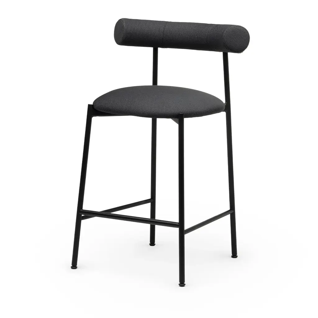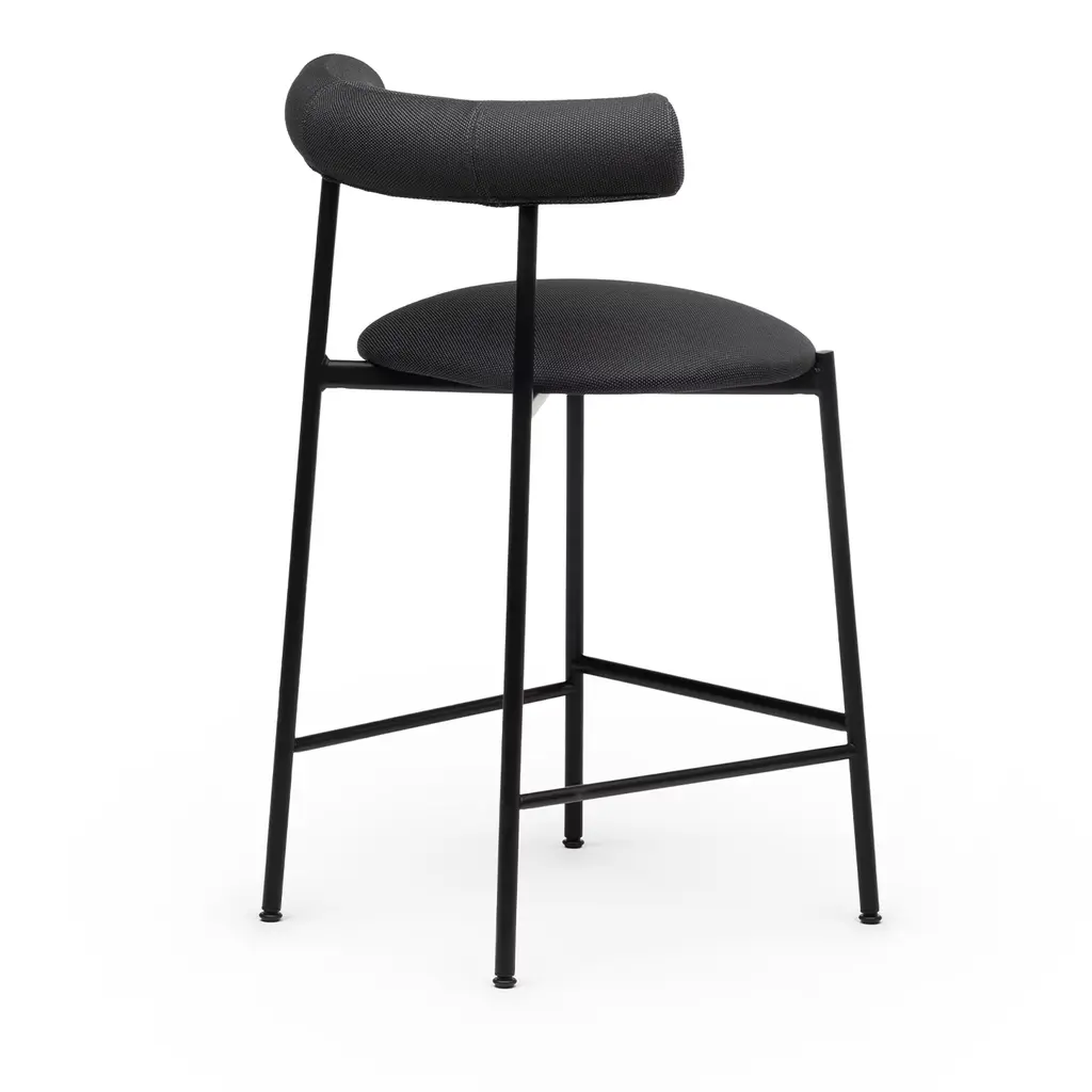 Effortlessly sophisticated due to its combination of sleek lines and total-black look, this stool offers a welcoming spot where to sit for a drink or lunch. Utmost comfort is ensured by the embracing, cylindrical-cut backrest and 65cm-high seat, both generously stuffed and wrapped in black recycled PET fabric (cat. C). Multiple variants can be explored in the Artemest catalog.