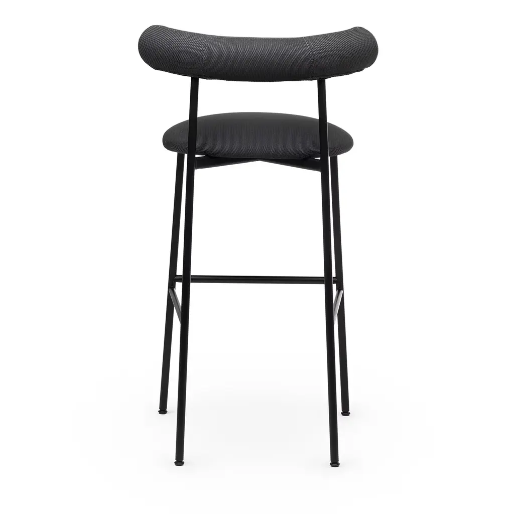 Comfort and minimalism are cleverly synthesized in this stool of modern inspiration. The generous padding characterizing both the embracing cylindrical-cut backrest and the seat ensures impeccable comfort while sipping a drink or having lunch, an effect emphasized by a soft, anthracite-hued upholstery in 100% PET recycled fabric. The slender frame is black powder-coated steel.