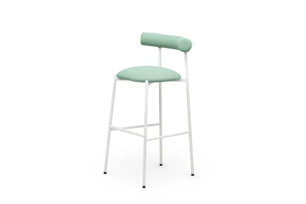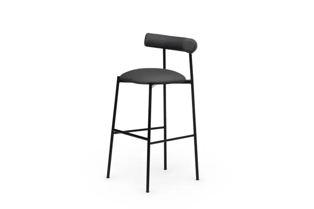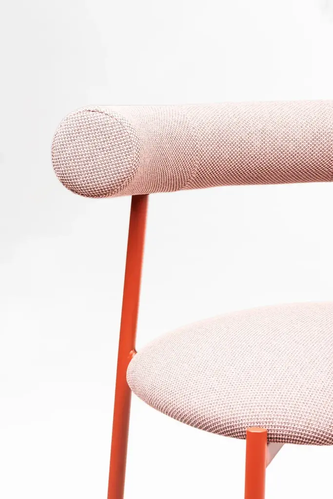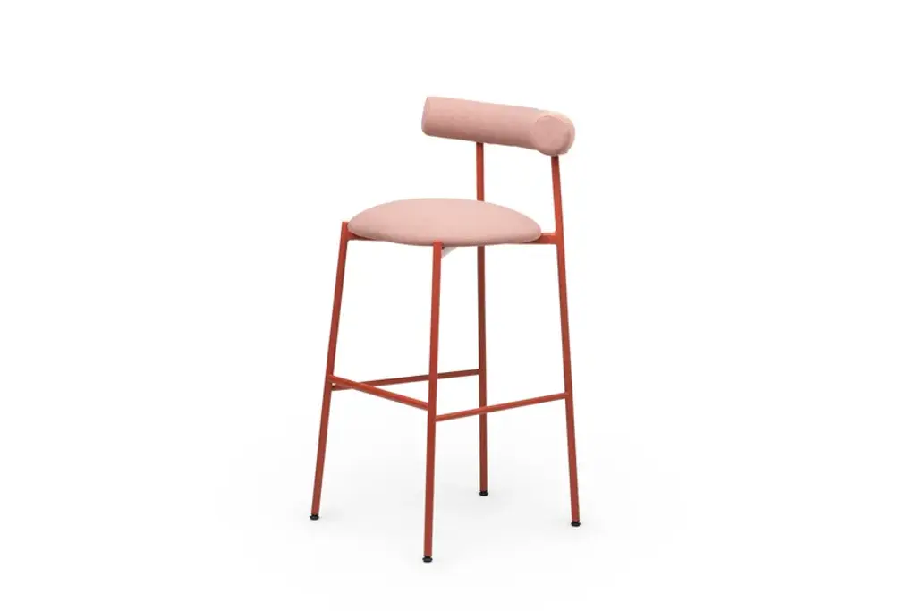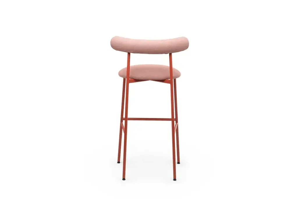 Pampa SG-80 is a high stool in black, white or brick powder-coated steel frame. Upholstered seat and back with recycled fabric.Gleefully extravagant in its proportions, Pampa is a collection of chairs and stools with an unusual and delicate charm. Welcoming in the oversized design of the upholstered backrest, combined with a thin metal structure and a soft seat, the Pampa chairs interpret the needs of any environment with imagination and delicacy. Linearity and iconography come together in a game of proportions. The filiform harmony of the structure is unbalanced by a rounded and generous back which becomes the distinctive element of the collection. The result is a series of iconic and vaguely extravagant seats that evoke the fascinating graphic signs of rock paintngs and frescoes of ancient Mediterranean civilizatons. With its welcoming shapes, its contemporary profile and colored upholstery in recycled fiber fabrics, the Pampa collecton is dedicated to comfort in every scenario of contemporary living.