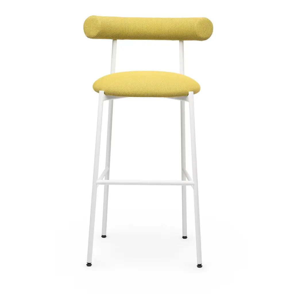 A lively addition to total-white contemporary decors where it will add a pop of color, this stool was designed with comfort and sleekness in mind. The airy design of the white powder-coated steel frame combines with the plush one of the 81cm-high seat and enveloping, cylindrical-cut backrest, both richly padded and upholstered in a fresh lime-green recycled PET fabric - cat. C.