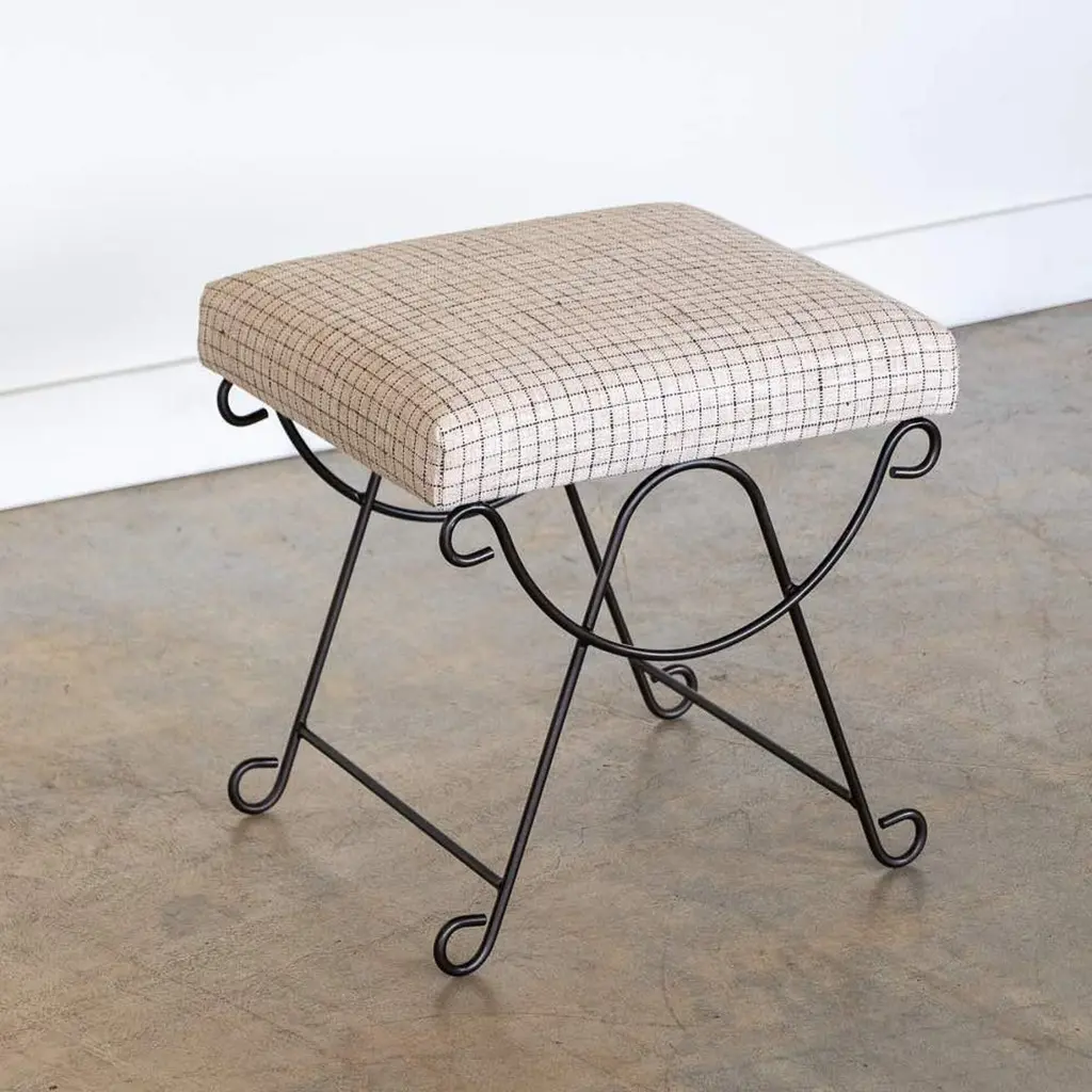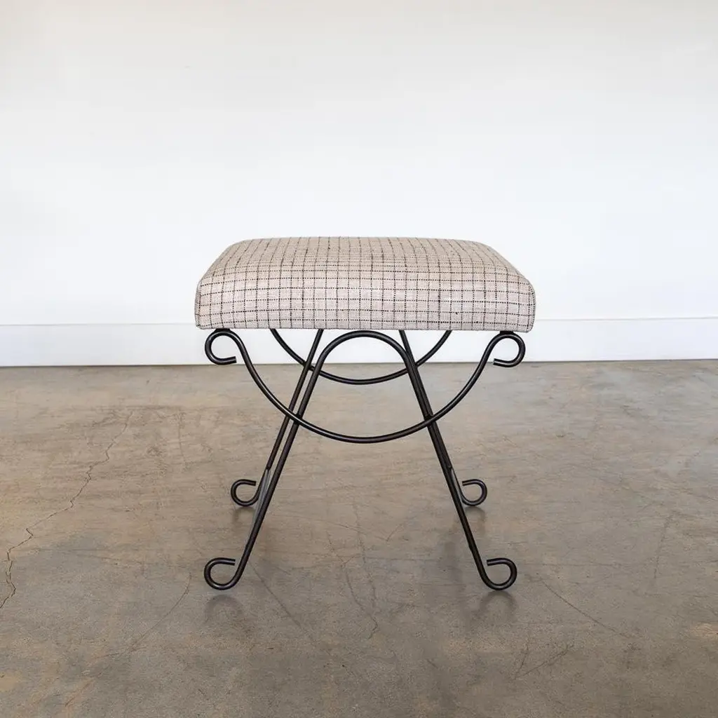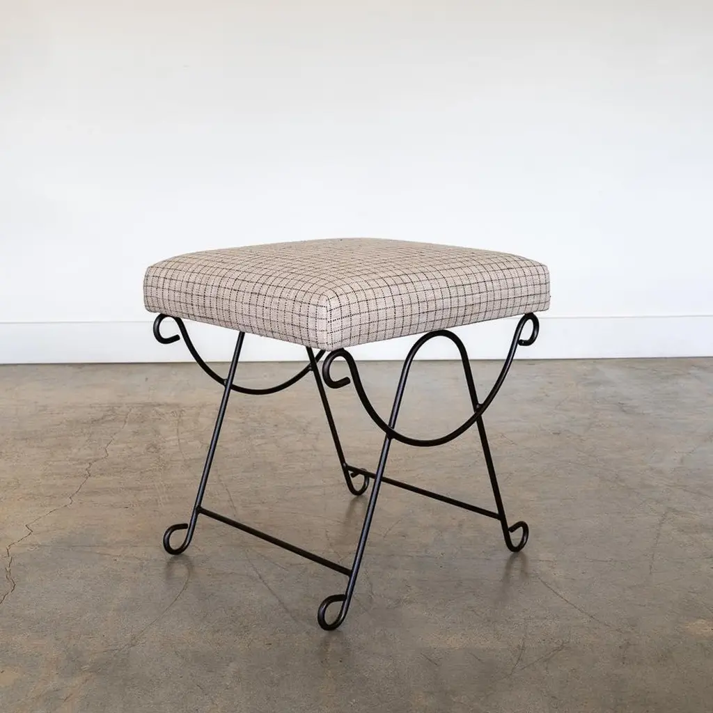 Beautiful iron stool with curved and looped base painted in a matte black finish inspired by French design. Rectangular cushioned seat upholstered in a check linen or can be COM. Made in Los Angeles.