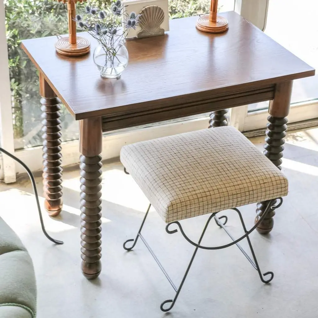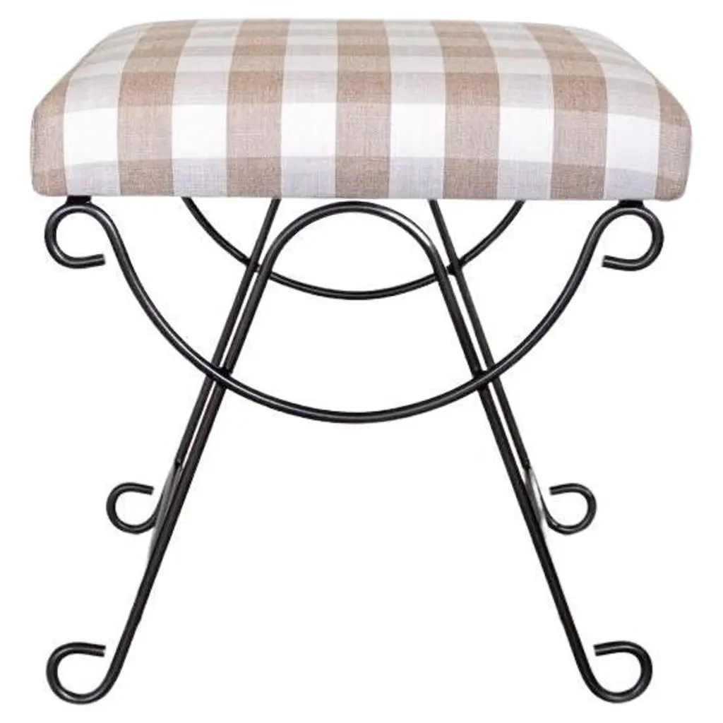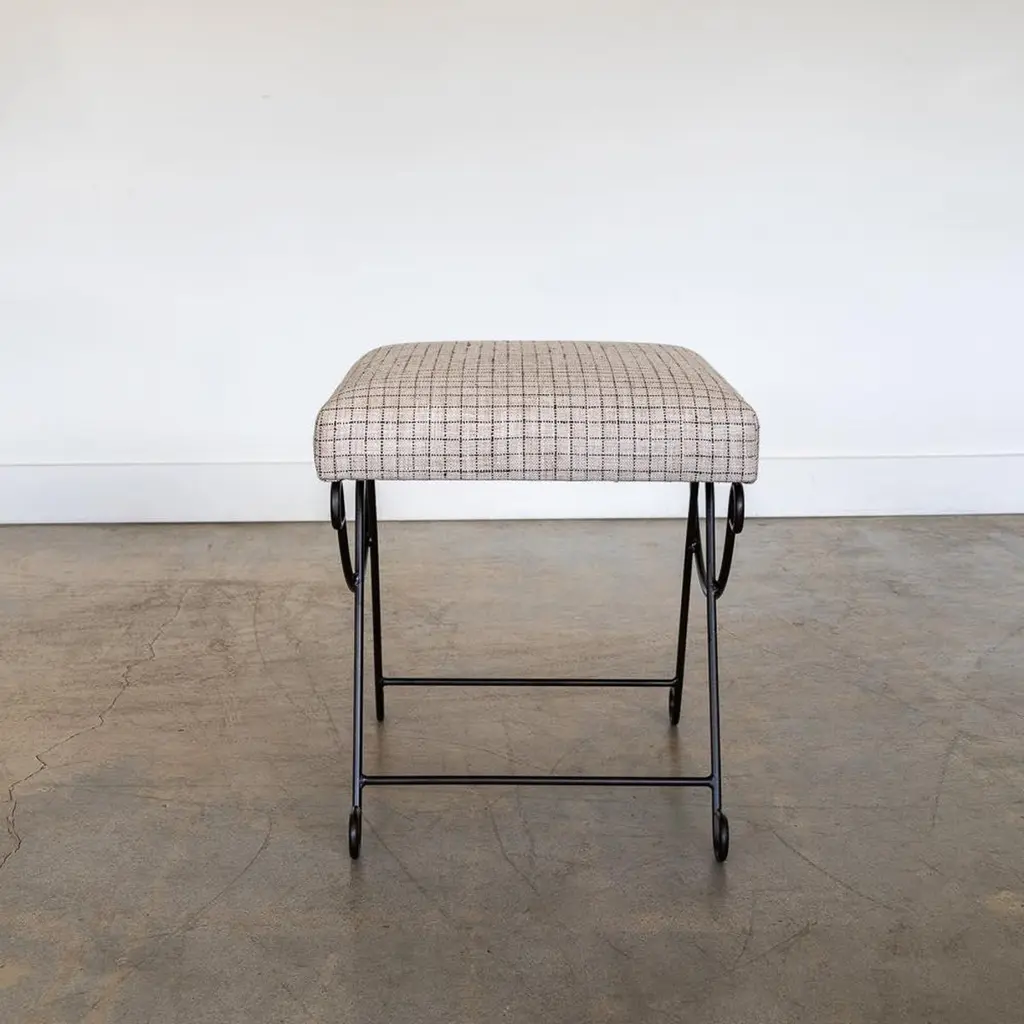 Beautiful iron stool with curved and looped base painted in a matte black finish inspired by French design. Rectangular cushioned seat upholstered in a check linen or can be COM. Made in Los Angeles.