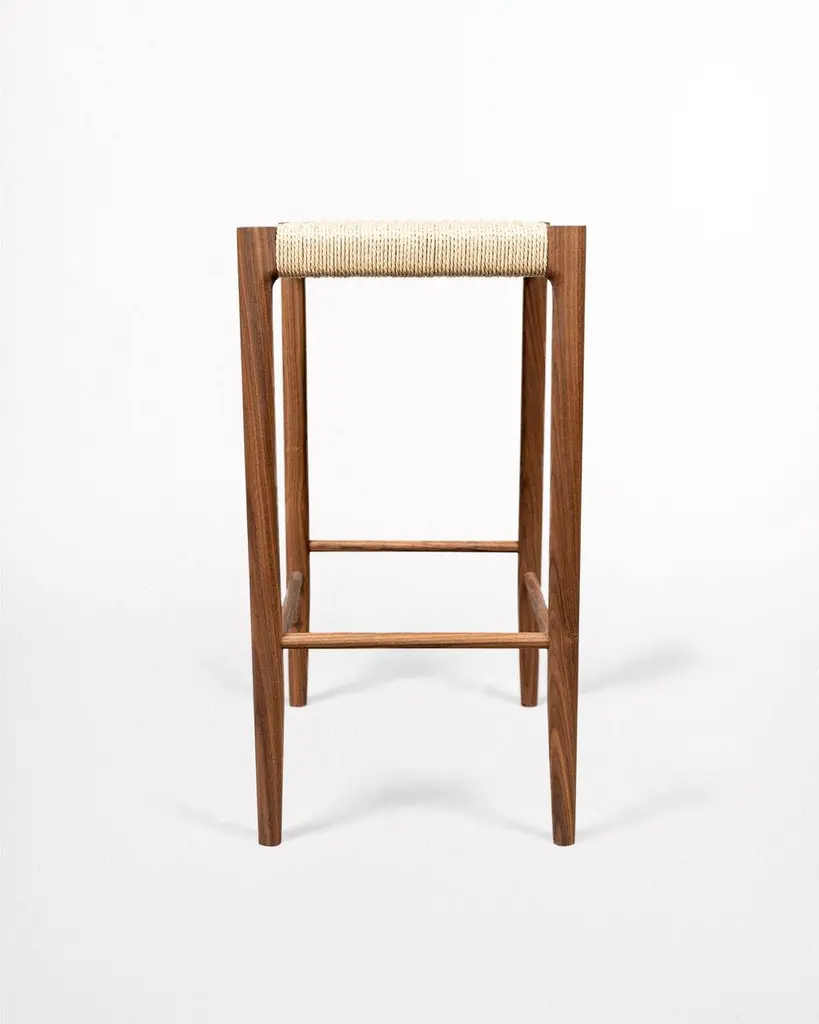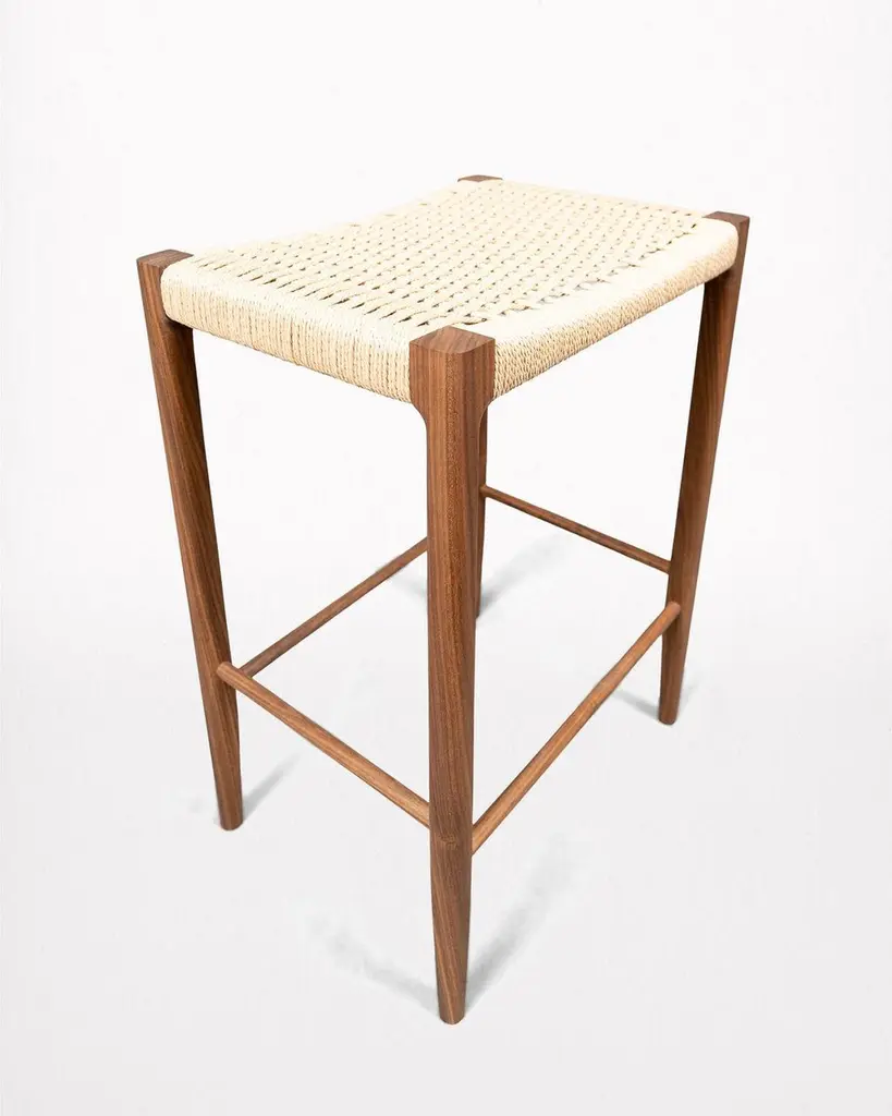 Featuring a mortice and tenon frame and handwoven seat, the Papyri Stool is artisan-crafted from recyclable paper cord, and sustainably harvested walnut.The seat features a continuous run of Danish paper cord woven around "L Shaped Nails" in a traditional binder-cane method of warped pairs. The stool frame is constructed with floating tenon joinery and each leg is hand-sculpted with spoke shave and file for flowing transition between frame and seat. Each stool is made to order by hand and finished with a 100% plant-based, hardwax-oil.