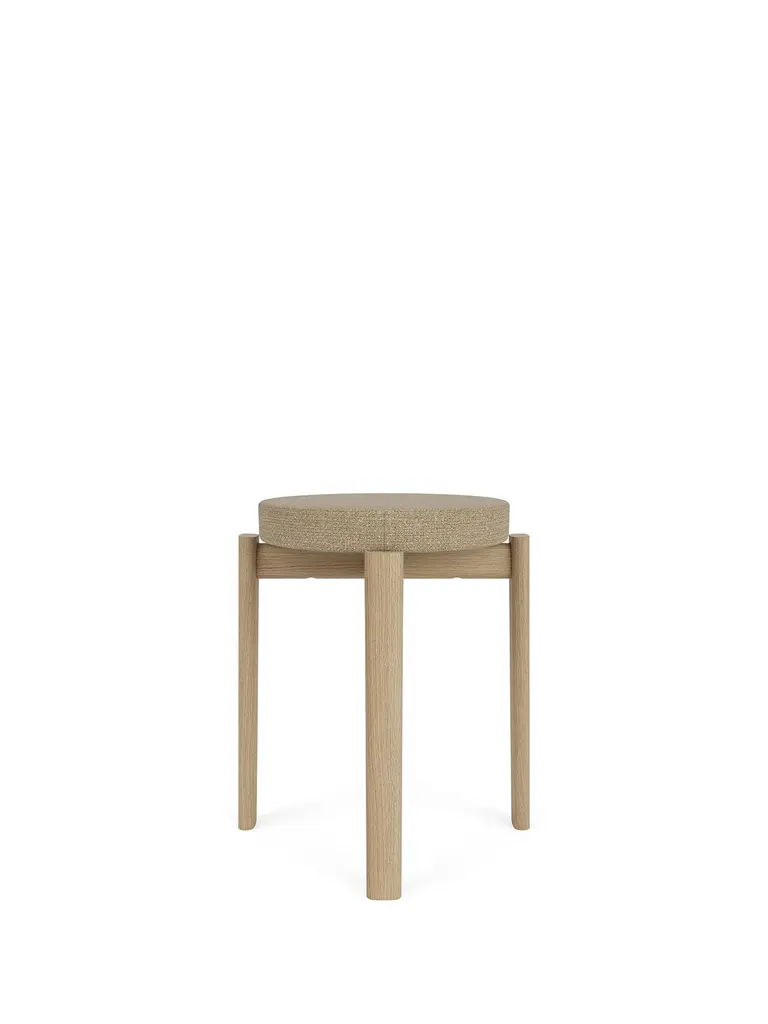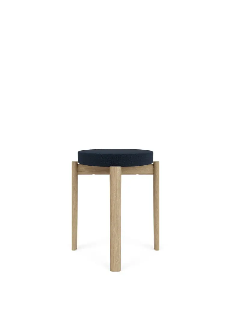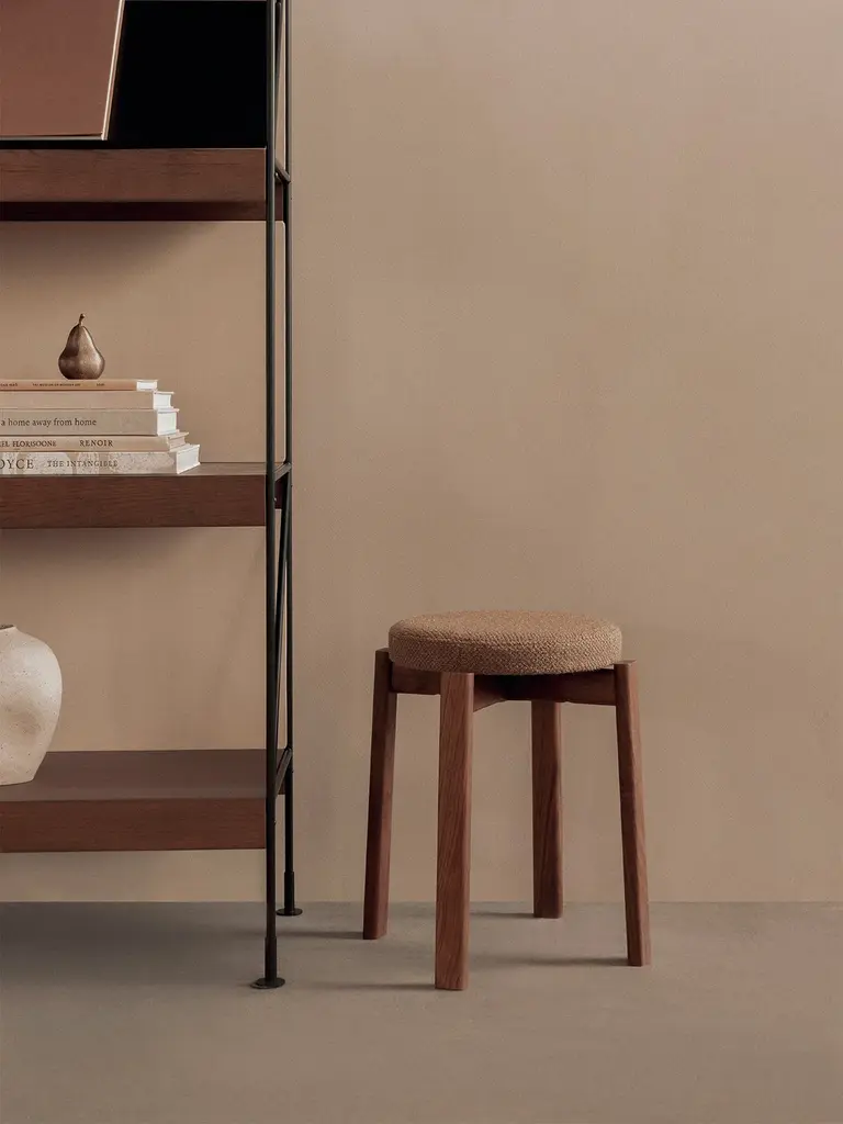 The Passage Collection demonstrates meticulous attention to detail, highlighting a commitment to both comfort and aesthetics rooted in traditional woodworking techniques. In solid, lacquered walnut or FSC™-certified solid oak, the stackable stool presents unique grain patterns inherent to the high-quality hardwoods and a warm and inviting expression. With its upholstered seat, offered in customizable fabric options for a personal touch, the small but perfectly formed design provides a comfortable seating experience for extended periods.