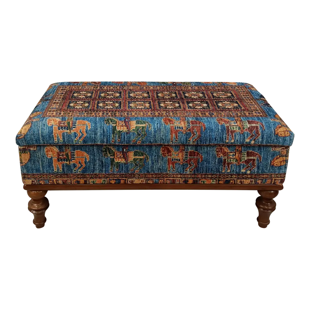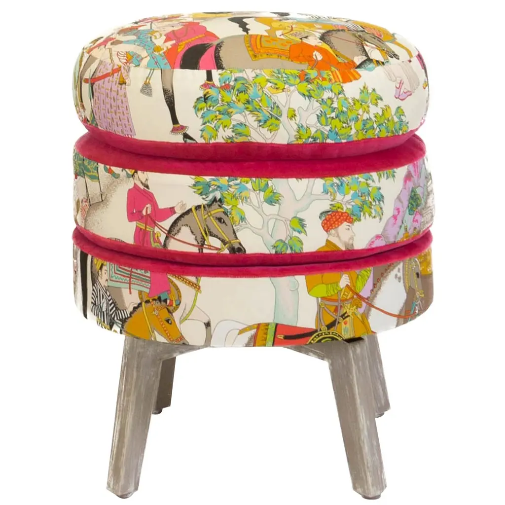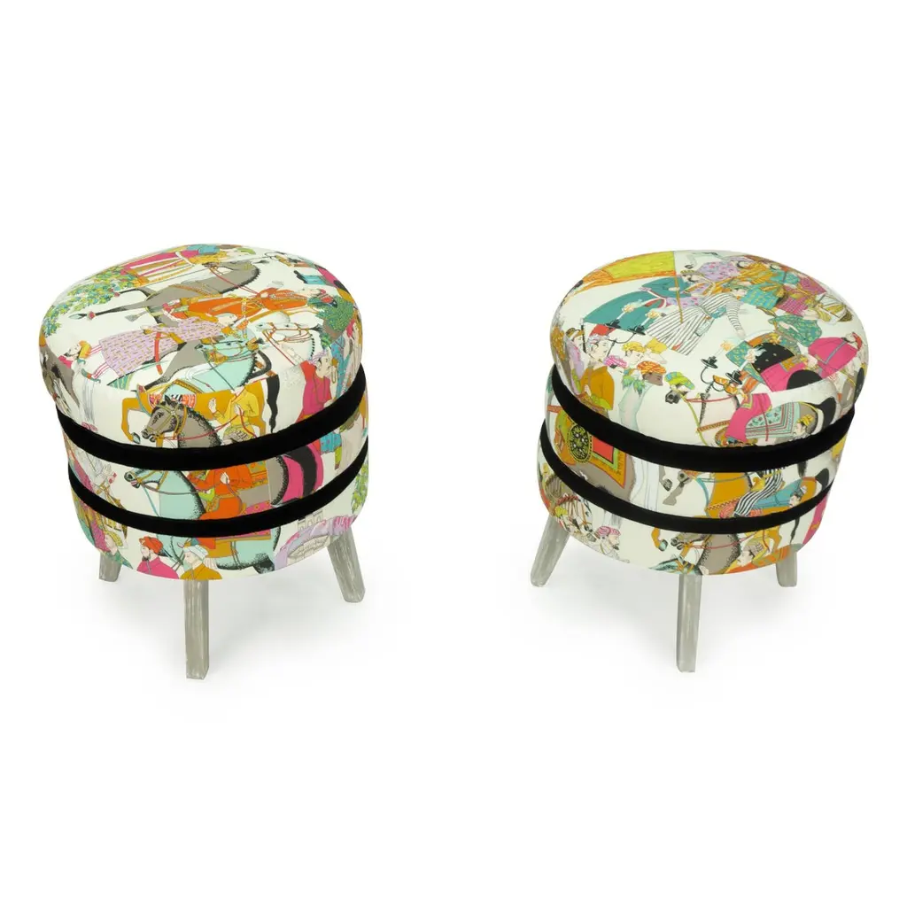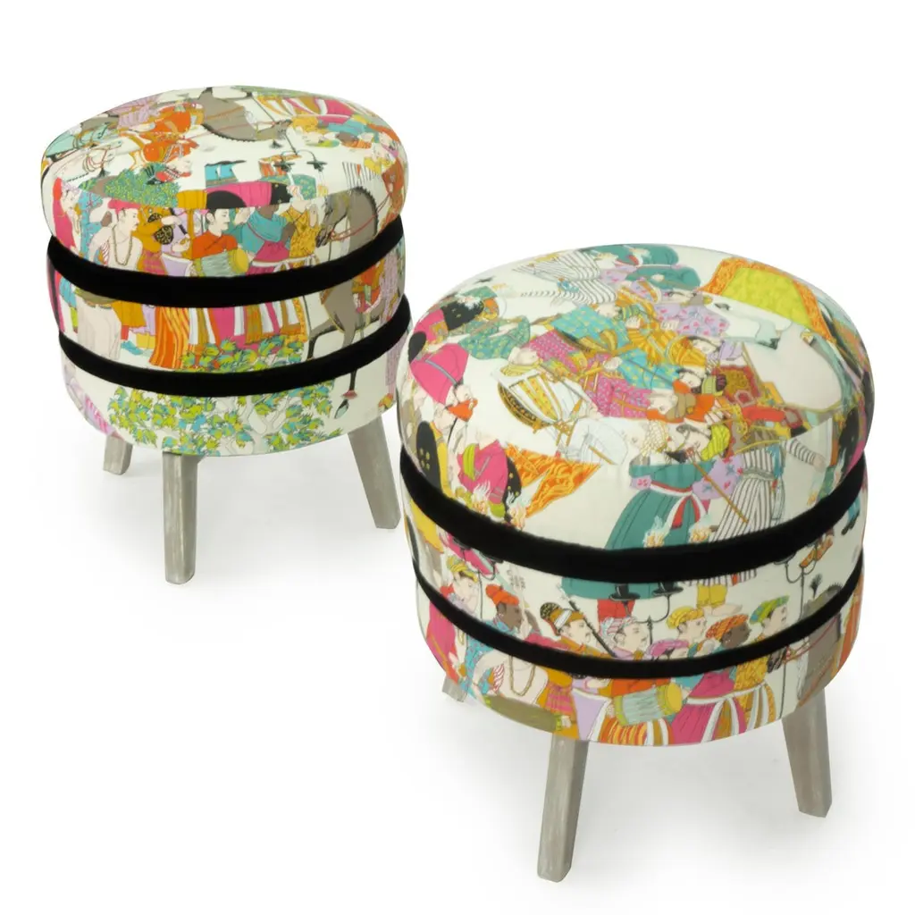 Our three layered ottoman stool features three layers of soft foam cushioning upholstered with an exotic toile fabric by Manuel Canovas with black velvet outlining. The legs are maple wood with a hand brushed painted finish. This piece can be made in custom sizes, fabrics and wood finishes.Measurements:Outside 17” W x 17" D x 20" HPrice as shown: $1,740 eachCOM price: $1,120 eachCustomization may change price.How we work:Made to order by Connecticut-based furniture design and manufacturing company The Tailored Home. After orders are placed our workshop manager creates a visual work order for your approval for quality assurance.Customization options:Dimensions can be customized.The fabric shown may come in more colors. We also carry thousands of other materials and can send you samples and fabric pricing upon request. We accept your fabric for a COM fee of 5% of the cost of the piece. Welting, piping, tape or trim can be added. Different species available for pieces with exposed wood and can be painted & lacquered in any Benjamin Moore color (for additional charge) or stained in one of our stain options. Custom color matches cost $75 per sample.We accept inspiration photos of pieces you like.