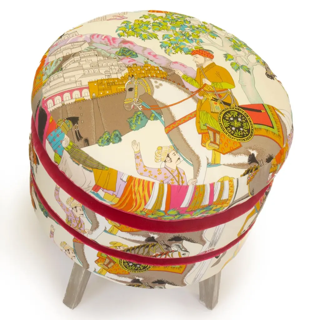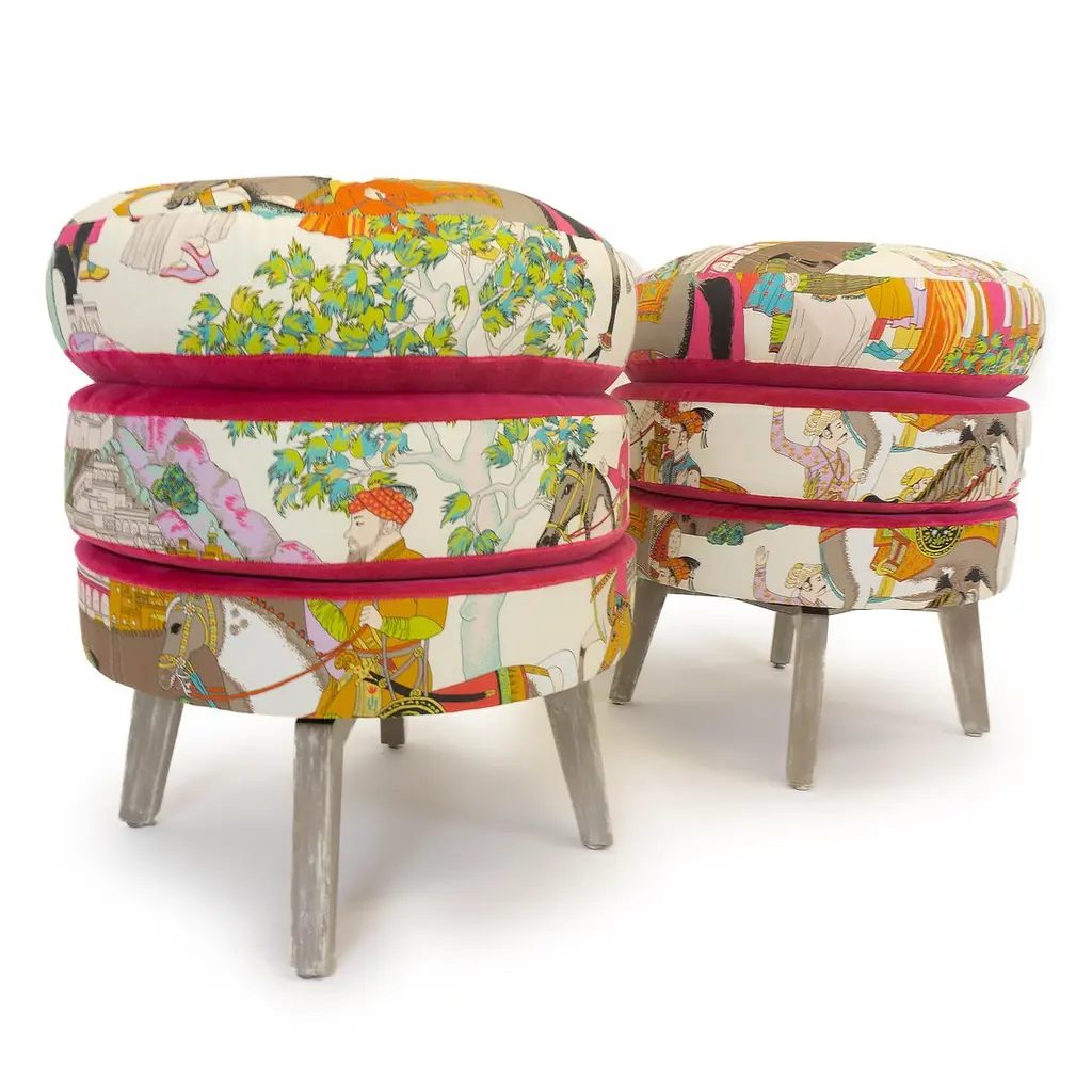 Our three layered ottoman stool features three layers of soft foam cushioning upholstered with an exotic toile fabric by Manuel Canovas with pink velvet outlining. The legs are maple wood with a hand brushed painted finish. This piece can be made in custom sizes, fabrics and wood finishes. Ask if piece as shown is currently available. Measurements:Outside 17” W x 17" D x 20" HPrice as shown: $1,740 eachCOM price: $1,120 eachCustomization may change price.How we work:Made to order by Connecticut-based furniture design and manufacturing company The Tailored Home. After orders are placed our workshop manager creates a visual work order for your approval for quality assurance.Customization options:Dimensions can be customized.The fabric shown may come in more colors. We also carry thousands of other materials and can send you samples and fabric pricing upon request. We accept your fabric for a COM fee of 5% of the cost of the piece. Welting, piping, tape or trim can be added. Different species available for pieces with exposed wood and can be painted & lacquered in any Benjamin Moore color (for additional charge) or stained in one of our stain options. Custom color matches cost $75 per sample.We accept inspiration photos of pieces you like.