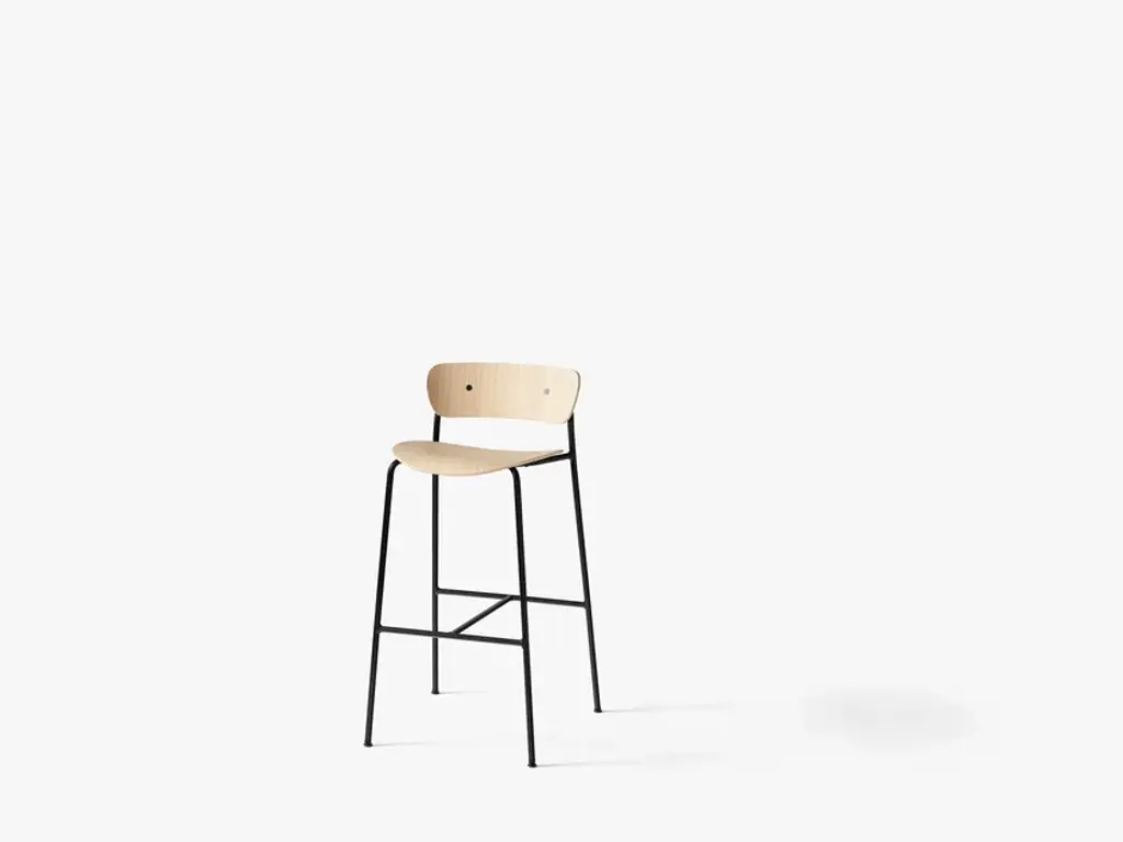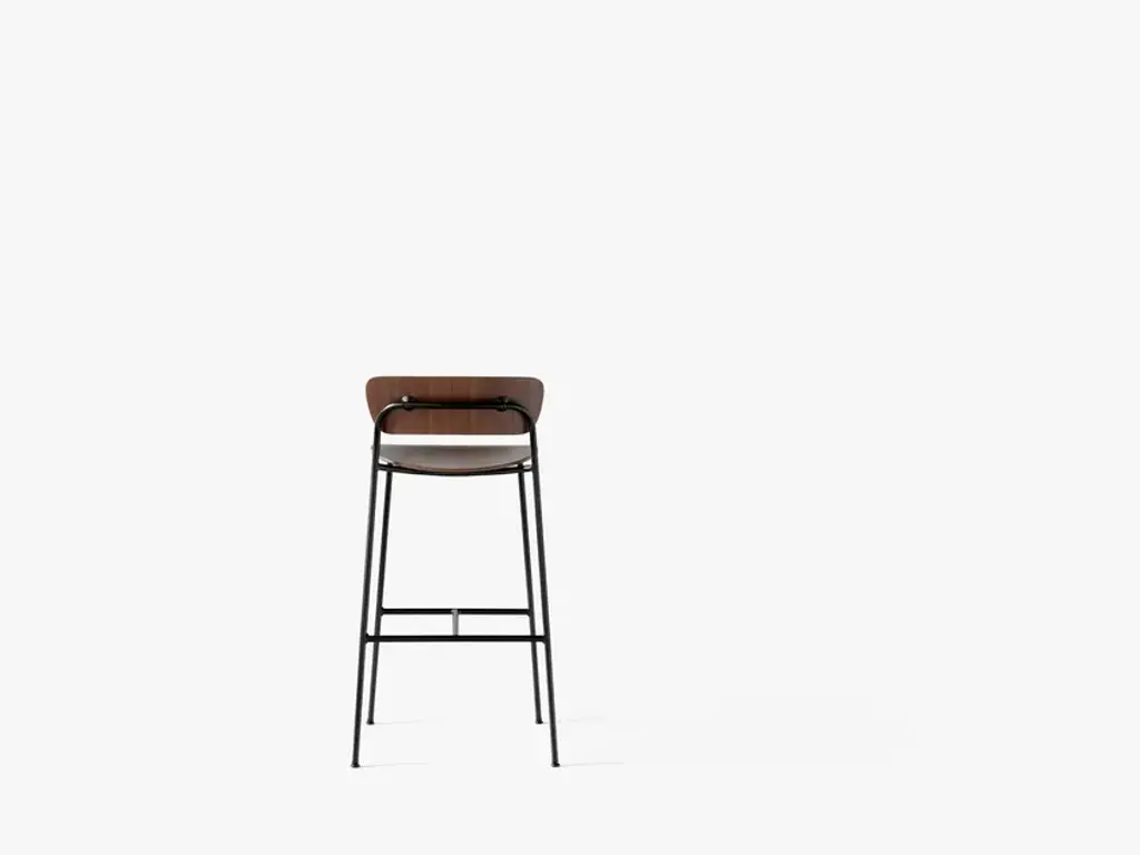 The Pavilion bar & counter chair has an airy feeling, with fluid curves for the wood veneer seat and back which continue as lyrical lines in the steel tubes of the legs. The result is a silhouette that’s barely there. Ideal for furnishing an expansive bar or a kitchen counter without appearing crowded, they can easily fill a space without the space appearing full. “Tube chairs had their start in early modernism, but they were usually constructed at fixed angles,” notes Anderssen & Voll. “We wanted to explore a more open construction, a freer form of expression.”MaterialSteel tubes and formpressed veneerProduction ProcessThe chair is made from bent steel tubes and formpressed veneer. The veneer seat and back rest are finished with a PU lacquerWood FinishesLacquered OakBlack Lacquered OakLacquered WalnutMetal FinishesBlackTest and CertificationsStrength, Durability and Safety TestingThe stool is tested for strength, durability and safety according to:EN 16139 Level 2 – extreme contract useManufactureProduced in Denmark by Kvist Industries A/S