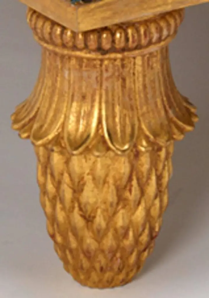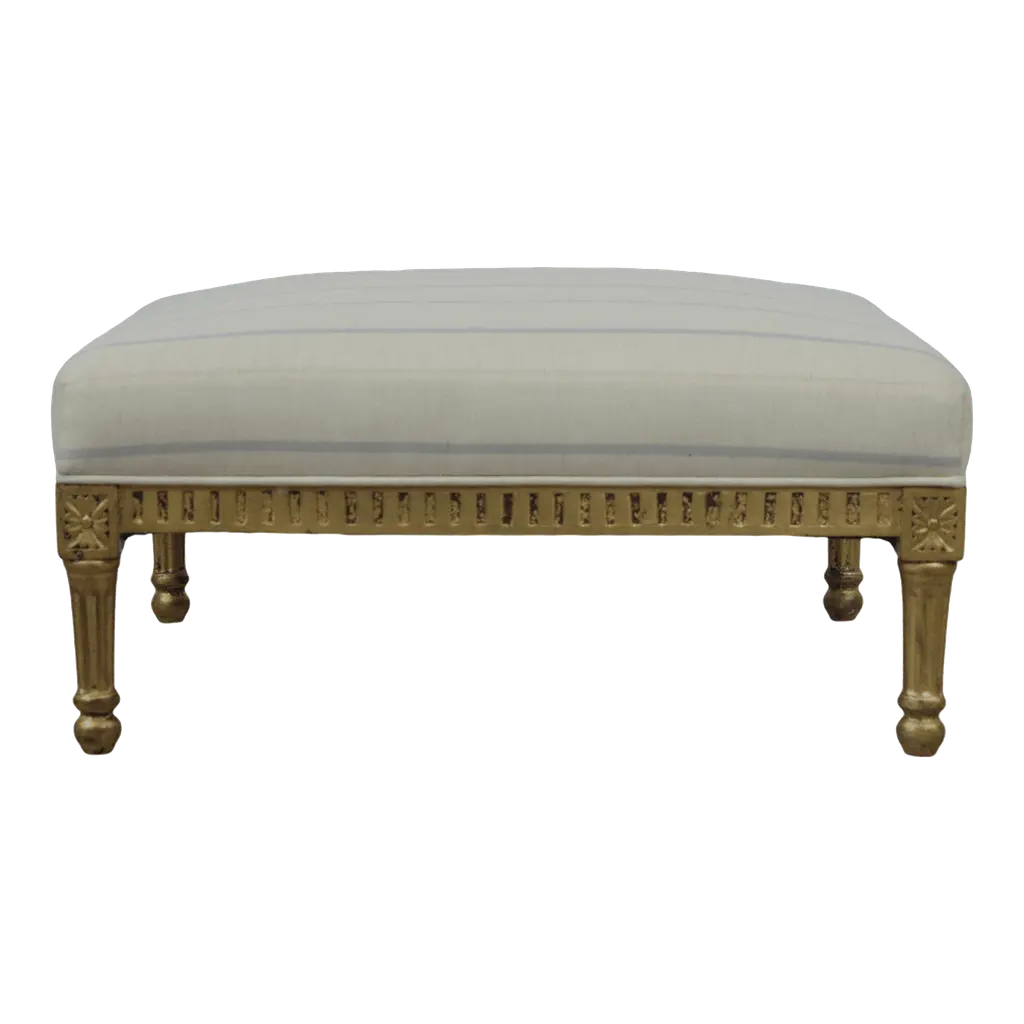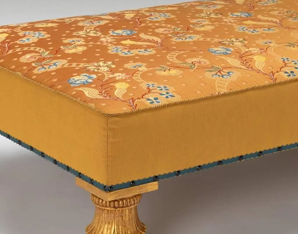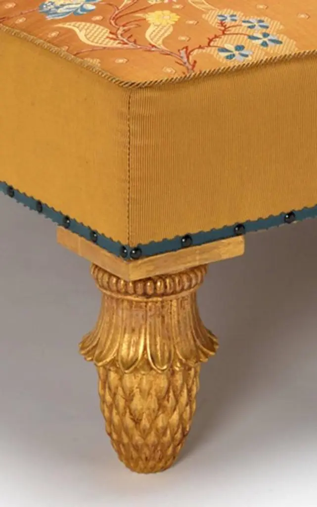 A carved giltwood Regency design stool, supported by four elegant pineapple feet. Upholstered in the clients own material.Can also be used as a coffee table, or bedroom end stool.This item is made to order.We are currently working to a 30-36 week lead time.