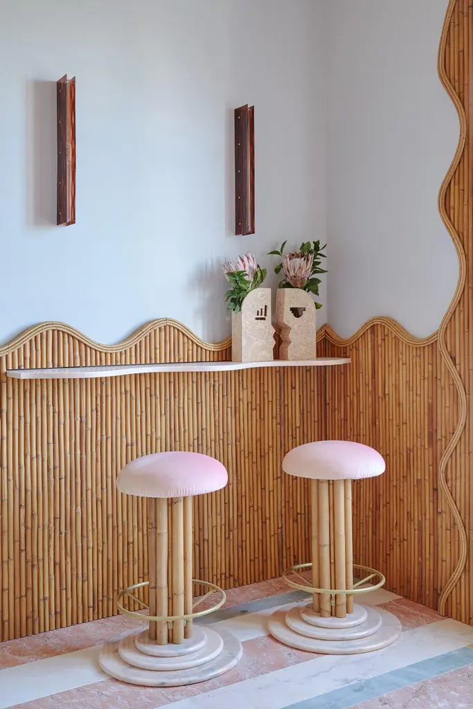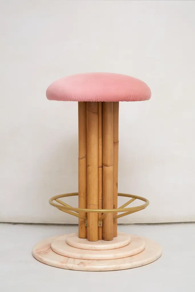 Peaches Stool by Patricia Bustos de la TorreDimensions: D 38 x W 38 x H 84 cm.Materials: Rattan, pink Portuguese marble, velvet and iron. Taburete Peachy is sexy and sensual but round and surprising. A bomb of color and textures that will impact like a projectile on any stage. Velvet in gradient from pink to yellow, rattan tubes without natural pillar also in theform of cartridge and brass are the perfect mix ready for detonation with a pink Portuguese marble base 3 discs.Patricia Bustos is an internationally renowned Spanish artist known for her work designing utopian pieces and spaces. Her creative gaze becomes an act of rebellion and her projects are full of a disruptive narratives that evolves with social trends. Her work is imbued with deep meaning because of her endless curiosity for the human being and its concerns such philosophy, language, architecture, art and nature. Her objects are handcrafted and aim to become cult pieces. Her work seeks to evokeaesthetic emotion trough a unique story behind every design. That is why wonder is the cornerstone of her work. The indelible memory that inspires us eternally comes from wonder. Through a bold use of color and an unexpected combination of shapes and materials, she is looking for contrast. Her pieces are distinguished by translucent or reflective elements juxtaposed with handmade or raw materials. As a result, her proposal achieves an atypical and fascinating balance at the same time. In her own words: "The purest beauty lies at the boundary between craftsmanship and utopia".