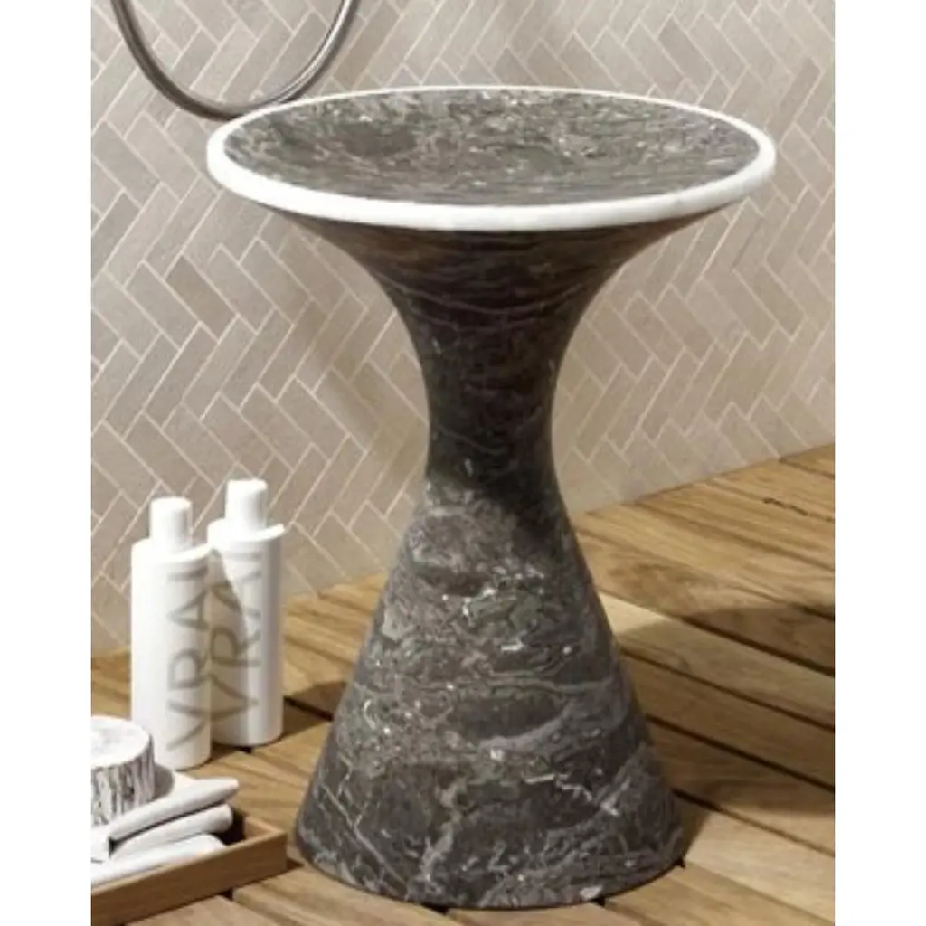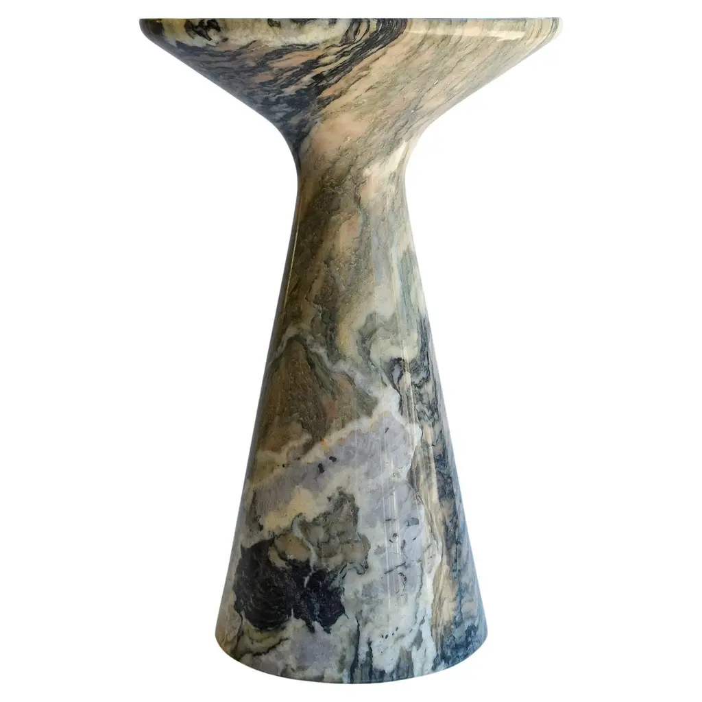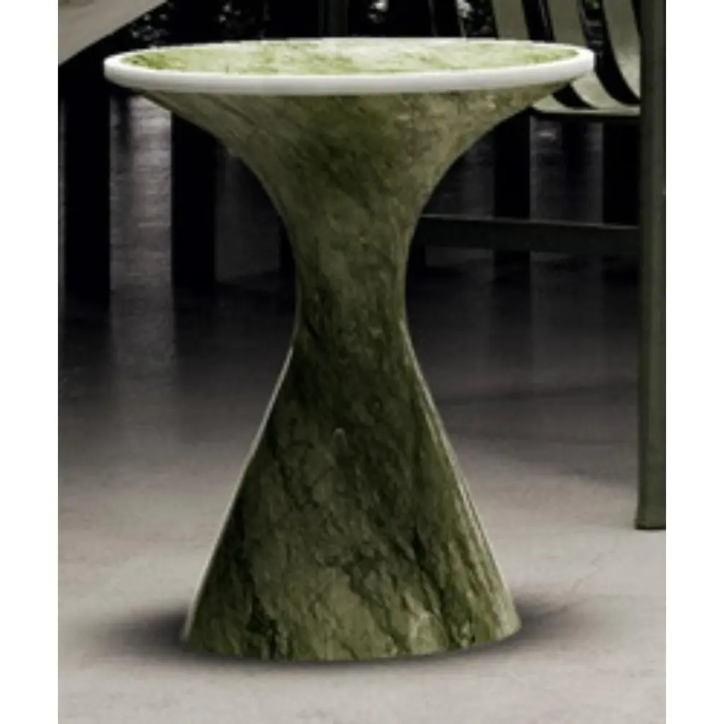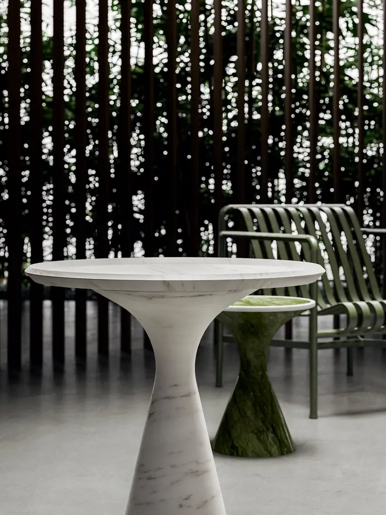 Pedina Stool by Kreoo Designed by Enzo BertiDimensions: Ø 36 x H 43 cm.Base: Ø 25 cm.Materials: Verde Imperiale marble.Available in different marble options. Please contact us.The idea of creating a collection of interior design objects – seats and coffee tables – in which the intrinsic hardness of marble is mitigated by the sinuosity of the shape has led the Pedina-Torre family designed by Enzo Berti.The elements remind the silhouette of the famous board game, with bases with tapered conical sections that emphasize the natural material, which can be selected from eight types in the catalog.The top is circular and features a special, embossed edge that is available in two sizes in the Torre table line and three variations for Pedina.It has a beveled top, to ensure the best ergonomics also for sitting, and its rim can be made with a contrasting marble, for a beautiful decorative effect.Kreoo: the new marble experienceKreoo links its name to the best Italian tradition in marble manufacturing and brings to new light the primordial charm of a material that has witnessed the evolution of civilizations and cultures.From the bathroom and living room to coverings, home accessories, and lamps, the company works with natural stone in various forms and aesthetic compositions, enriching it with other materials such as metals, wood, and glass. The result is a fascinating and chromatic language, suitable both indoors and outdoors. Expressed in contemporary but still customizable designs, Kreoo highlights workmanship know-how and excellence.The brand, born in 2010 by the experience of Decormarmi and its worldwide distribution strength, has led to major international projects, especially in hospitality and luxury residential.