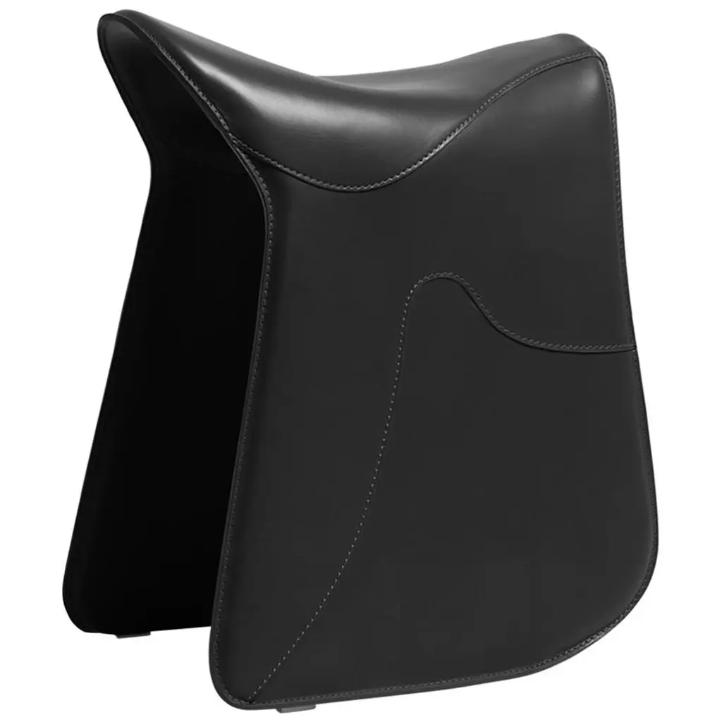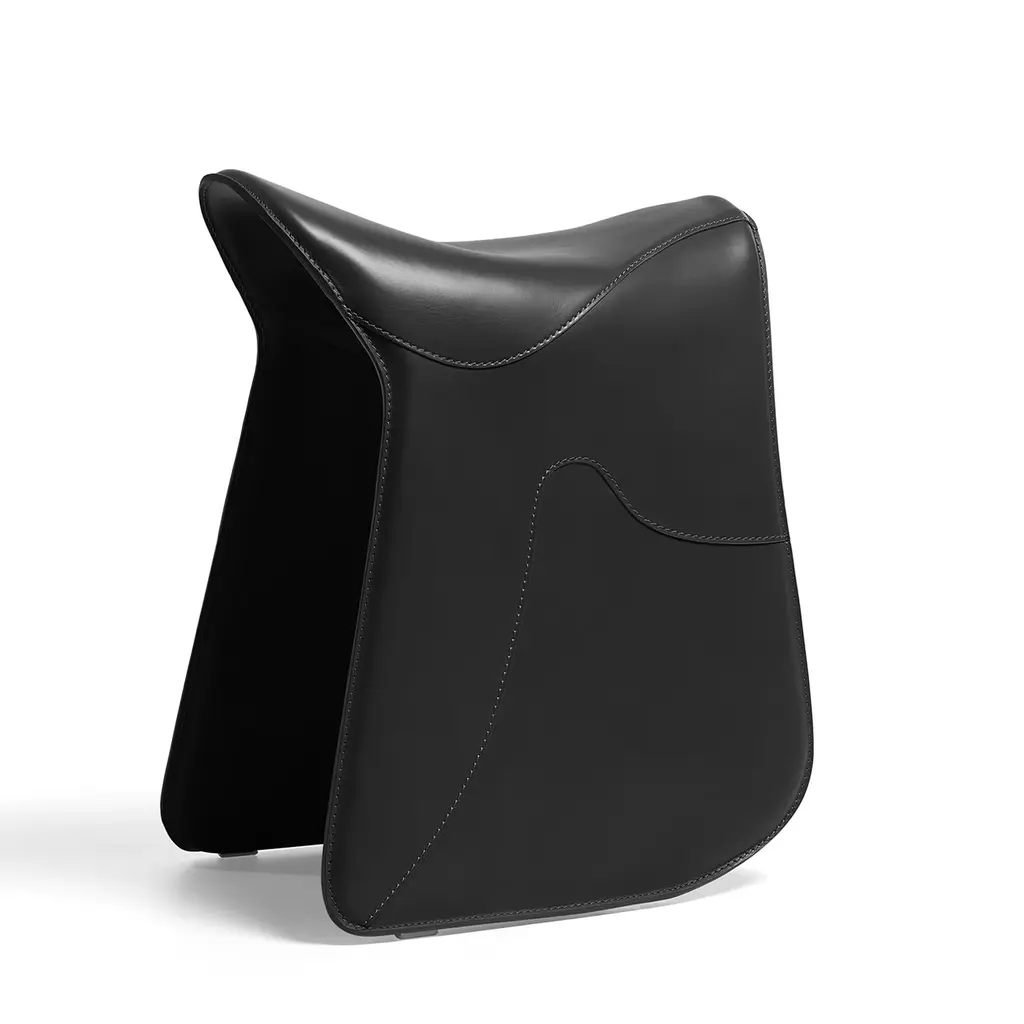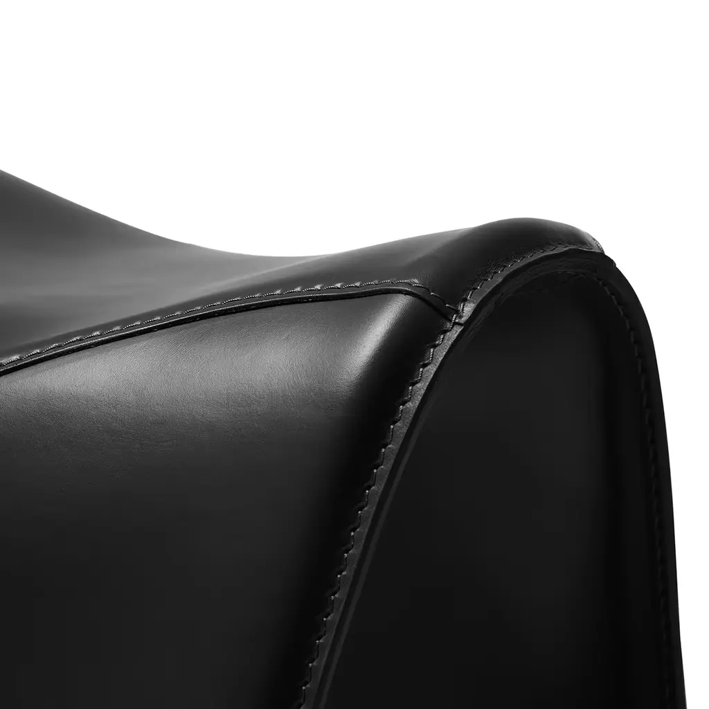 An artful take on horseback saddles, this stool was designed to provide a comfortable seating experience while playing a precious evocative function. Its sleigh structure in curved steel is luxuriously enveloped by a black cover in full-grain leather, the smooth look only interrupted by wavy stitching details deftly sewn by hand. Designed to foster correct posture, it will be an opulent addition to a modern desk and office setup.
