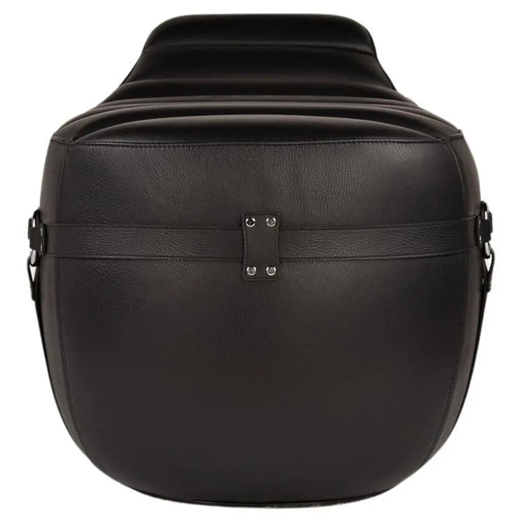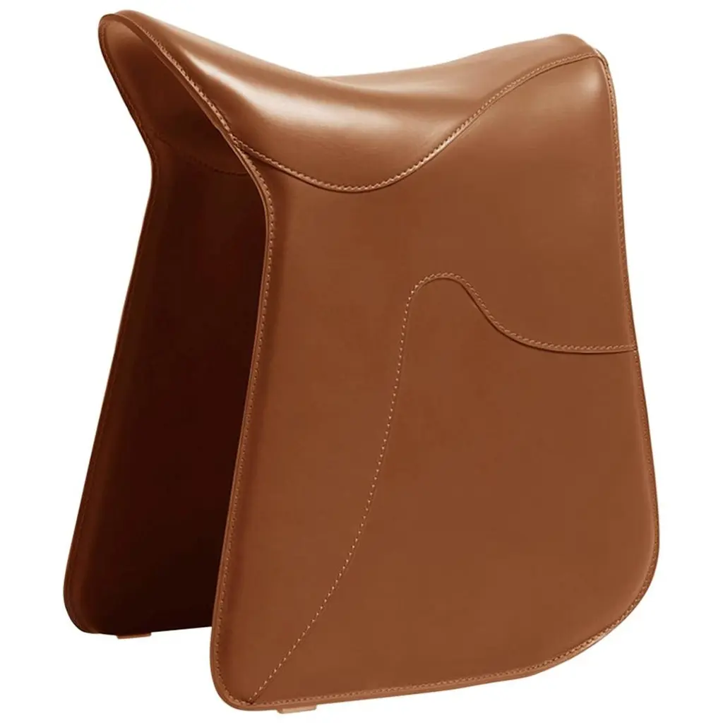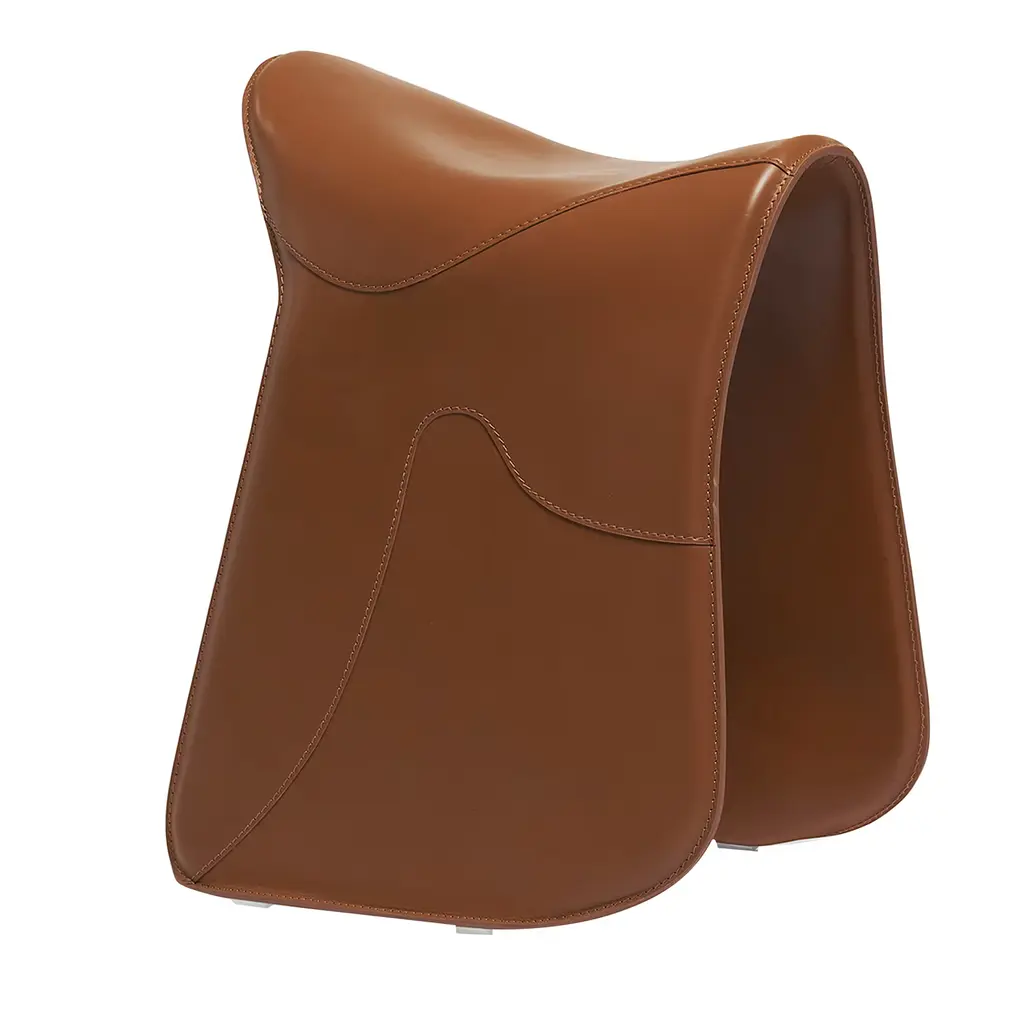 An artful take on horseback saddles, this stool was designed to provide a comfortable seating experience while playing a precious evocative function. Its sleigh structure in curved steel is luxuriously enveloped by a black cover in full-grain leather, the smooth look only interrupted by wavy stitching details deftly sewn by hand. Designed to foster correct posture, it will be an opulent addition to a modern desk and office setup.