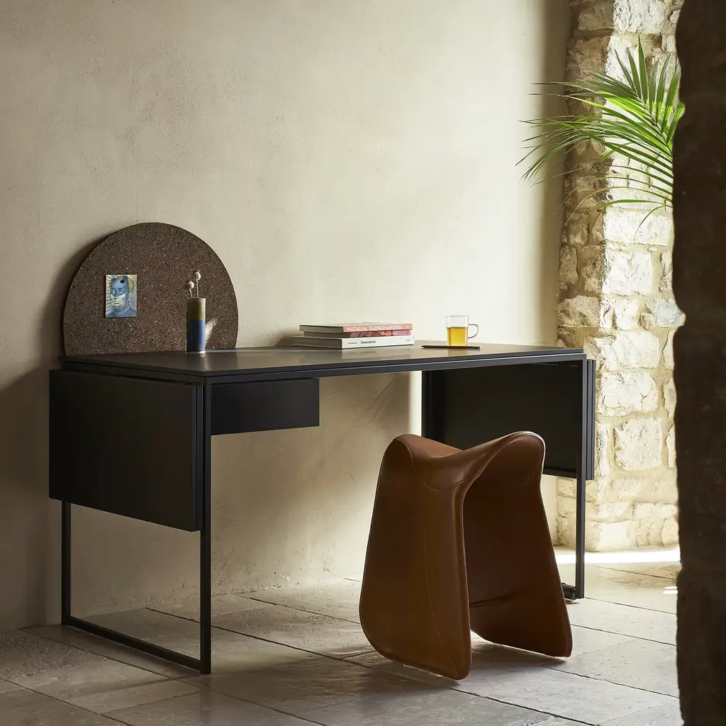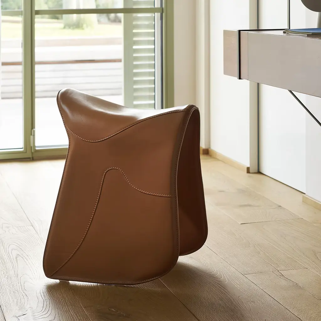 Inspired by horse saddles and luxuriously covered in full-grain brown leather with sinuous stitching details sewn by hand, this iconic stool by Raffaella Mangiarotti will make an eye-catching statement in any sophisticated modern home. The curved steel core is shaped in a sleigh design that allows for a specific inclination favoring the right posture. A version in black leather is also available, please check the Artemest catalog.