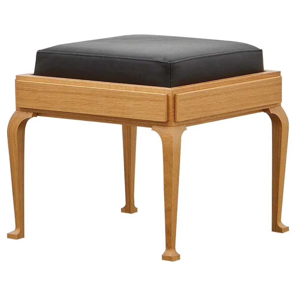 The PH Stool is perfectly proportioned to match the PH Dressing Table or stand-alone as a functional sculpture. The PH Stool is available in mahogany, black or natural oak. The mahogany can be covered with lamb nappa in red or green. The seat of the PH Stool is upholstered with luxurious aniline leather, available in five different colours: walnut, mocca, black, Indian red or un-dyed.