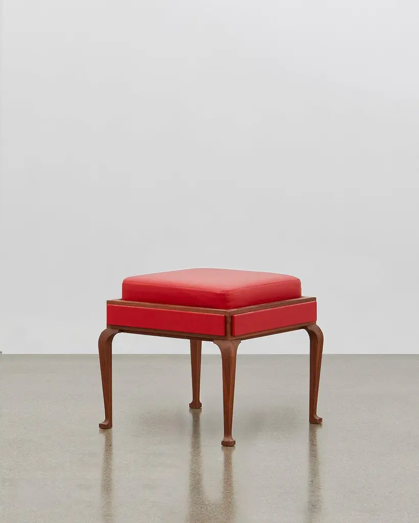 Ph Stool, Wood Legs, Mahogany Veneer, Red Lamb Leather On Panels And Seat
