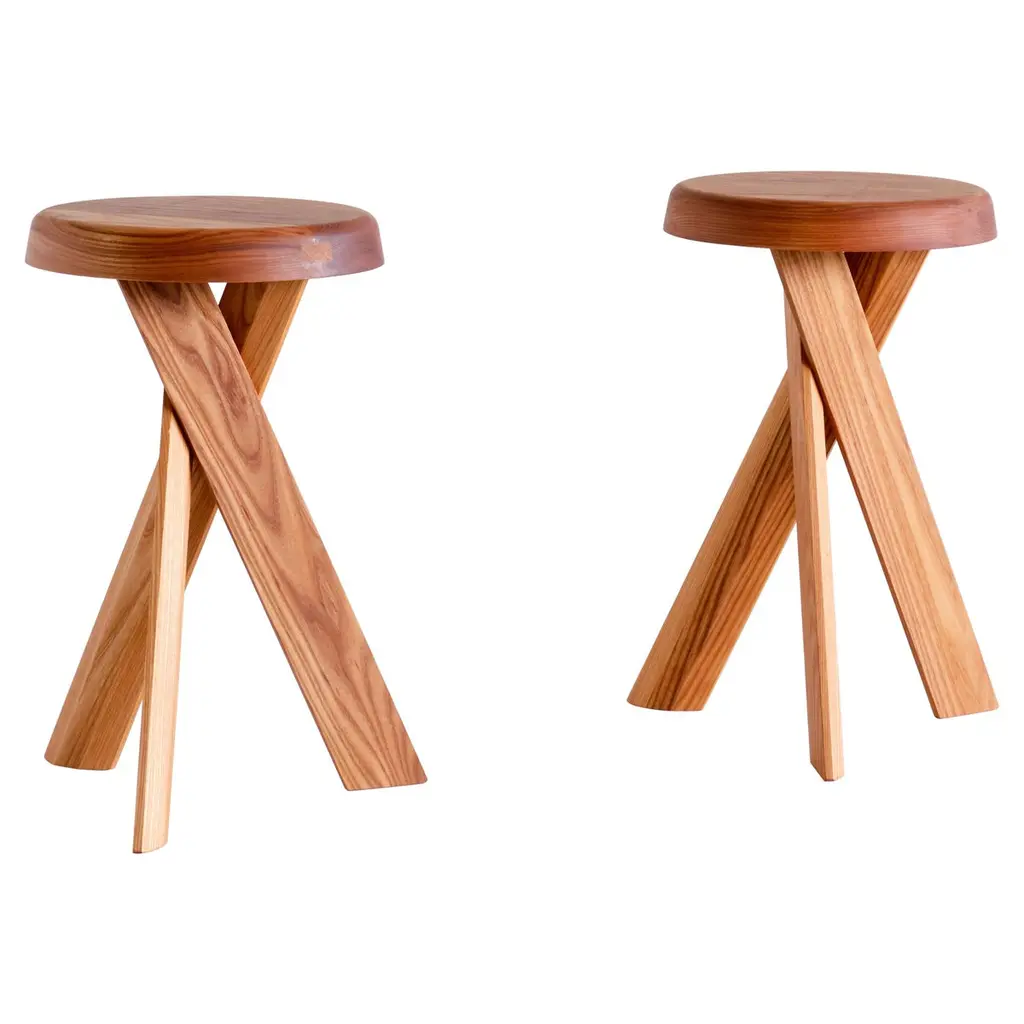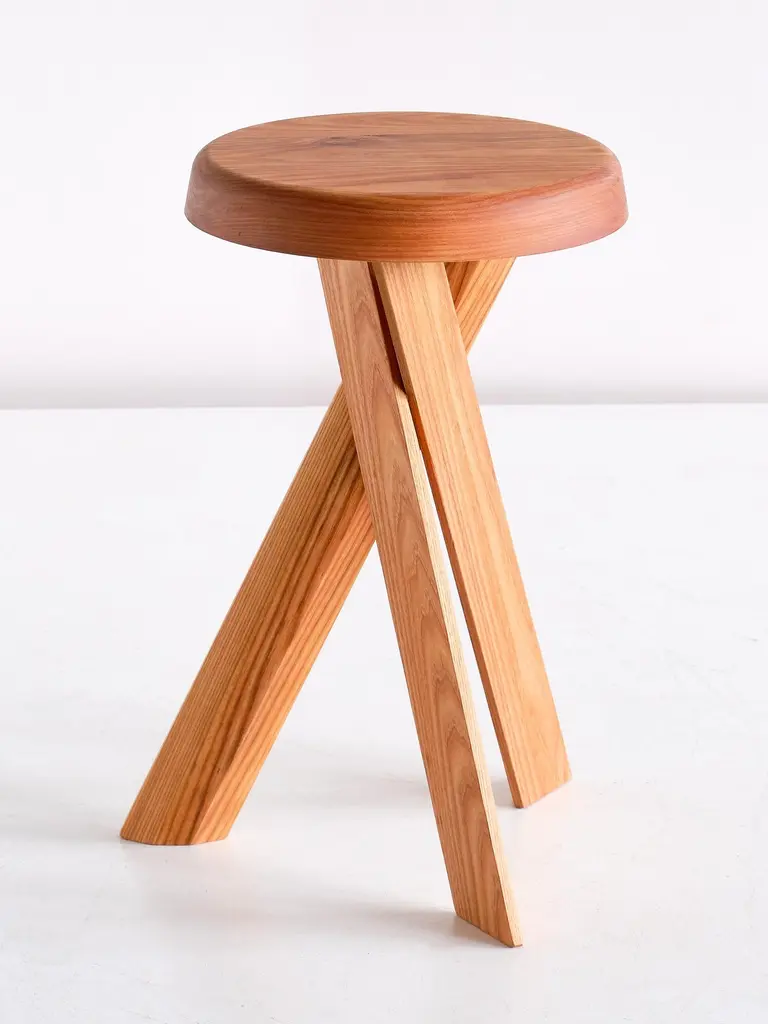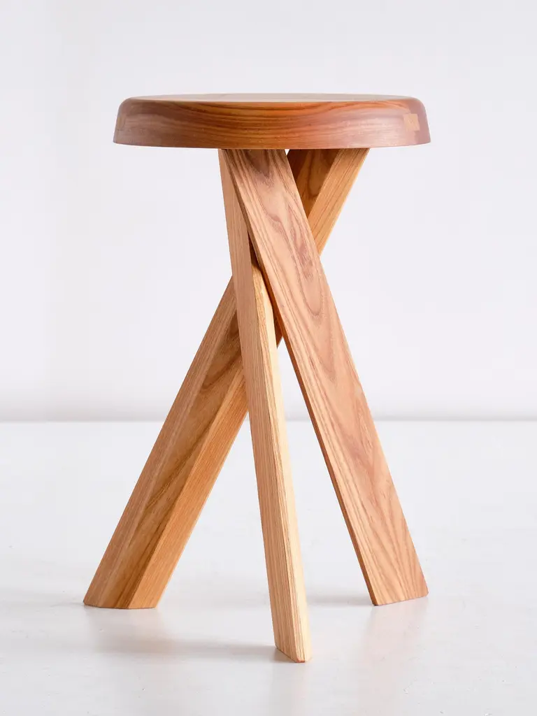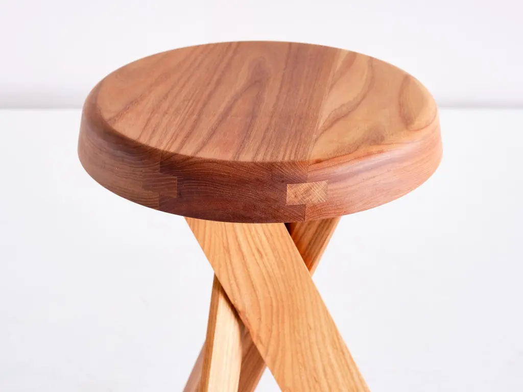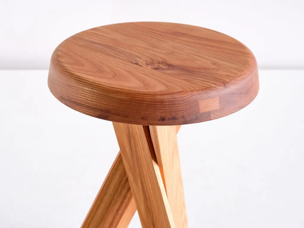 This striking three-legged stool is the model S31 designed by Pierre Chapo in 1974. The cross legged base and round seat are in solid elm wood. This stool also (could work) works well as a small side table.We have two pieces in stock available for immediate shipment. Each stool is completely unique, so please note that the exact wood grain of the top and legs may differ from stool to stool. Please contact us for pictures of the exact stools in stock.This new stool was made by Chapo Creation, now run by Pierre Chapo's son and grandson. Based in Southern France, this artisanal company produces the official reissues of Chapo's designs. All pieces are hand made, using the same materials and techniques as the earlier productions (types of elm wood as the earlier productions). Each piece is stamped.We also have a slightly lower version of this model available as can be seen in the last picture of the listing.Measurements:Diameter seat: 33 cm / 12.99 inchesDiameter legs: 38.5 cm / 15.16 inchesHeight: 55 cm / 21.65 inches
