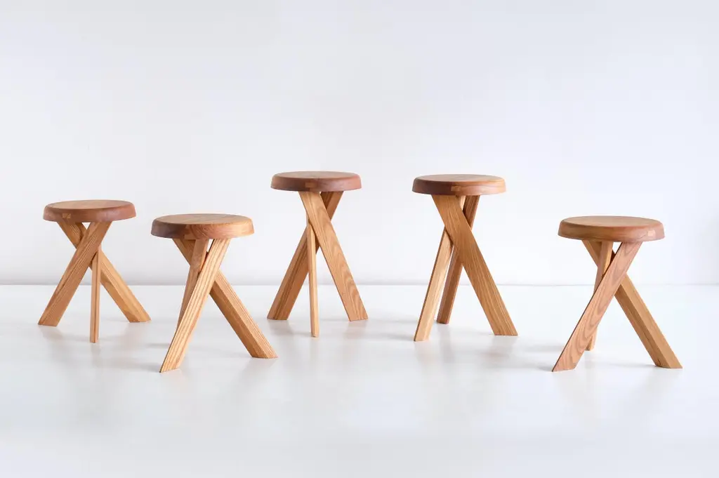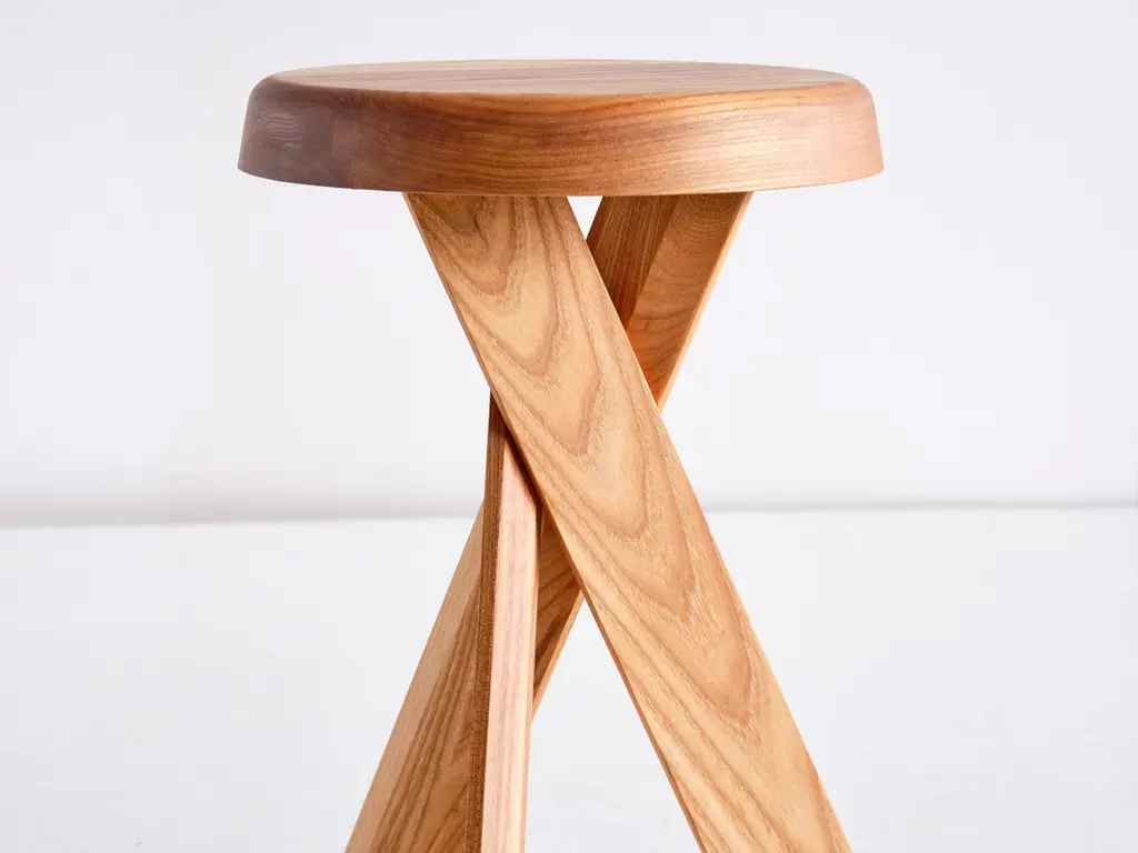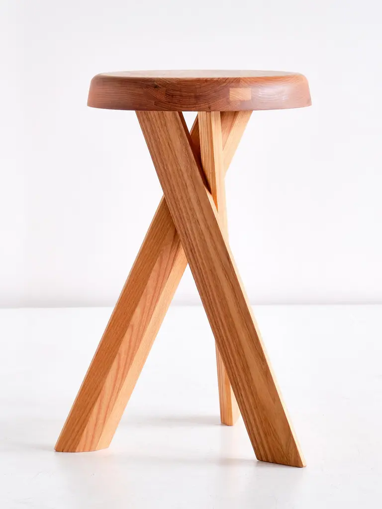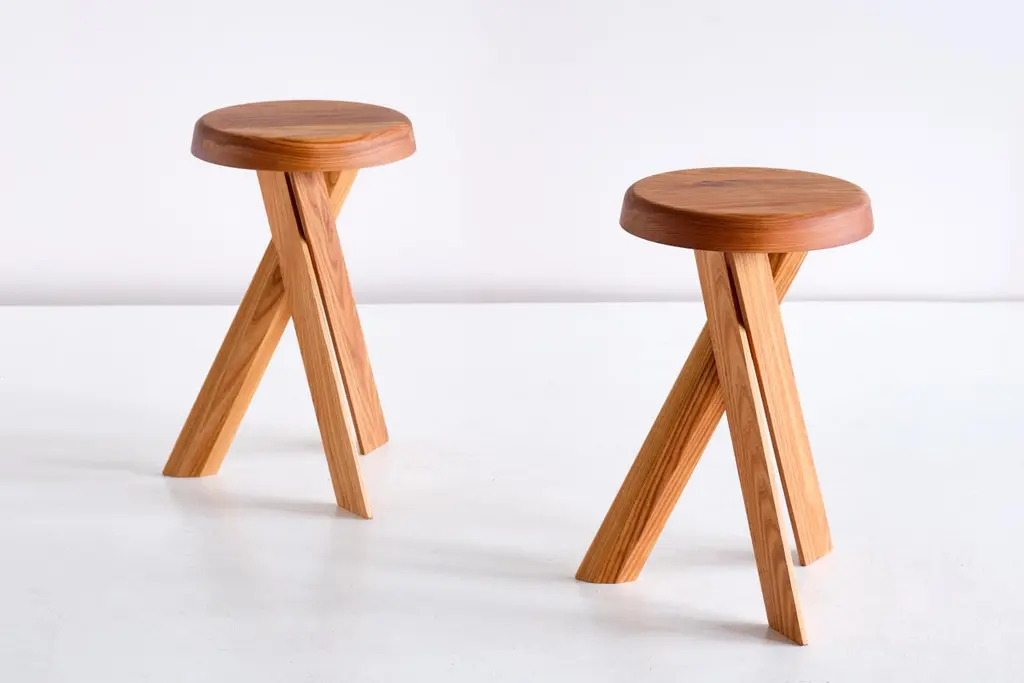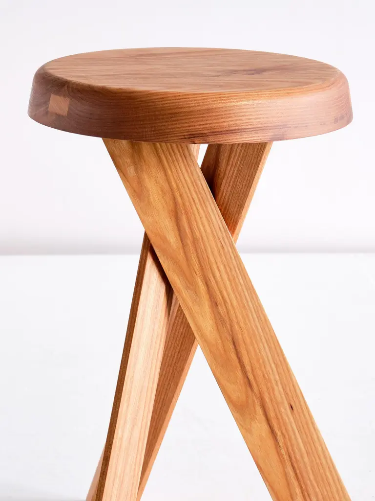 This striking three-legged stool is the model S31 designed by Pierre Chapo in 1974. The cross legged base and round seat are in solid elm wood. This stool also (could work) works well as a small side table.We have two pieces in stock available for immediate shipment. Each stool is completely unique, so please note that the exact wood grain of the top and legs may differ from stool to stool. Please contact us for pictures of the exact stools in stock.This new stool was made by Chapo Creation, now run by Pierre Chapo's son and grandson. Based in Southern France, this artisanal company produces the official reissues of Chapo's designs. All pieces are hand made, using the same materials and techniques as the earlier productions (types of elm wood as the earlier productions). Each piece is stamped.We also have a slightly lower version of this model available as can be seen in the last picture of the listing.Measurements:Diameter seat: 33 cm / 12.99 inchesDiameter legs: 38.5 cm / 15.16 inchesHeight: 55 cm / 21.65 inches