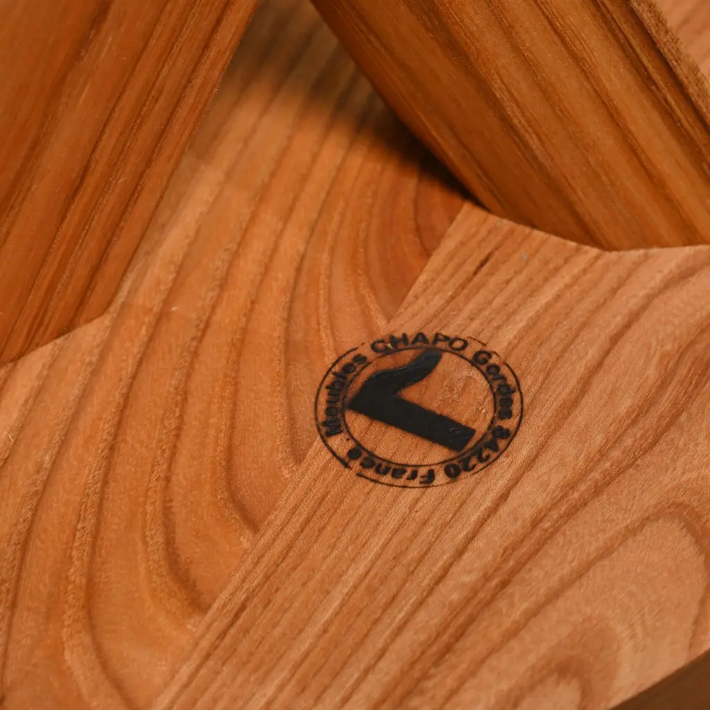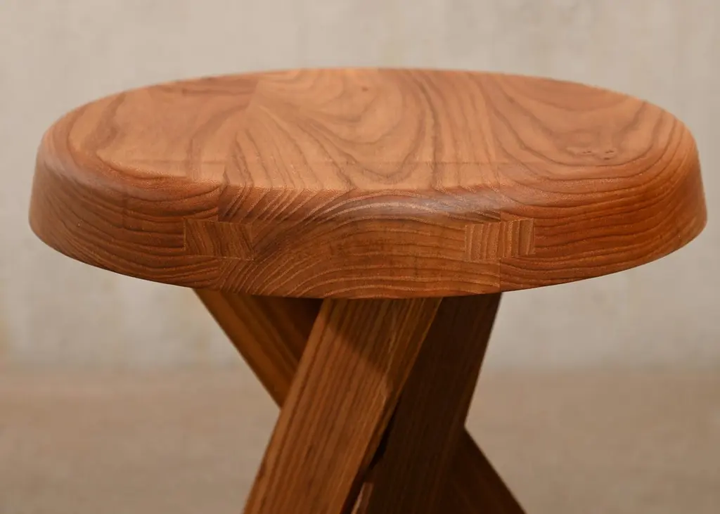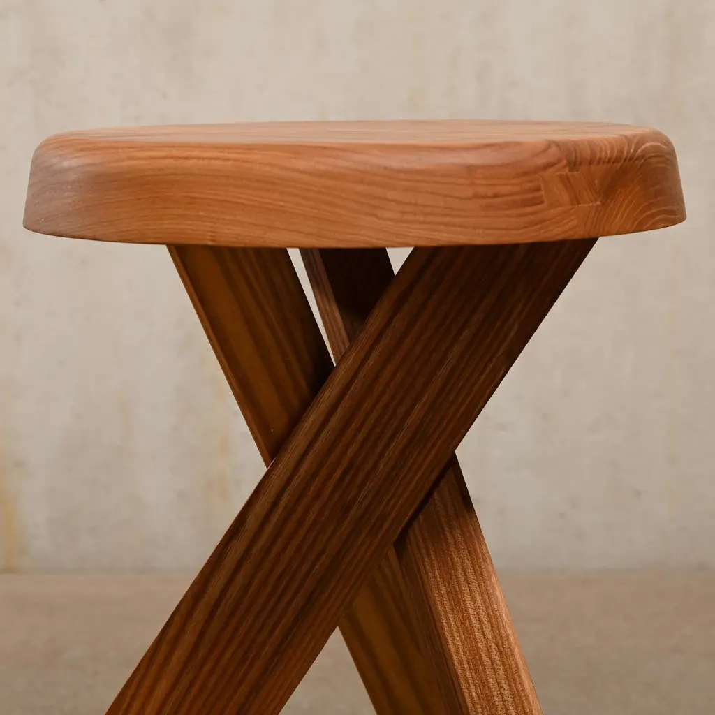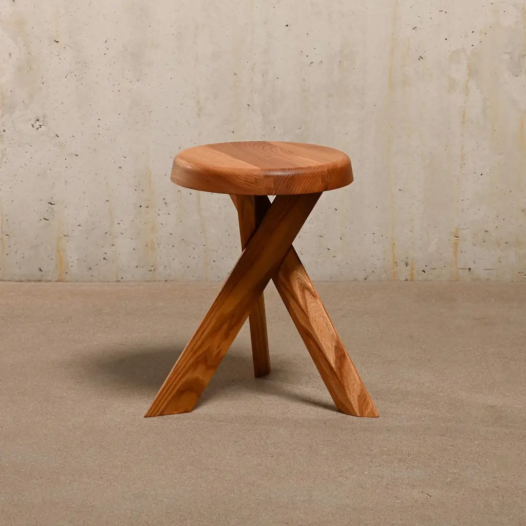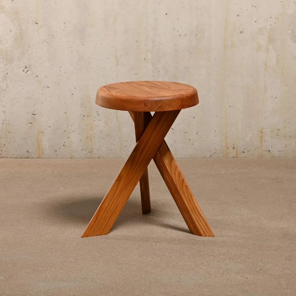 Stool S31 (model A) designed by Pierre Chapo around 1960 and manufactured by Chapo Création in France. Solid elmwood finished in naturel oil. Excellent original condition and signed by manufacture stamp.The wood drawing and grain of the stool that will be delivered may differ from the image shown in this listing. Contact us iif you would like to receive photos of the stools in stock. This stool can also be ordered in solid oak and / or in three different heights : 45, 55 and 73 cm.Currently 4 stools in stock, but If not in stock the lead time is ± 3 weeks. Please contact is advance for time sensitive orders.Pierre Chapo was born in a family of craftsmen. After his regular studies, he worked in the workshop of a navy carpenter. He graduated as architect in 1958 from the Ecole Nationale Supérieure des Beaux-Arts in Paris, after having travelled in the United States and in Europe. He opened his own workshop first in Clamart as well a gallery in Paris. Chapo's work was inspired by Charlotte Perriand and Jean Prouvé. Ten years later he settled down in Gordes, where he based the Société Chapo. He then dedicated himself mainly to his work as a carpenter and a cabinetmaker and gave a series of lectures about his great passion, wood.
