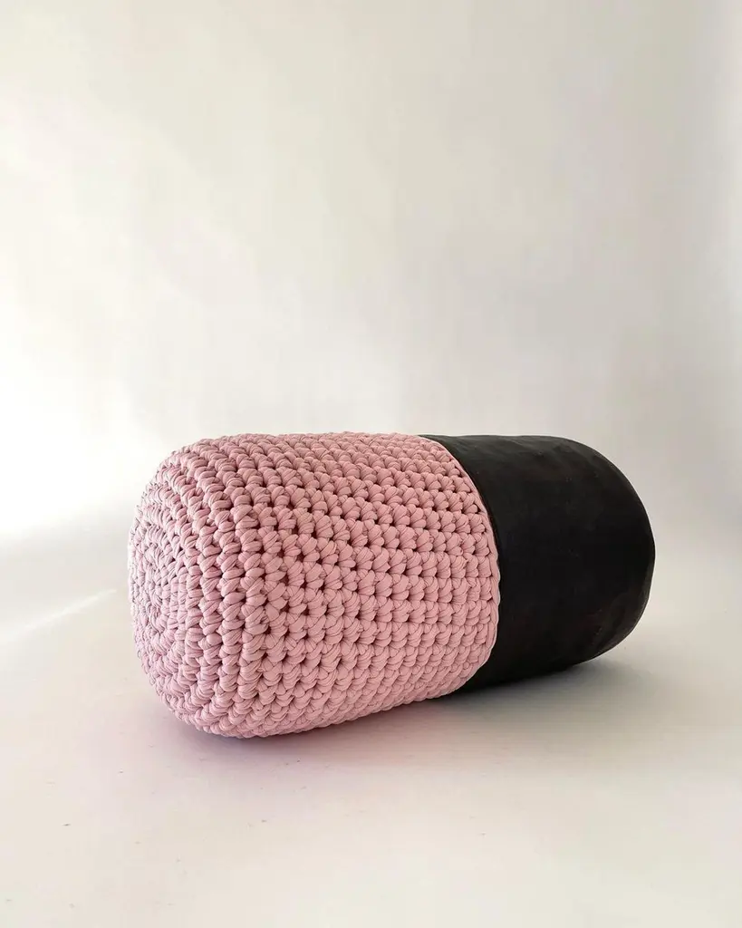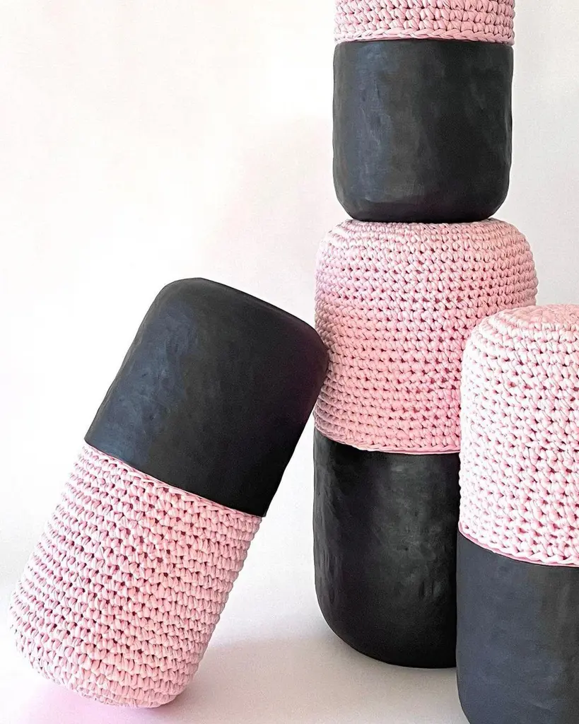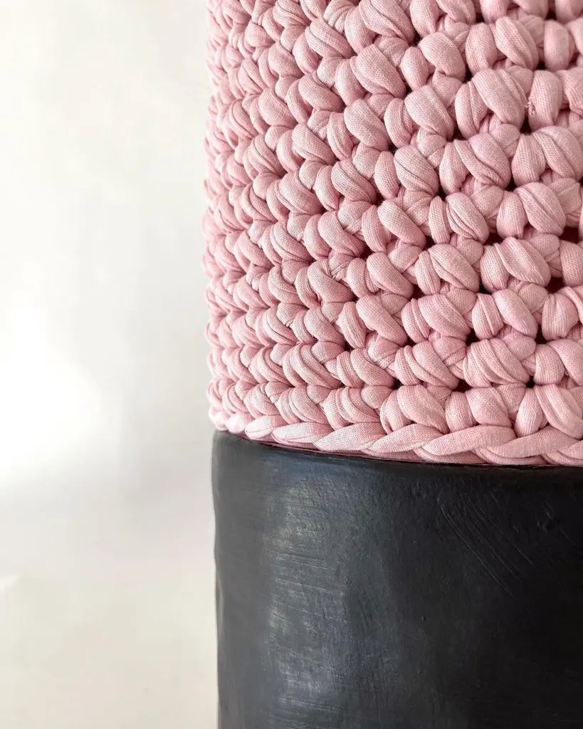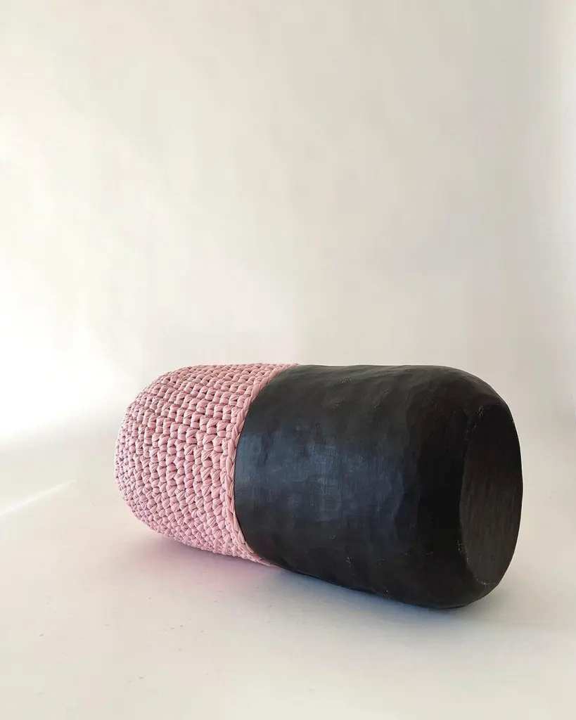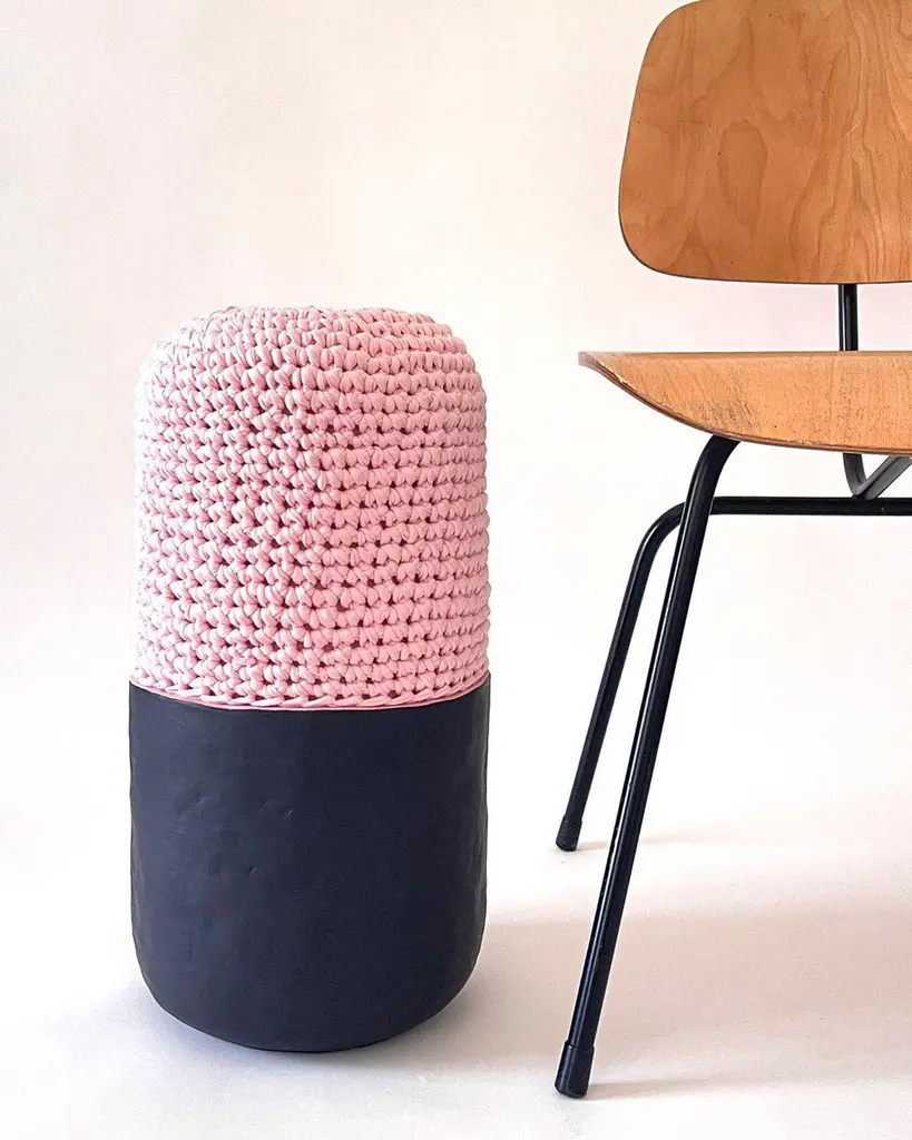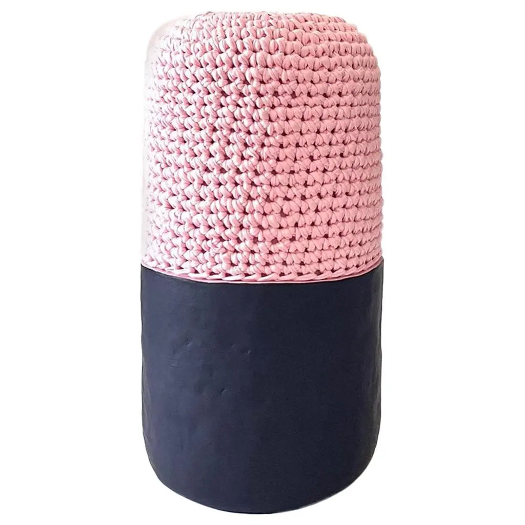 Pill Stool by Meg MorrisonDimensions: D 25 x H 47 cm (approximate measurements)Materials: Stoneware, textile mill remnants.This piece can be used as a side table, stool or simply be a sculpture. It is handcrafted from stoneware and reclaimed textile mill remnants. All pieces are hand stitched from sustainable materials.Meg Morrison is an artist in Richmond, Virginia currently working in ceramics. Meg holds an MFA in graphic design from Virginia Commonwealth University. Her work in the field of design developed her attention to detail, color and restraint. Years spent on the practice of woodturning taught her hands the mastery of a curve. Ceramics now opens up her work to a larger scale. Her goal is to craft simple and bold pieces to complement fresh modern interiors.Meg hand builds all of her pieces through a process called coil building. Years spent practicing woodturning taught her hands the mastery of a curve. Her work as a graphic designer informs the bold yet simple color palette. The craft of making these pieces brings her happiness.