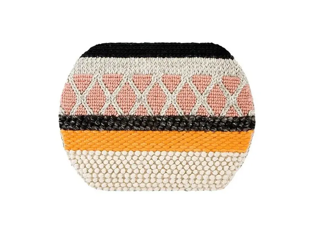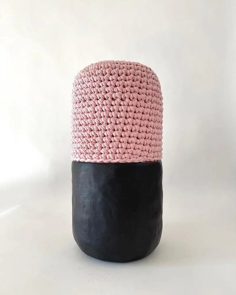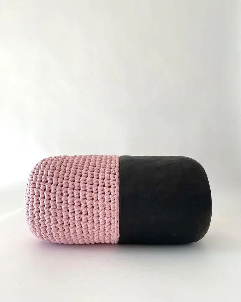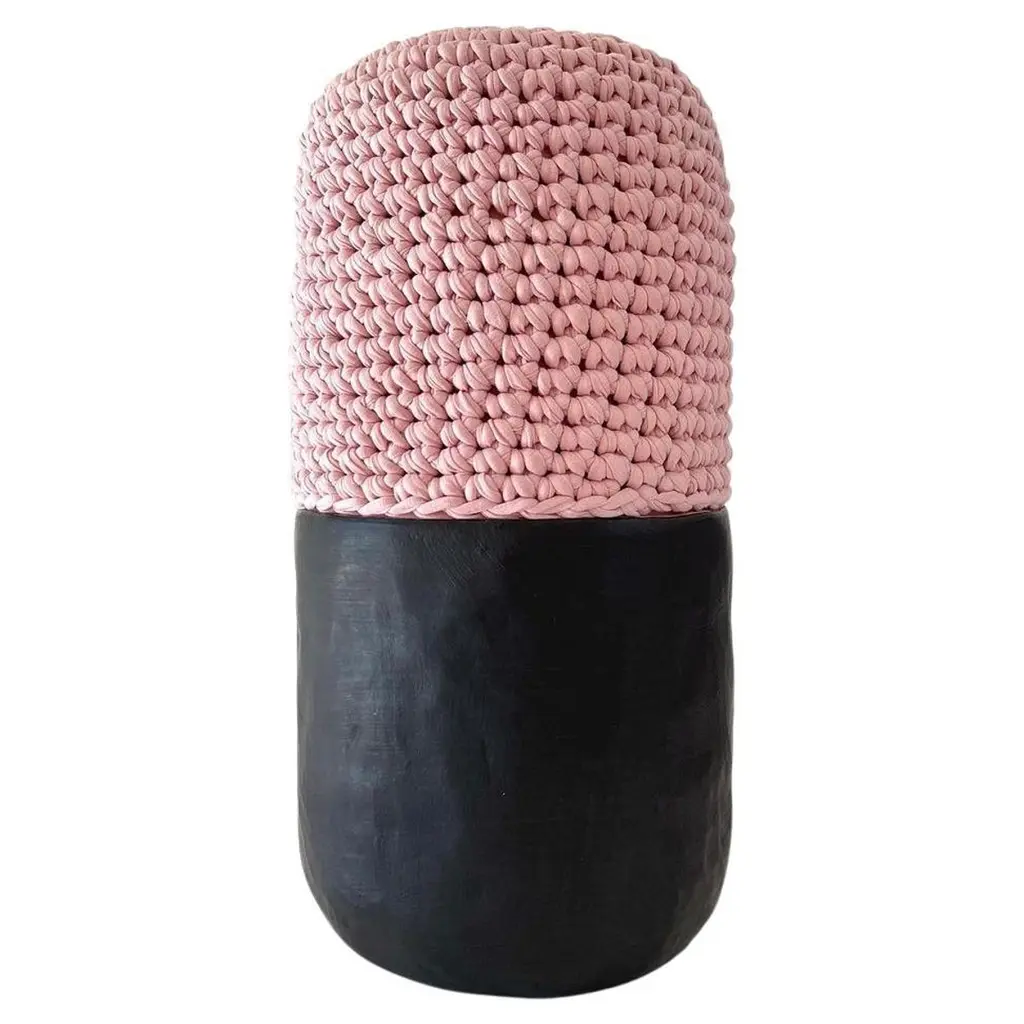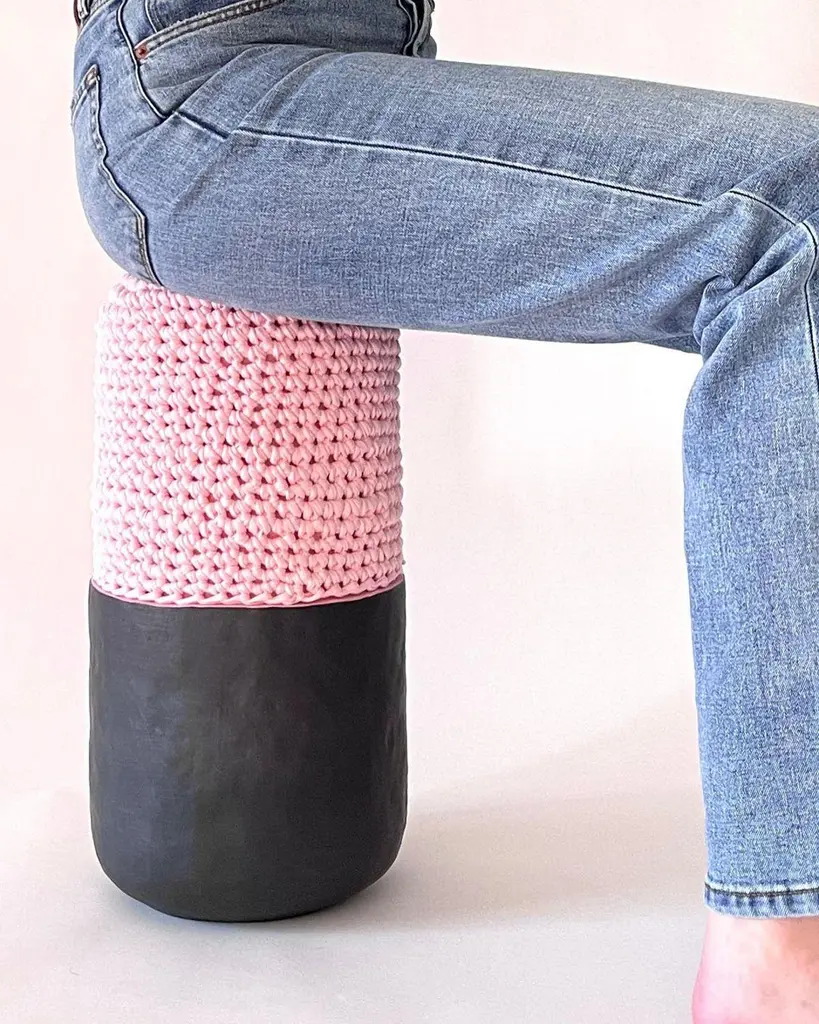 Pill XL Stool by Meg MorrisonMaterials: Stoneware, textile mill remnants.Dimensions: D 55 x H 31 cm (approximate measurements)This piece can be used as a side table, stool or simply be a sculpture. It is handcrafted from stoneware and reclaimed textile mill remnants. All pieces are hand stitched from sustainable materials.Meg Morrison is an artist in Richmond, Virginia currently working in ceramics. Meg holds an MFA in graphic design from Virginia Commonwealth University. Her work in the field of design developed her attention to detail, color and restraint. Years spent on the practice of woodturning taught her hands the mastery of a curve. Ceramics now opens up her work to a larger scale. Her goal is to craft simple and bold pieces to complement fresh modern interiors.Meg hand builds all of her pieces through a process called coil building. Years spent practicing woodturning taught her hands the mastery of a curve. Her work as a graphic designer informs the bold yet simple color palette. The craft of making these pieces brings her happiness.