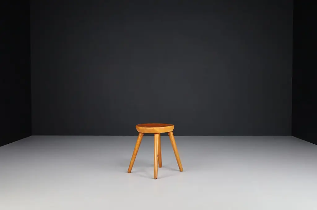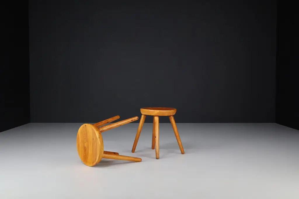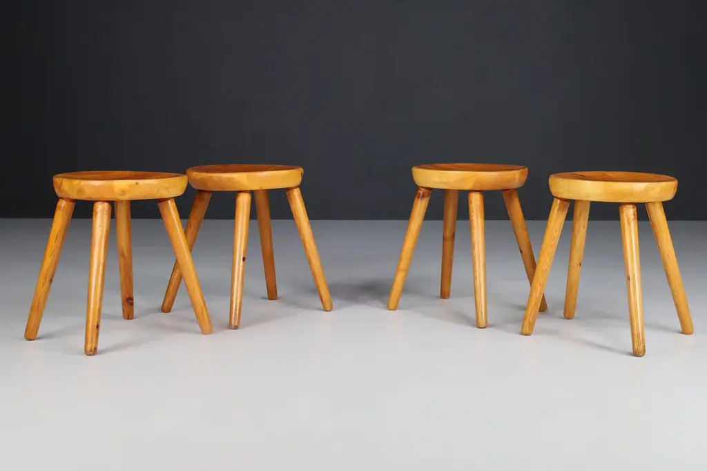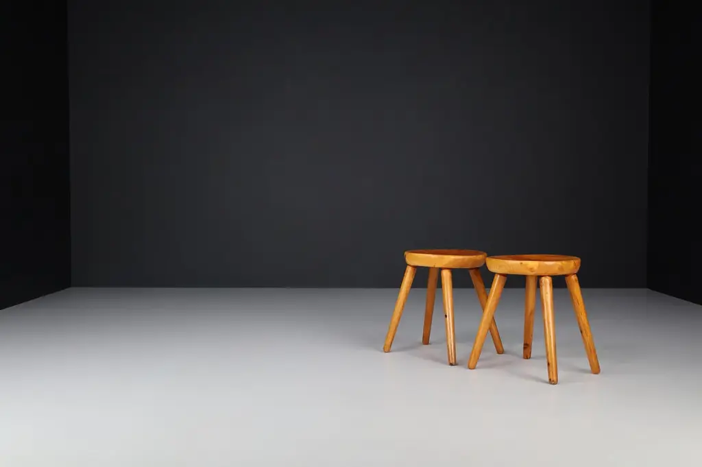Pinewood French stools in the style of Charlotte Perriand France, 1950s.Collectable pine stools in the style of Charlotte Perriand were made in France in the 1950s. No screws or hardware are used on stools. Beautiful joinery and grain details. These solid pine stools show an incredible patina and are in excellent original condition. These unique stools would make an eye-catching addition to any interior, such as the living room, family room, screening room, or office. It also perfectly fits in a hospitality or corporate location like a boutique hotel lobby, cocktail bar, members club or luxury boutique.4 Available, priced per stool.DimensionsHeight: 45 cmWidth : 40 cmDepth: (36 cm)Seat height: (45 cm).