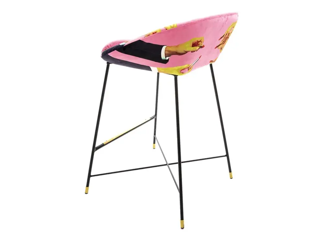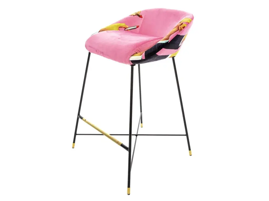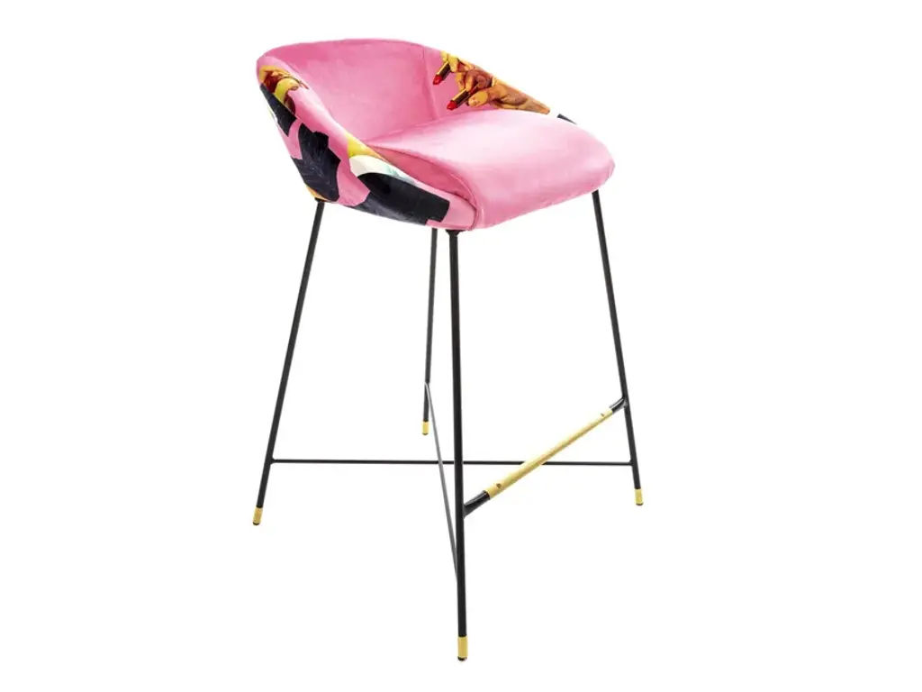 Pink Lipsticks is an high stool in fabric.The high stool is the last addition to the upholstered collection designed by TOILETPAPER. Fierce with its bold graphic, it’s the perfect model to add that touch of cool lounge bar to home.Material: Polyester, wood, polyurethane, metalWeight: 7.8 kg