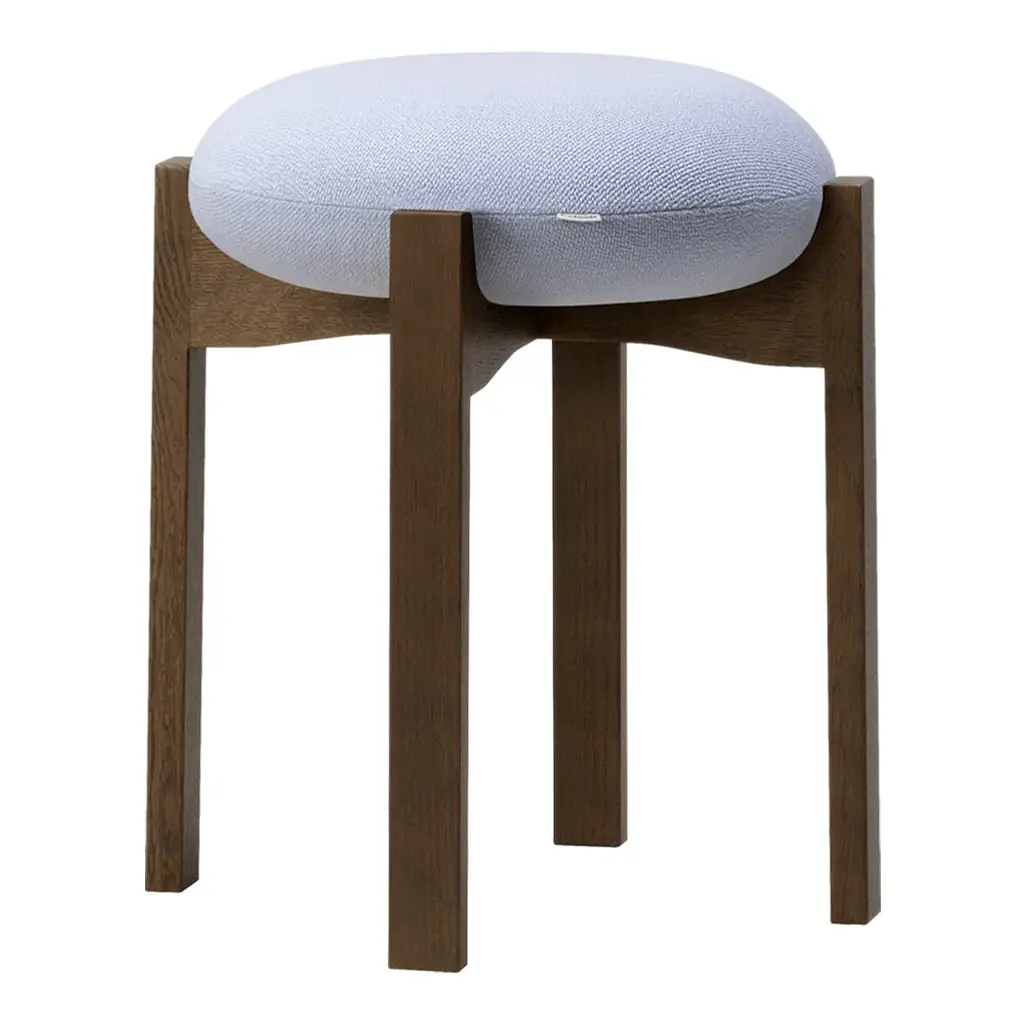 The sculptural Pioneer stools combine good seating comfort, functionality and a sculptural design language that elegantly combines the seat's soft and round design with the wooden frame's sensuality. The chair's simple, unique and distinctive combination of shapes and materials is a modern take on Scandinavian design that combines functionality with Bruun's recognisable sculptural minimalism. The four vertical legs of the wooden frame are united in a cross composition with elegant indentations, where the light, the upholstered seat cushion, is placed on top. In contrast, the detailed indentation on the underside completes the overall artistic impression. Stacks six stools on the floor.
