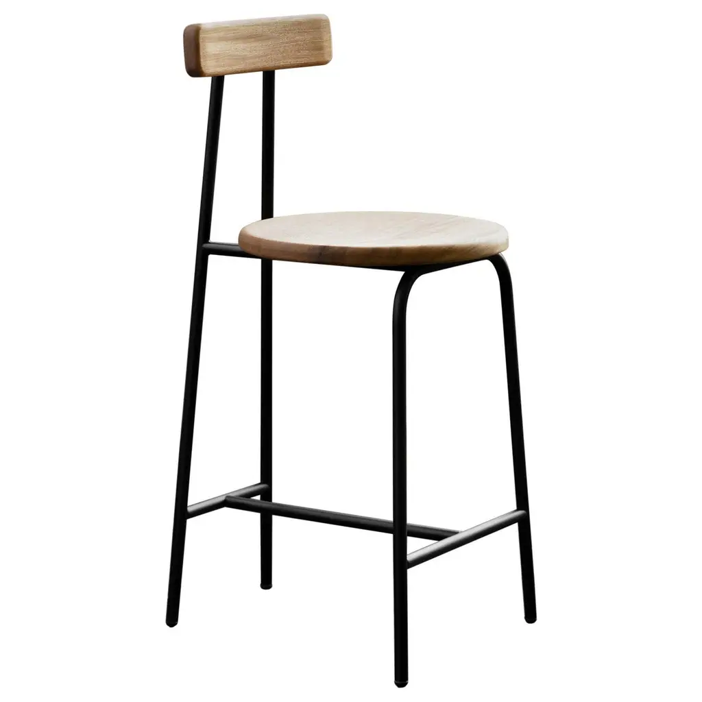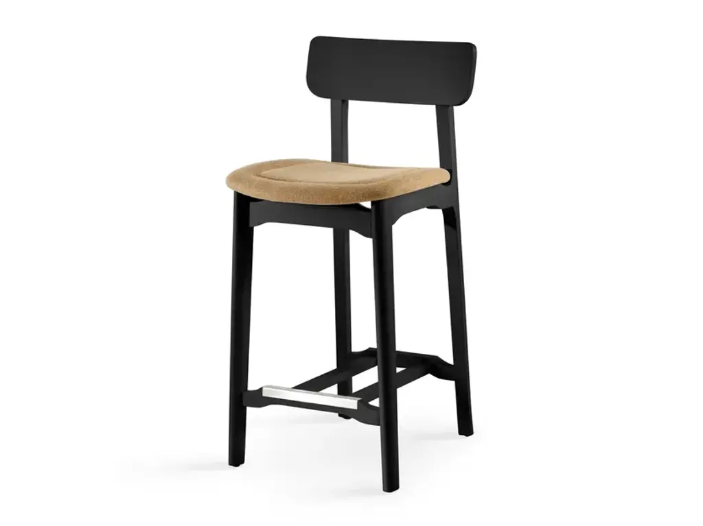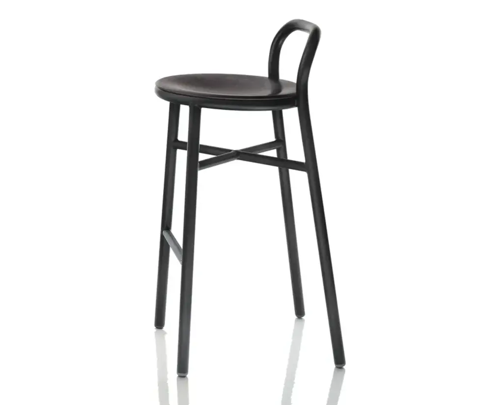 Stool with frame in aluminium tube painted in polyester powder. Seat in punched aluminium plate painted in polyester powder, or in beech plywood.Available in two heights.Versions for outdoor use available and flame retardant.