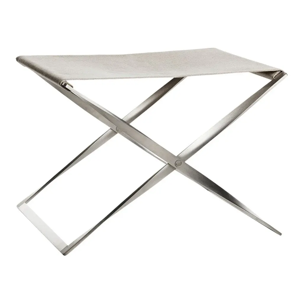 The PK91 folding stool designed by Poul Kjaerholm epitomizes his ongoing adaption of historical furniture categories into his oeuvre and arsenal of expressions. The source of inspiration for the PK91 is an ancient Egyptian folding stool that dates back to ca. 1500 BC. The designer's method of refining historical furniture types has again been put into play and the result is unmistakably a Kjaerholm classic, with the stool's minimalistic and elegant expression. The PK91 is part of the permanent collection at the Röhsska Museum in Gothenborg, in Sweden. The folding stool is available with a leather or canvas seat, with a base in satin-brushed stainless steel.