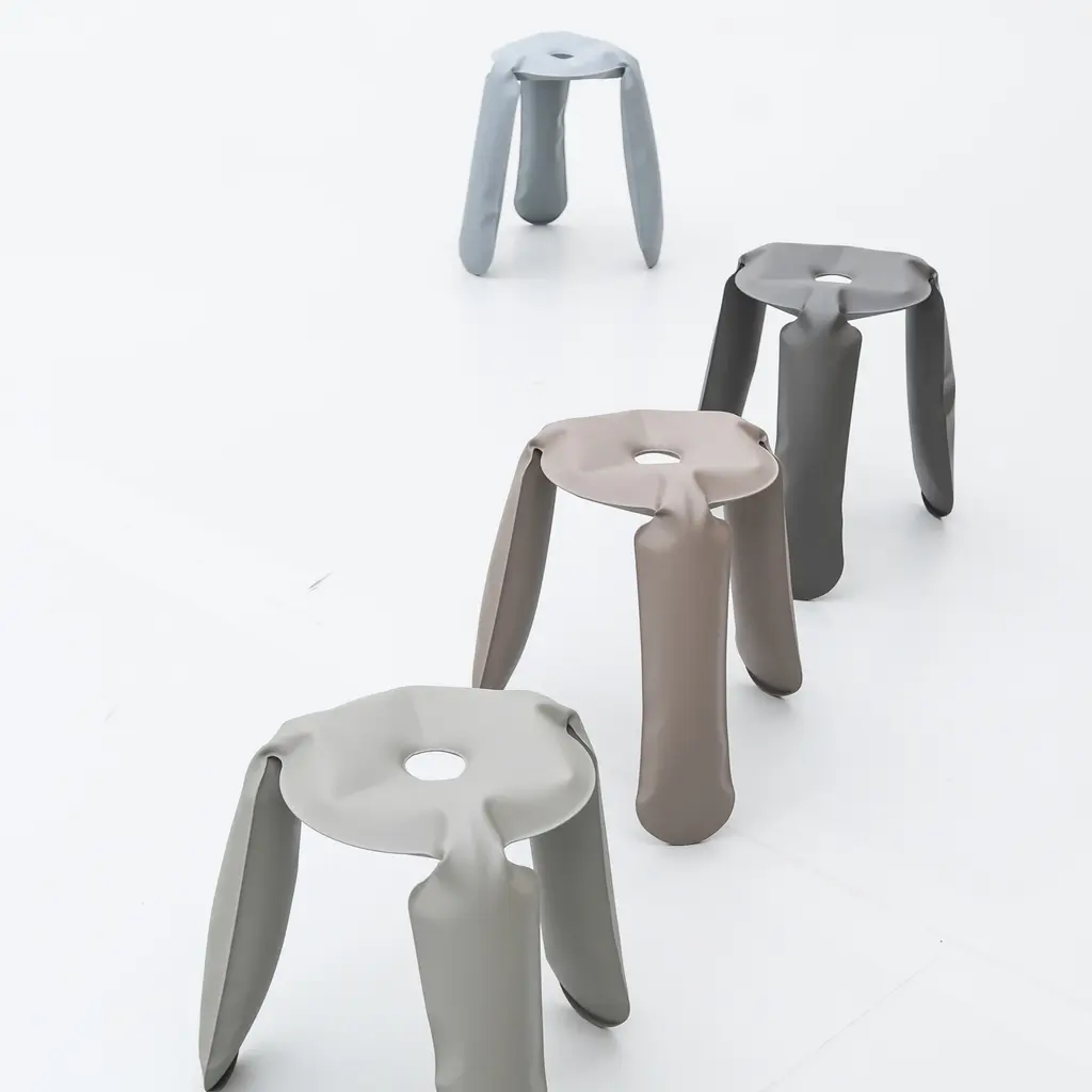 The Plopp Stools are made through a complex and innovative technology called ‘free inner pressure deformation’ – a manufacturing process developed by Polish designer and engineer Oskar Zieta, whereby flat, welded steel sheets are industrially inflated. This new process allows for the creation of complex, lightweight and weight-bearing forms while using only a minimal amount of material. Using this technology a new piece of steel furniture is created which in its form refers to plastic furniture but with the solidity and wearing qualities of steel. In an era of increasing global warming it makes sense to create products that do not break the day after the expiration of the guarantee certificate. Let’s go back making things that last.