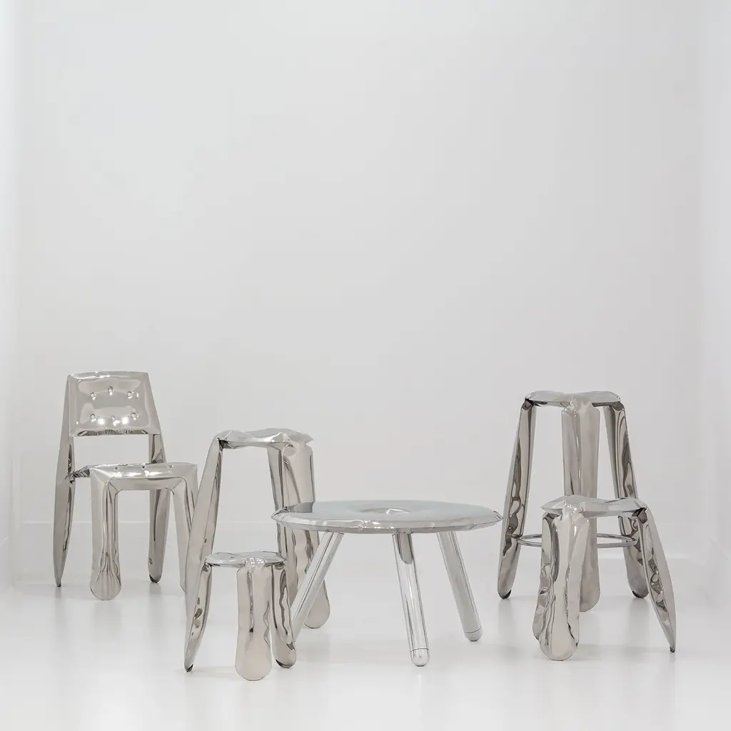 For sitting at the kitchen counter or just hanging out, this Plopp version is just the thing. A higher-seat variant on the head-turning original, the signature "swole" look is a result of the Zieta's astonishing FIDU process. Double sheets of very thin steel are inflated to 3D proportions under high air pressure. Lightweight, durable and, given the variables of the manufacturing technique, each one is fabulously one-of-a-kind.