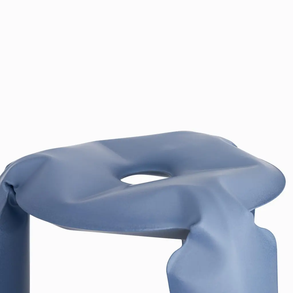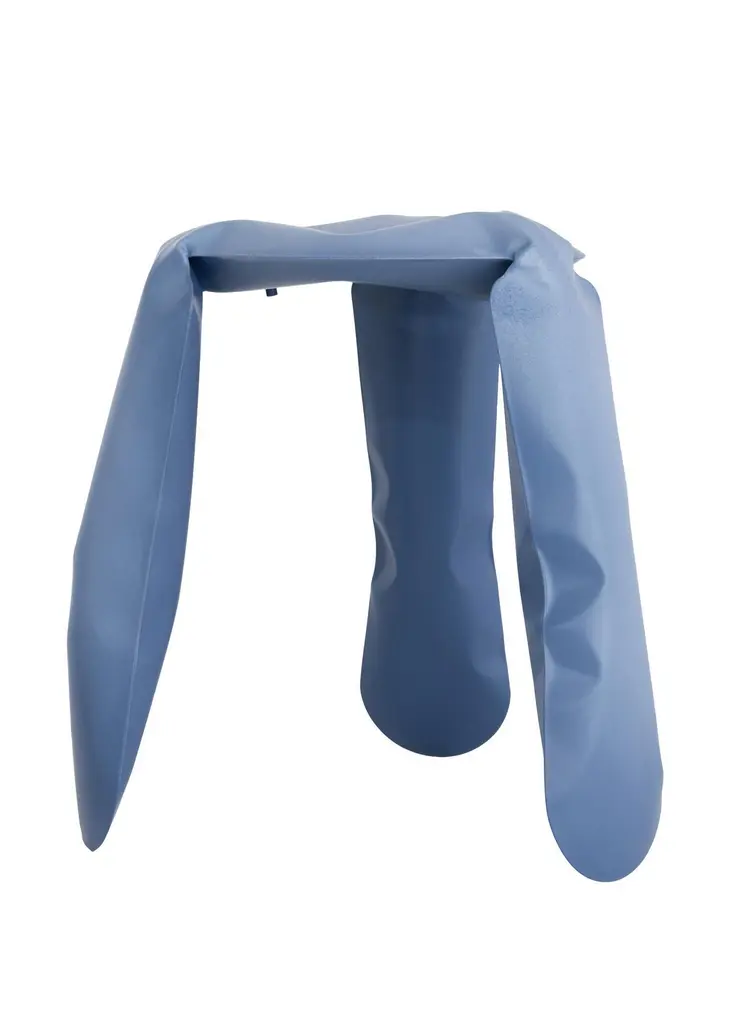 "Plopp" stool by ZietaBlue mattCandy collection.Standard size:50 cm high, 35 cm diameter. The PLOPP stool is a flagship of Zieta Studio and a symbol of Oskar Zięta’s research into the properties and possibilities of metal. The “Polish Air-Pumped Folk Object” proves how the artistic aspects of the design can be summarized in highly advanced engineering forms. Challenging the material is one of the fundamental areas of Zieta Studio’s explorations. Our prevailing focus is on form and its deformation, but lately we have been more and more attracted to colouring as shaping.The Cotton Candy collection is a certain manifesto of expressive matte. Shifting our classic high-polished Inox objects into matte shades unravelled unexplored chapters of a new interpretation of shine. The Cotton Candy Collection is a provocative twist on sensual perception. Candy-like impressions are achieved thanks to experiments with matte shades of powder coatings. This out-of-the-ordinary effect evokes carefree childhood memories that seem to smell like cotton candy.