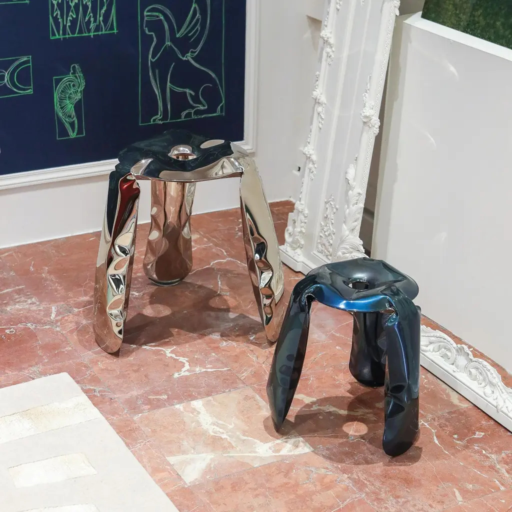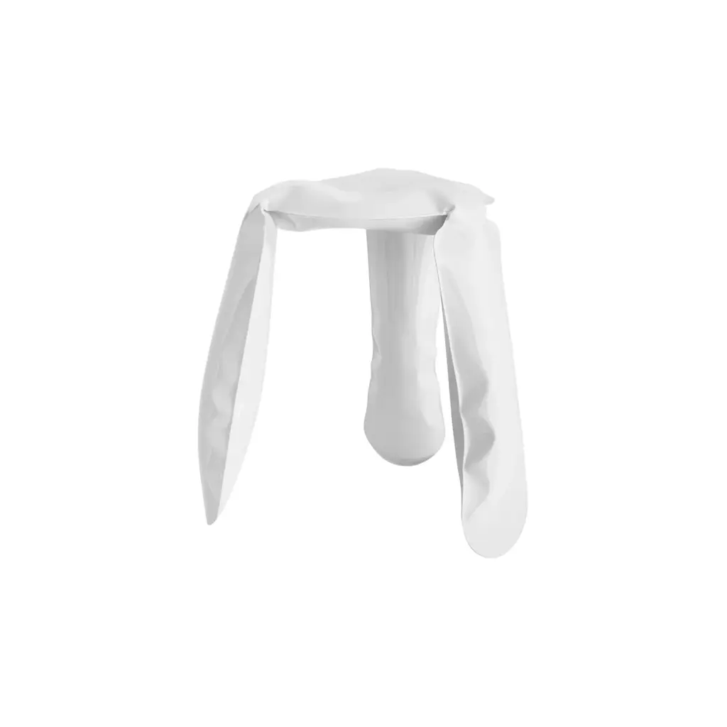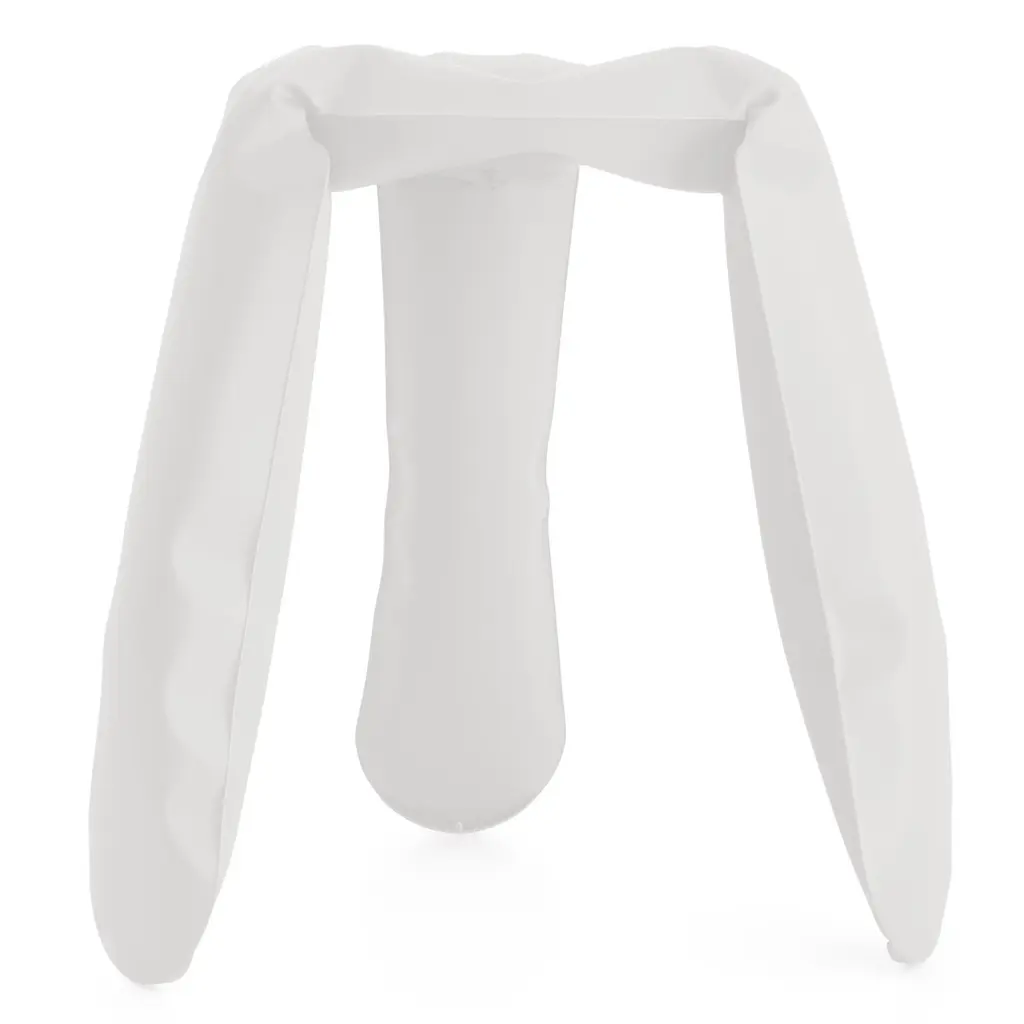 "Plopp" stool by ZietaWhite mattCandy collection.Standard size:50 cm high, 35 cm diameter. The PLOPP stool is a flagship of Zieta Studio and a symbol of Oskar Zięta’s research into the properties and possibilities of metal. The “Polish Air-Pumped Folk Object” proves how the artistic aspects of the design can be summarized in highly advanced engineering forms. Challenging the material is one of the fundamental areas of Zieta Studio’s explorations. Our prevailing focus is on form and its deformation, but lately we have been more and more attracted to colouring as shaping.The Cotton Candy collection is a certain manifesto of expressive matte. Shifting our classic high-polished Inox objects into matte shades unravelled unexplored chapters of a new interpretation of shine. The Cotton Candy Collection is a provocative twist on sensual perception. Candy-like impressions are achieved thanks to experiments with matte shades of powder coatings. This out-of-the-ordinary effect evokes carefree childhood memories that seem to smell like cotton candy.