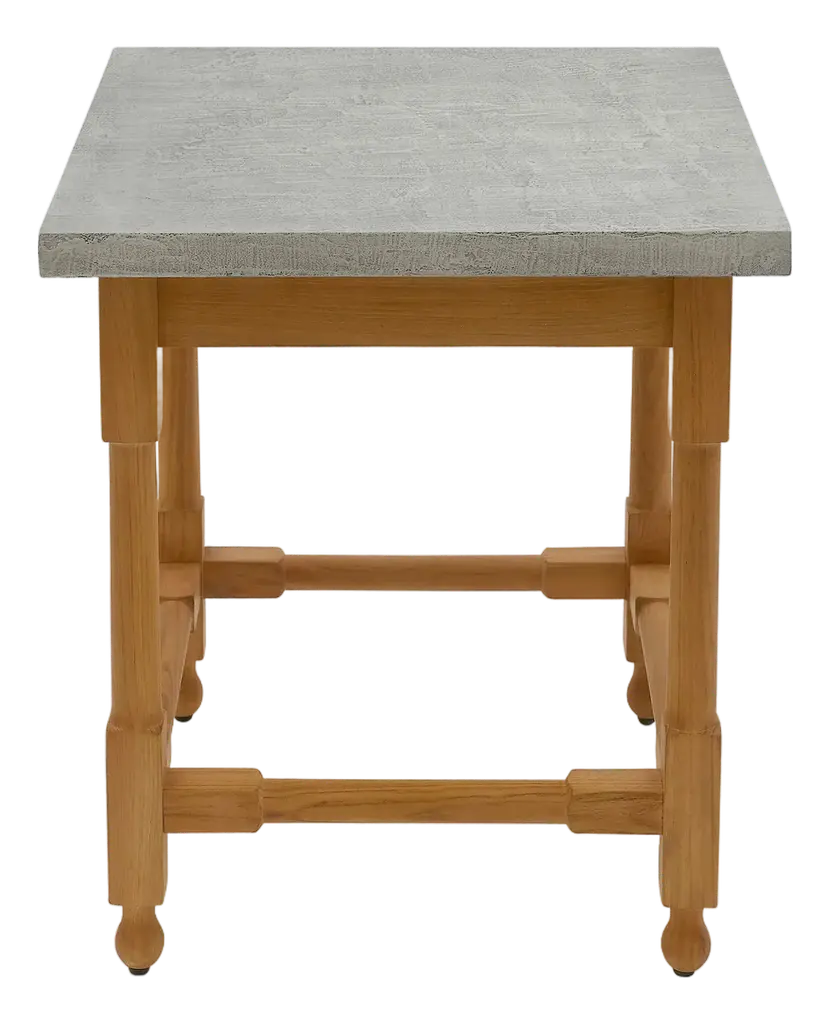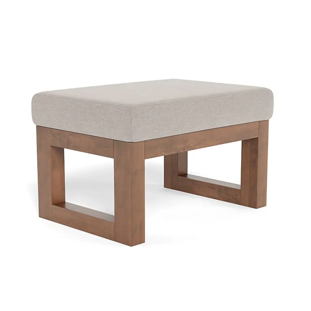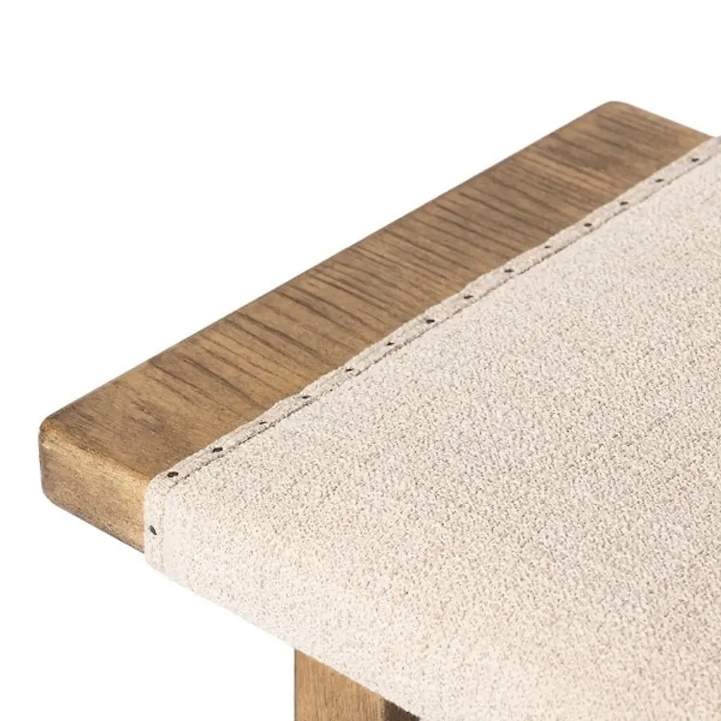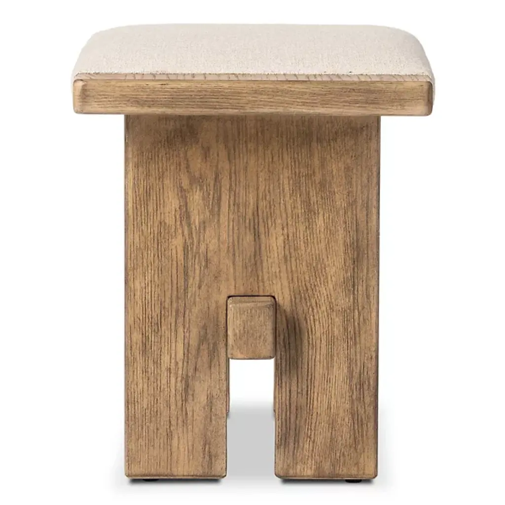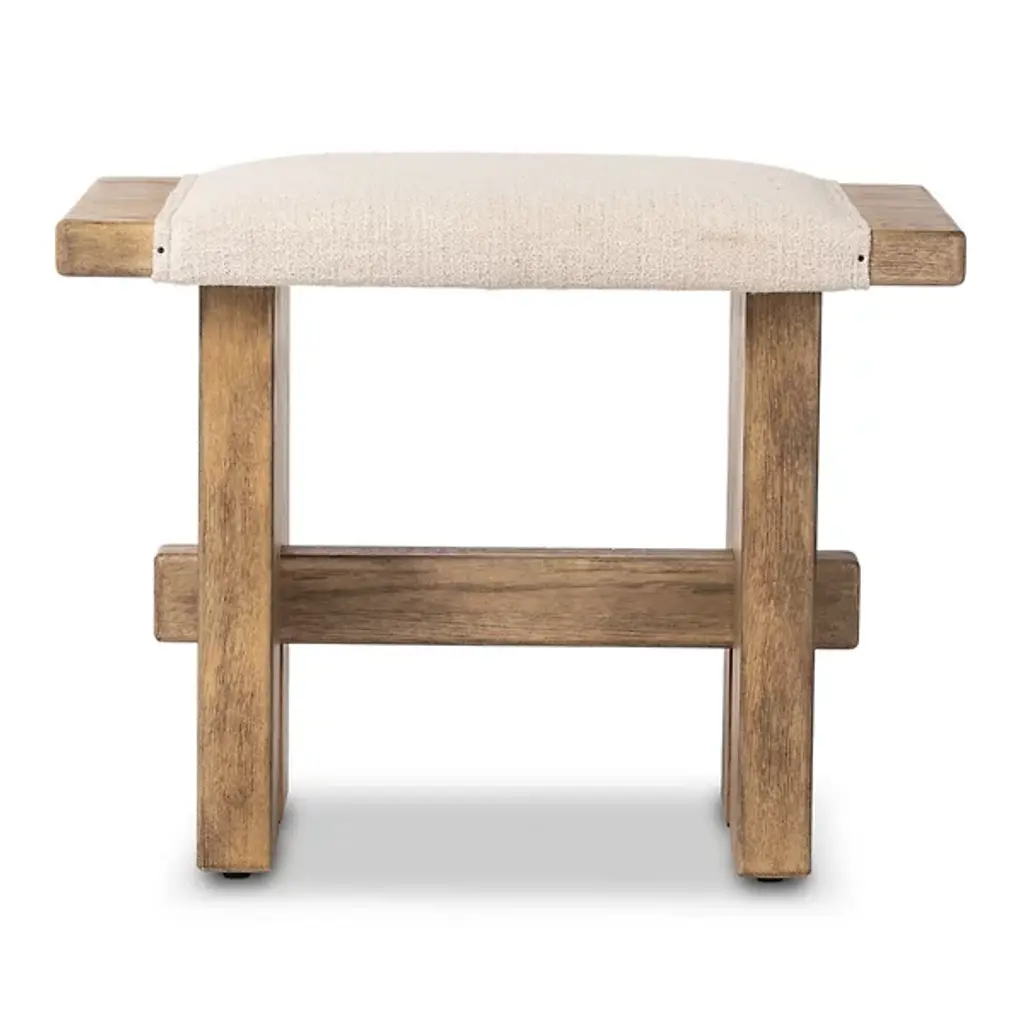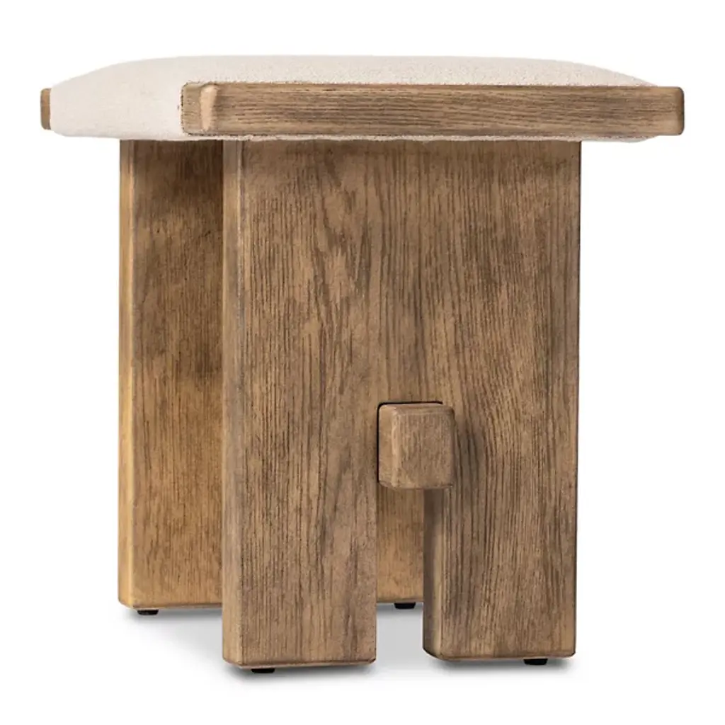 The Poe Accent Stool from Four Hands adapts the bench's farmhouse-inspired design into a more compact form that moves easily between rooms and functions. The same distressed oak veneer shows authentic wear patterns while the trestle construction maintains structural stability through traditional joinery methods. A pull-through stretcher connects the end supports, creating both visual interest and additional bracing for the frame. The upholstered top in high-performance fabric provides comfortable seating while resisting daily wear, making this stool both historically rooted and practical for modern use.