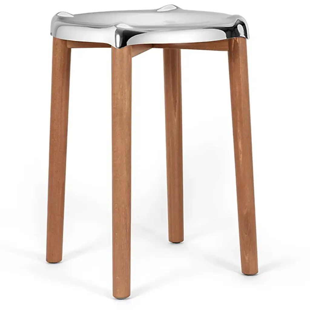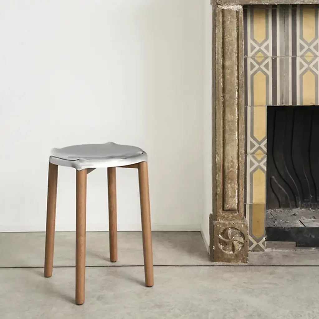 The Poêle Low Stool from Alessi offers a unique design with two contrasting elements: a sleek, lightweight wooden structure paired with a soft, organic steel seat. The dark finish on the wood, showcasing the natural grain, enhances the stool's sophisticated look and complements the steel shell. Versatile and functional, it serves as the perfect seating solution for last-minute guests or as a refined addition to the bathroom, blending elegance with practicality in any space.