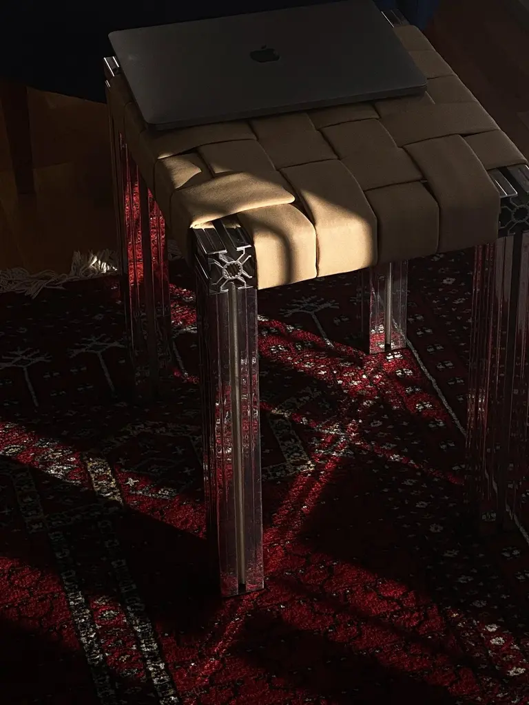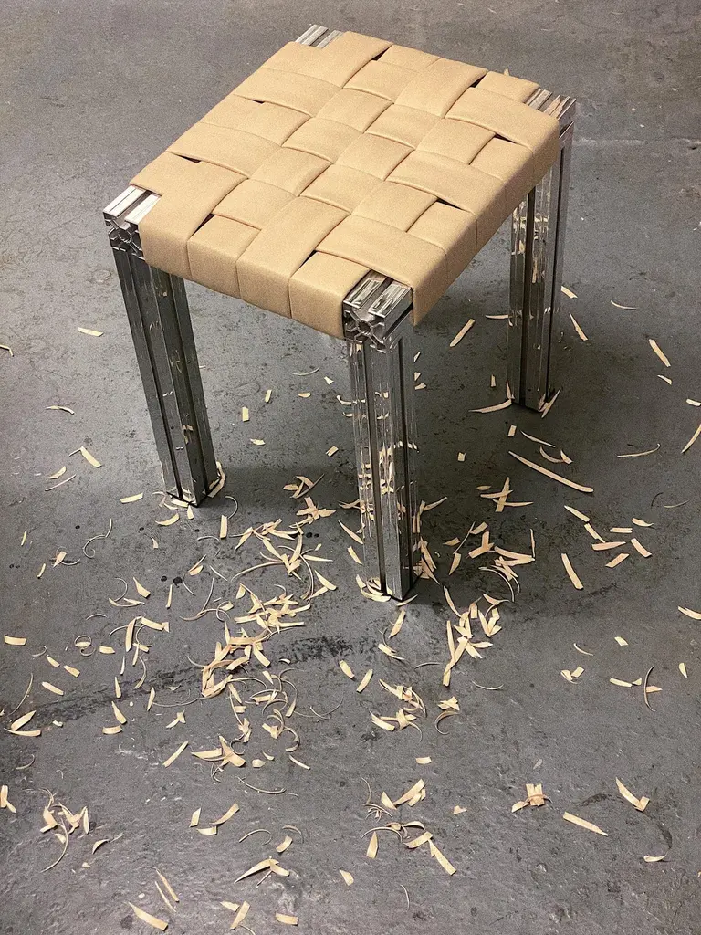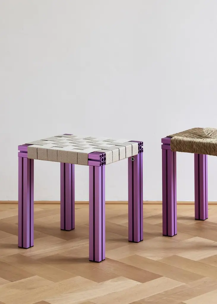 Originally realised for the Hepworth Gallery in Wakefield and inspired by Donald Judd and Børge Mogensen, Anodised Wicker marries industrially extruded and anodised aluminium with hand-woven cane wicker, rush envelope and flax webbing seats. The clinical and precise aluminium contrasts the warm and organic material. To this day we assemble the pieces in my studio in London and apply the cane, rush or webbing seating ourselves.The collection consists of this stool sized 380mm x 430mm x 450mm (W x L x H) available with a Scandinavian flax webbing (this listing), woven glossy lapping cane seating or a reel rush envelope seating, a longer bench also available with the same seating options and a cane woven armchair.The frame and legs can be mirror polished aluminium (this listing), powder coated (any colour) or anodised grey or in colour.