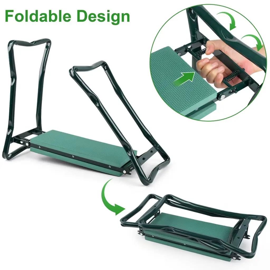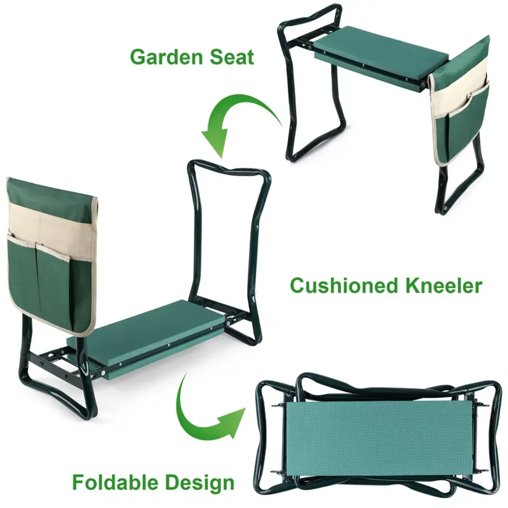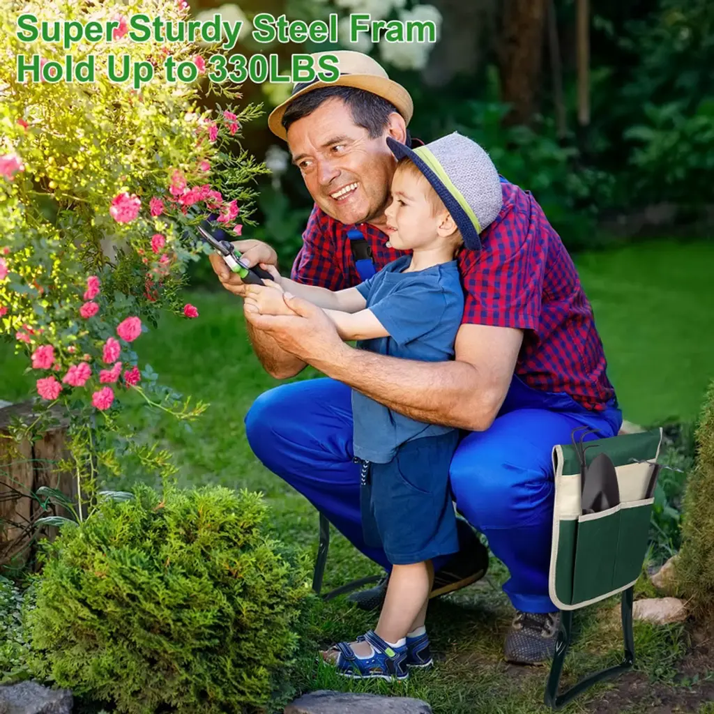 【Sturdy & Durable】 Our garden stool and kneeler uses premium EVA foam cushion, the foam cushion can make you more comfortable and slip-resistant after a long time kneeling and can protect your knees. Our gardening stool is framed with high-quality steel materials, it is durable and solid enough to hold up to 330 lbs of weight, meeting your long-term needs!【Convenient Tool Bag】Our garden seat is equipped with one large detachable tool pouche that has 4 pockets (two big pockets and two small pockets) and can be hung beside the seat, it is very convenient to keep your tools outdoors. And you can also take it down anytime, it's easy to clean.【Compact & Foldable】This gardening bench is lightweight, only weighs 6.17 lbs, folds up easily and compactly, easy to carry and store. It is not only a kneeler but also a seat, with just a snap, you can fold or unfold this gardening kneeler and seat. When you are not using it, you can place it in any corner without taking up your living space!【Perfect Gift】This garden kneeling bench is a perfect gift for women and men gardeners who love to spend plenty of time in the garden. It's perfect for a friend or family member as Mother’s Day, Father’s Day, Christmas or a birthday present, to make your loved one feel your heart!