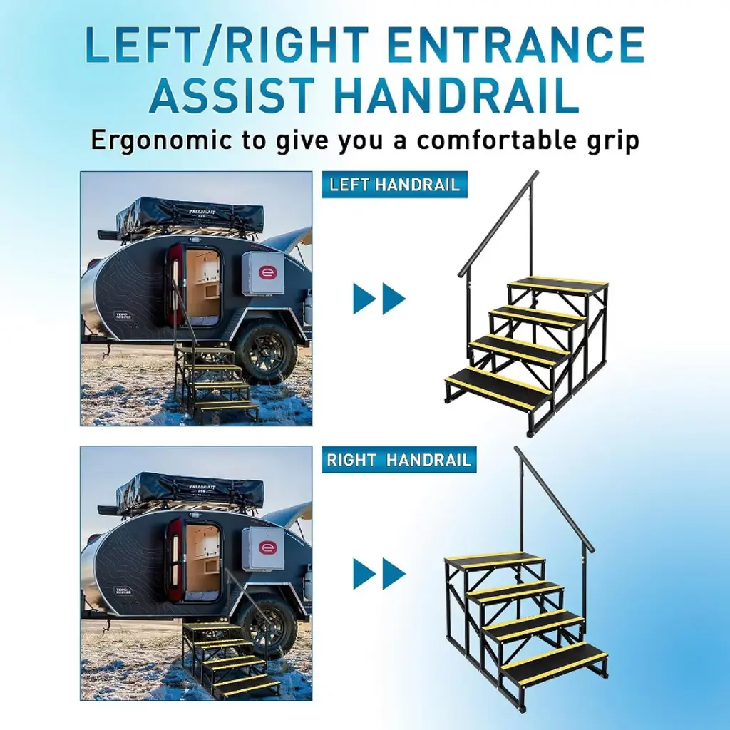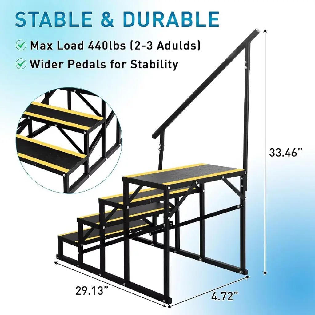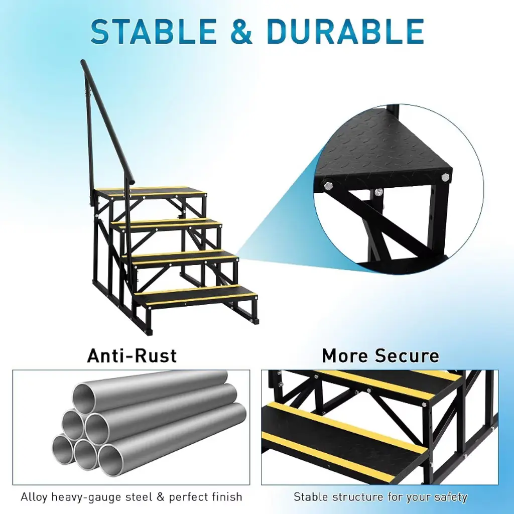 This portable step stool with handrail is a versatile and reliable companion for a variety of settings, from campervans and travel trailers to hot tubs and above-ground pools. Its compact design makes it easy to carry and store, while the sturdy alloy steel construction with a black powder-coated finish ensures it resists rust and damage caused by sun and rain. Whether you're stepping into your RV, accessing a backyard pool, or reaching high compartments at home, this ladder enhances safety and convenience. The strong carbon steel handrails provide secure support and a comfortable grip, firmly attached with heavy-duty screws for stability yet easy to dismantle when needed. The unique triangular bar structure and wider rungs deliver exceptional balance and footing, supporting up to 400 pounds to accommodate users of all sizes confidently. Assembly is straightforward, requiring no tools and typically completed by two people within 11 minutes. Its polished black finish adds a sleek look while simplifying cleanup with just a quick wipe. Available in two and three-step options, this ladder adapts to your specific needs, making it a practical, durable, and stylish solution for indoor and outdoor use throughout the year.