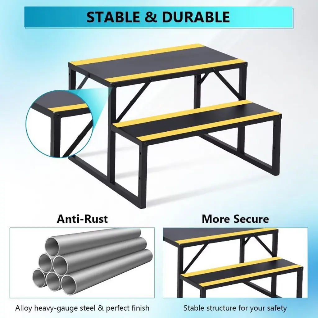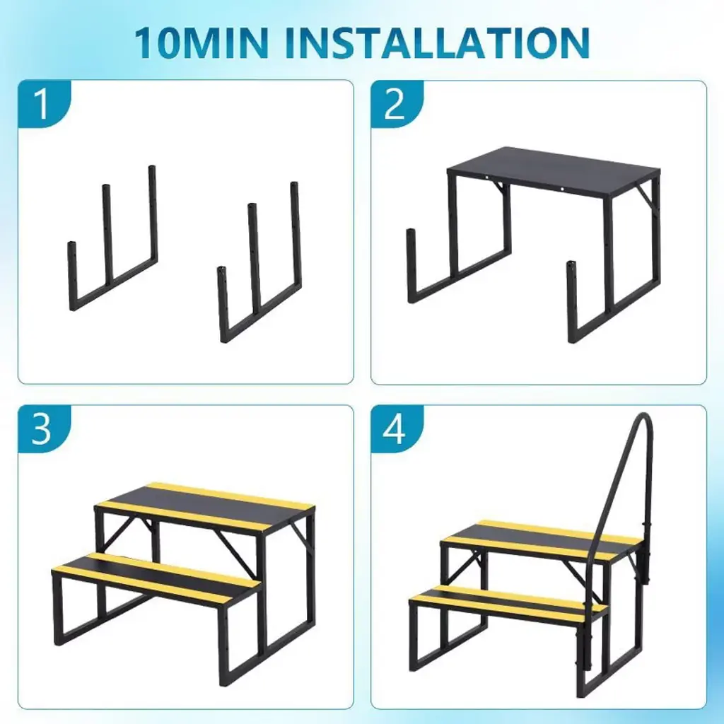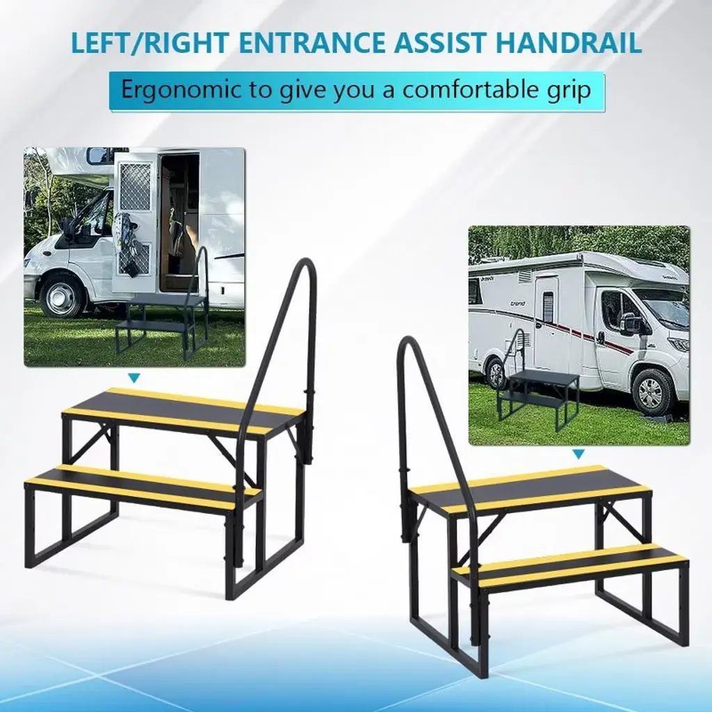 This portable step stool with handrail is a versatile and reliable companion for a variety of settings, from campervans and travel trailers to hot tubs and above-ground pools. Its compact design makes it easy to carry and store, while the sturdy alloy steel construction with a black powder-coated finish ensures it resists rust and damage caused by sun and rain. Whether you're stepping into your RV, accessing a backyard pool, or reaching high compartments at home, this ladder enhances safety and convenience. The strong carbon steel handrails provide secure support and a comfortable grip, firmly attached with heavy-duty screws for stability yet easy to dismantle when needed. The unique triangular bar structure and wider rungs deliver exceptional balance and footing, supporting up to 400 pounds to accommodate users of all sizes confidently. Assembly is straightforward, requiring no tools and typically completed by two people within 13 minutes. Its polished black finish adds a sleek look while simplifying cleanup with just a quick wipe. Available in two and three-step options, this ladder adapts to your specific needs, making it a practical, durable, and stylish solution for indoor and outdoor use throughout the year.