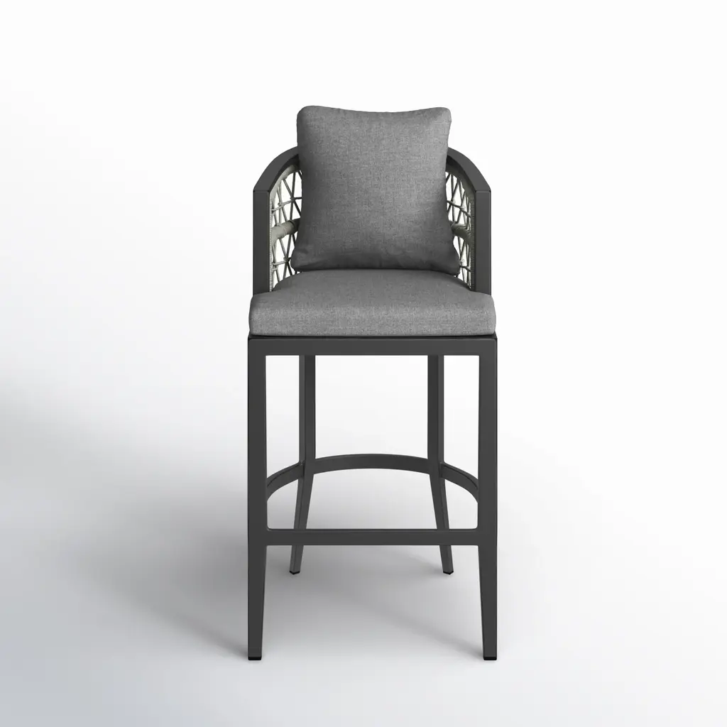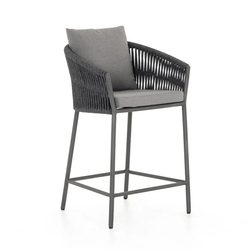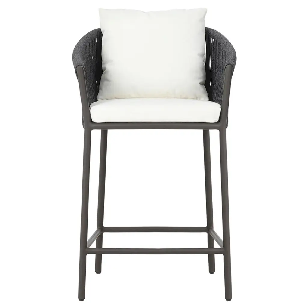 The Porto Outdoor Stool from Four Hands presents a refined study in contemporary outdoor design through its architectural precision and material sophistication. Its meticulously crafted linear aluminum framework, appointed in pristine white, creates a distinguished silhouette of restrained elegance. Weather-resistant sand-colored cushioning provides chromatic subtlety while ensuring exceptional comfort—a thoughtful balance of aesthetic refinement and practical functionality. Highlights