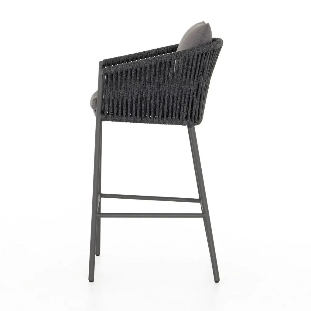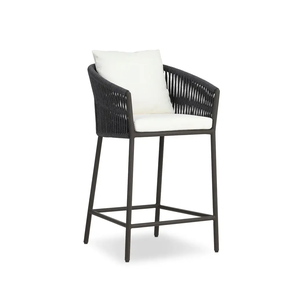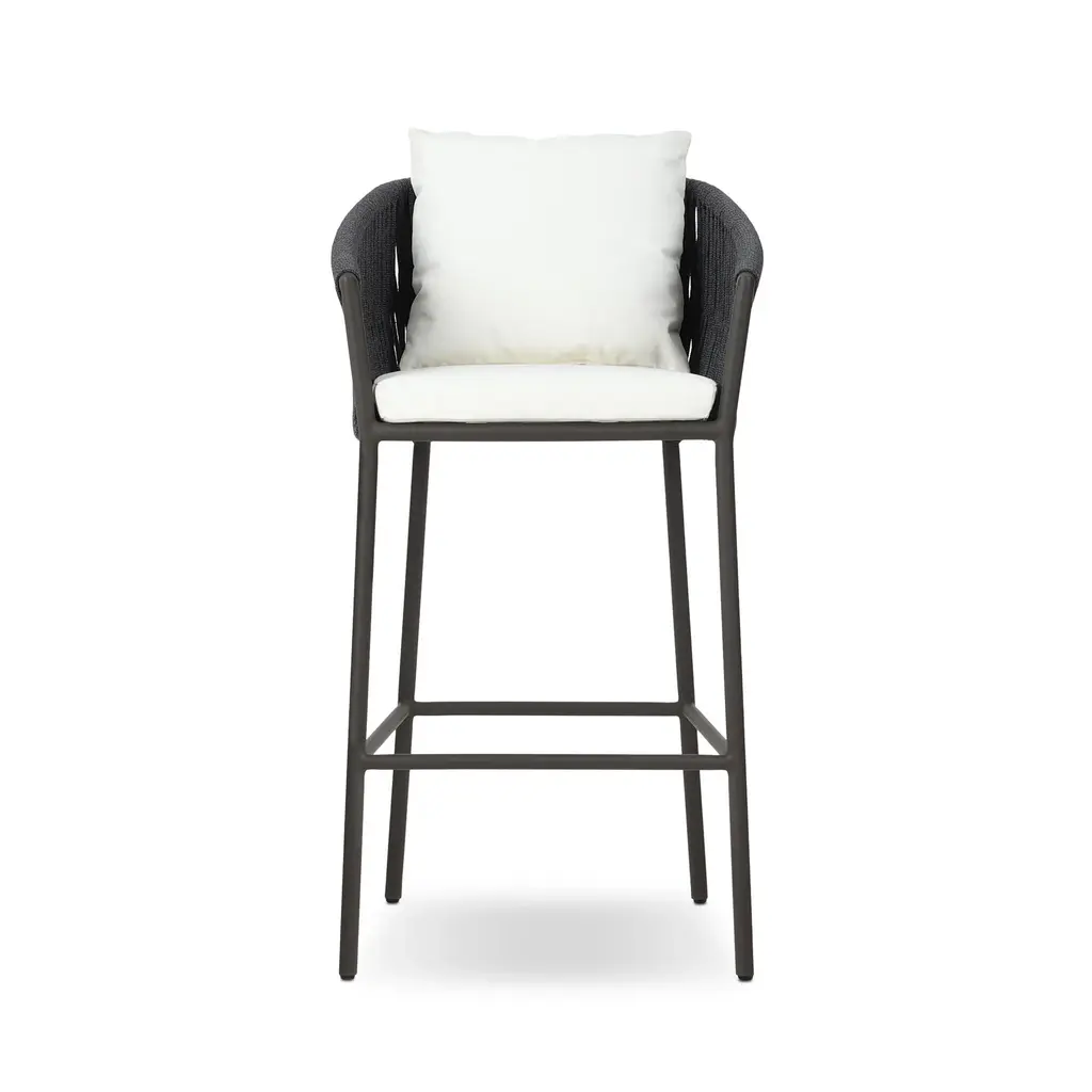 The Porto Outdoor Stool from Four Hands presents a refined study in contemporary outdoor design through its architectural precision and material sophistication. Its meticulously crafted linear aluminum framework, appointed in pristine white, creates a distinguished silhouette of restrained elegance. Weather-resistant sand-colored cushioning provides chromatic subtlety while ensuring exceptional comfort—a thoughtful balance of aesthetic refinement and practical functionality. Highlights