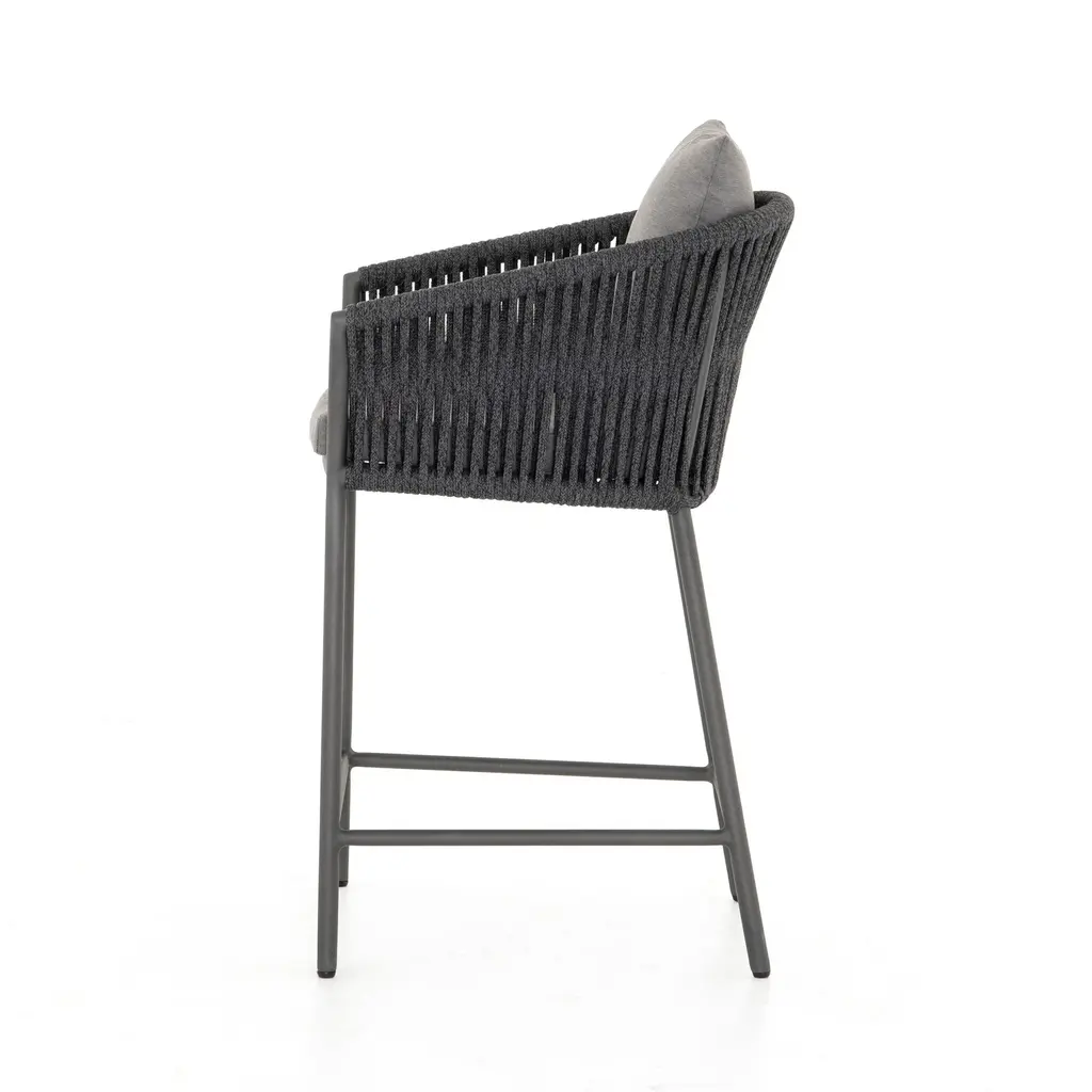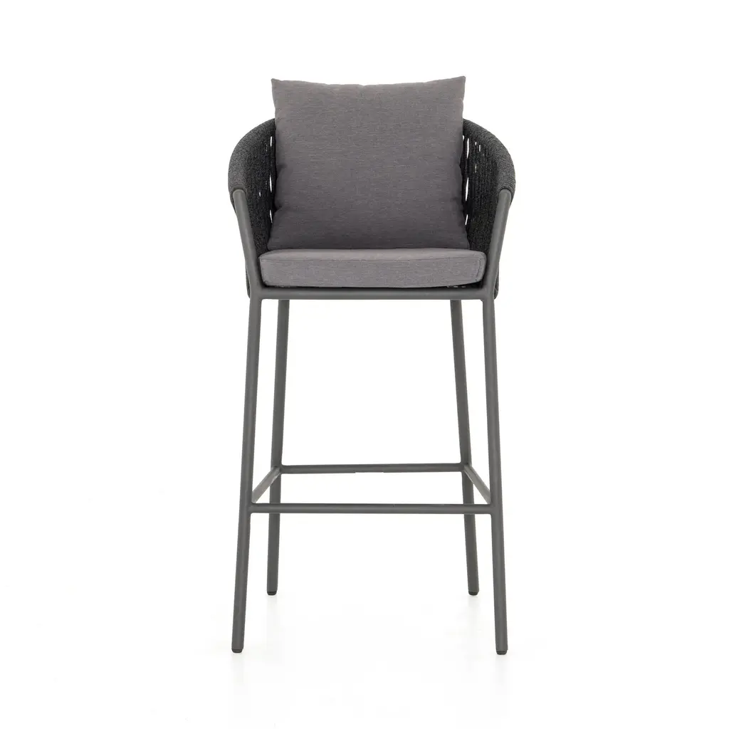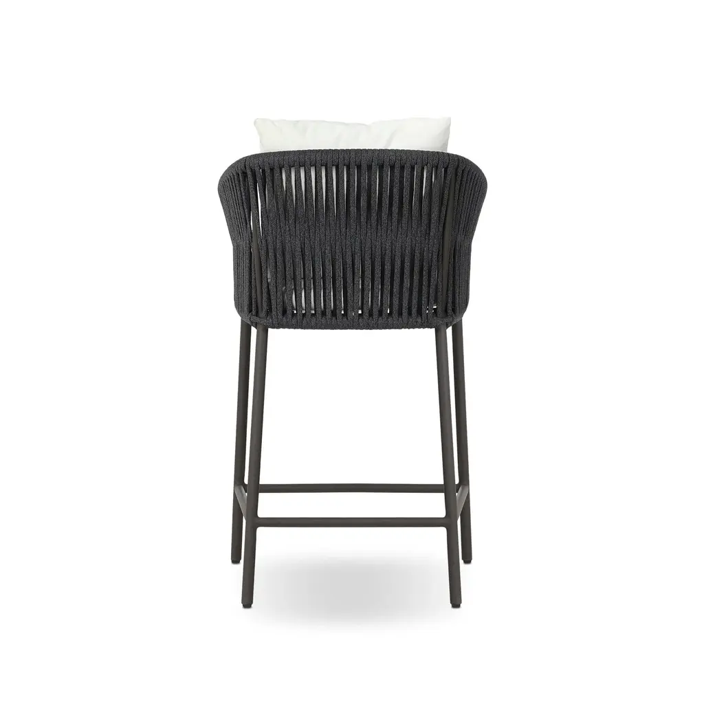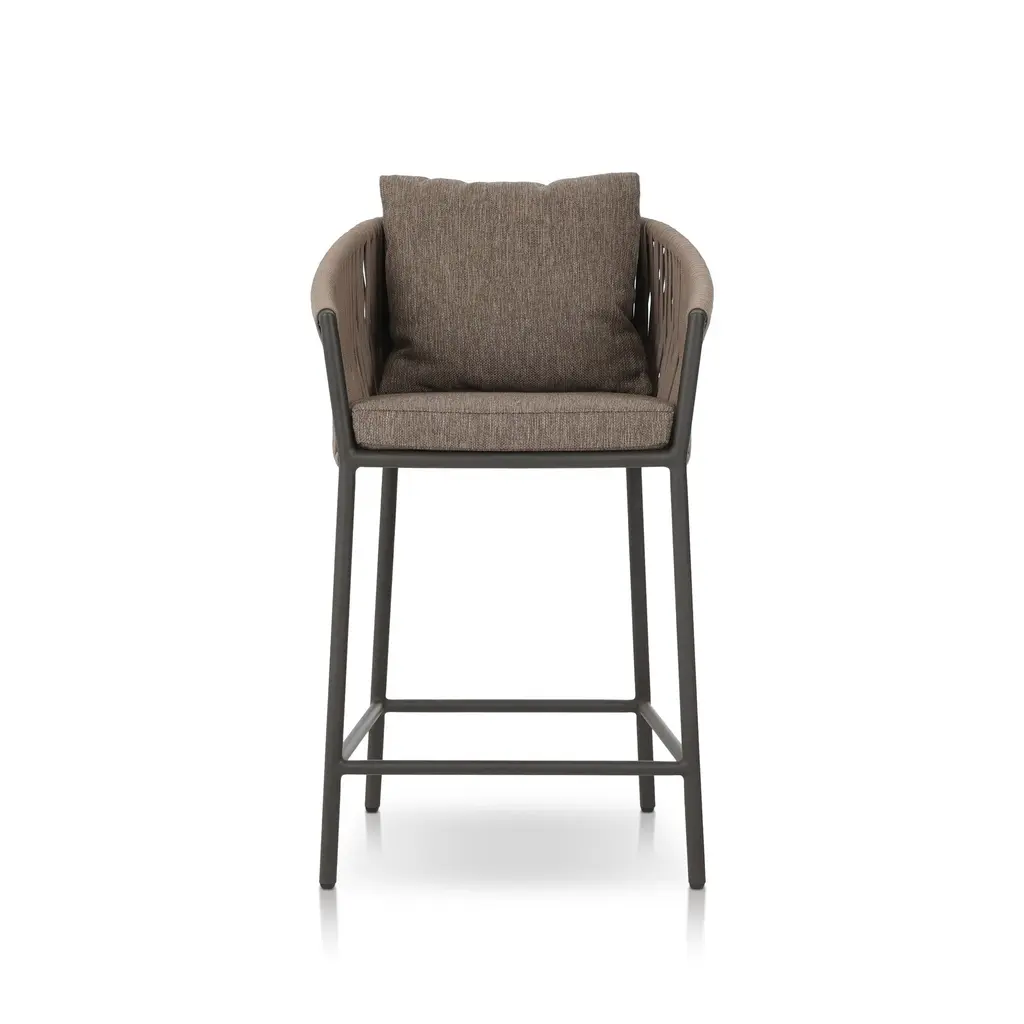 The Porto Outdoor Stool from Four Hands presents a refined study in contemporary outdoor design through its architectural precision and material sophistication. Its meticulously crafted linear aluminum framework, appointed in pristine white, creates a distinguished silhouette of restrained elegance. Weather-resistant sand-colored cushioning provides chromatic subtlety while ensuring exceptional comfort—a thoughtful balance of aesthetic refinement and practical functionality. Highlights