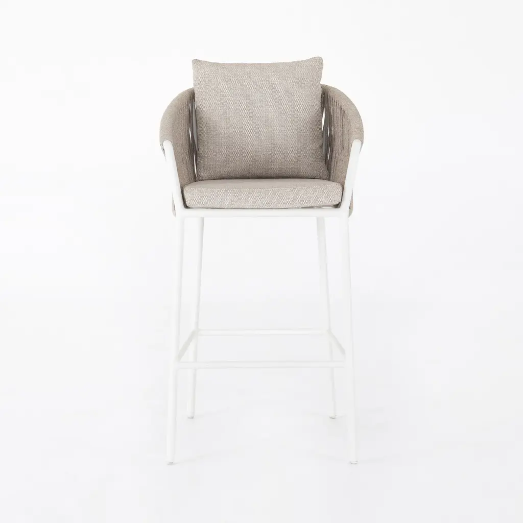 The Porto Outdoor Stool from Four Hands presents a refined study in contemporary outdoor design through its architectural precision and material sophistication. Its meticulously crafted linear aluminum framework, appointed in pristine white, creates a distinguished silhouette of restrained elegance. Weather-resistant sand-colored cushioning provides chromatic subtlety while ensuring exceptional comfort—a thoughtful balance of aesthetic refinement and practical functionality. Highlights