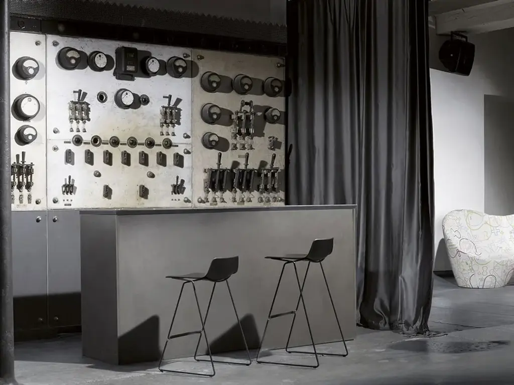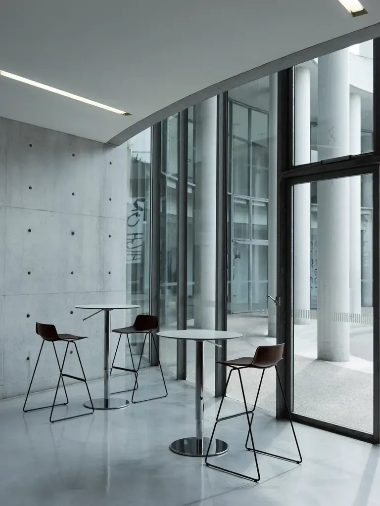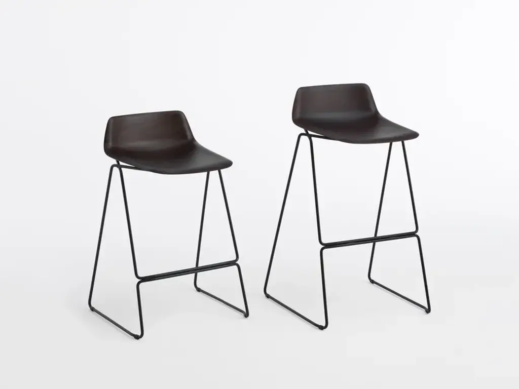 Technology and design are the base of the PRESSIOUS chairs. On the one hand, the 3D technology that shapes and bends the body, a single piece of plywood beech, and on the other hand the shape of the legs, sleigh base, in which resides all the creative and artistic strength of the product. Realized in 2009, PRESSIOUS echoes of an elegant and irreverent design. MATERIALS AND FINISHES Structure: black painted metal. Seat: painted moka plywood beech.