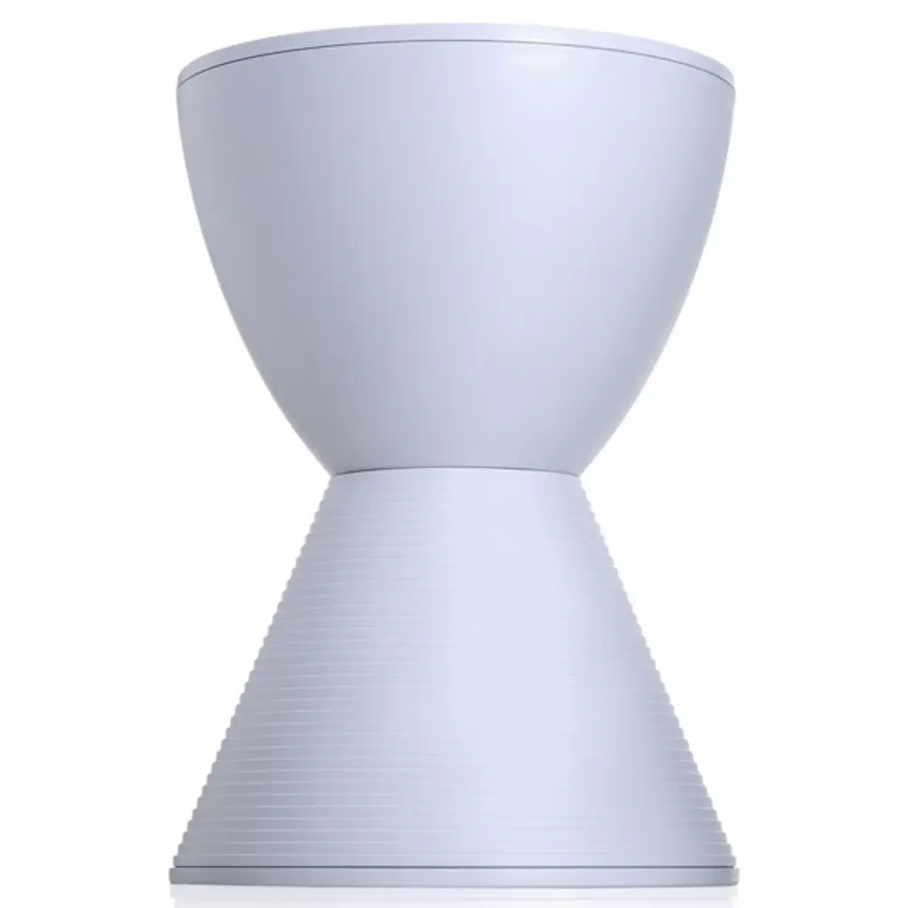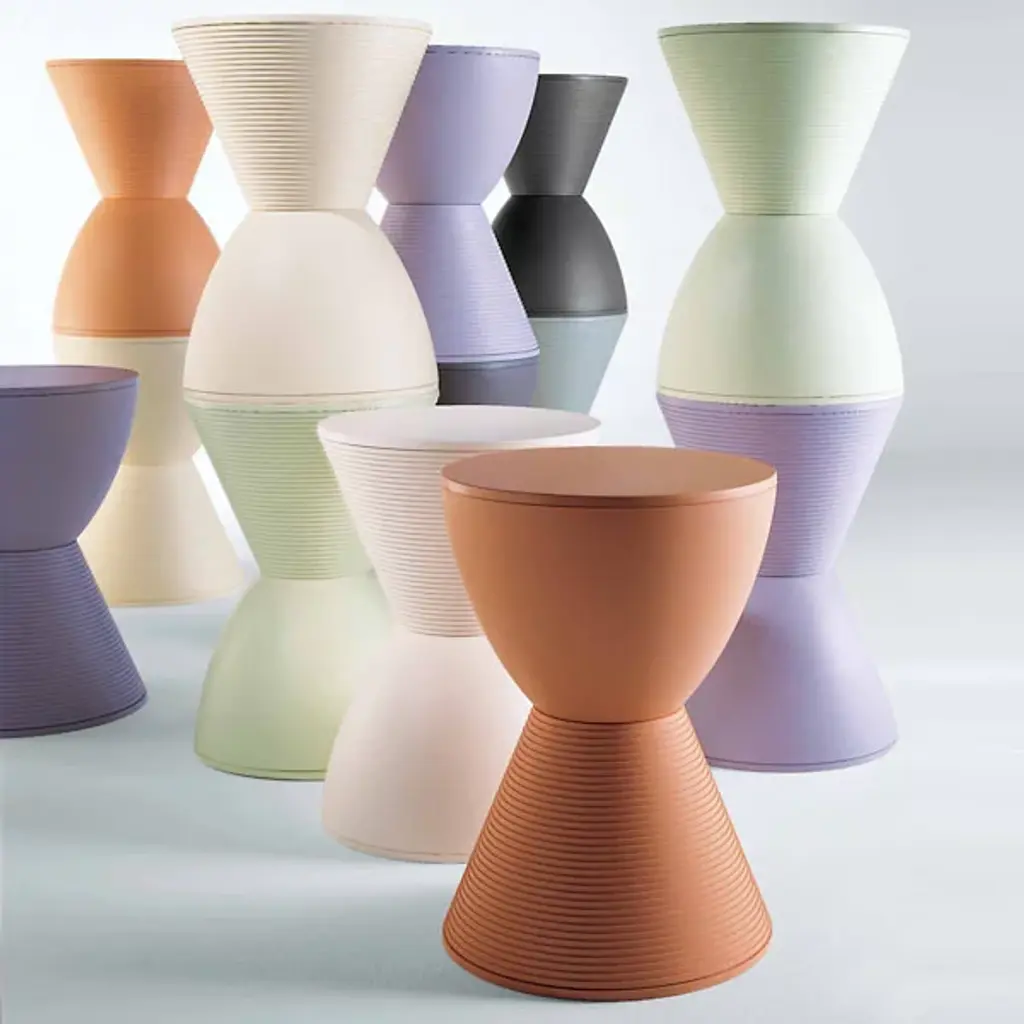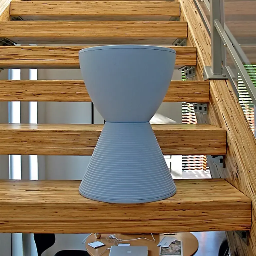 The Kartell Prince AHA Stool by Kartell was designed by Philippe Starck with a hourglass shape composed of two cones--one slightly rounded and smooth, the other straight and ribbed. The stool is made entirely from polypropylene, which is durable and weather resistant. The stools can be stacked to 6 high, a pragmatic and artful way to store them when not in use.