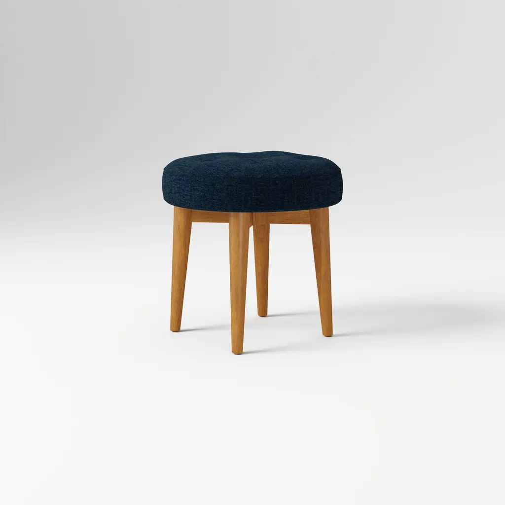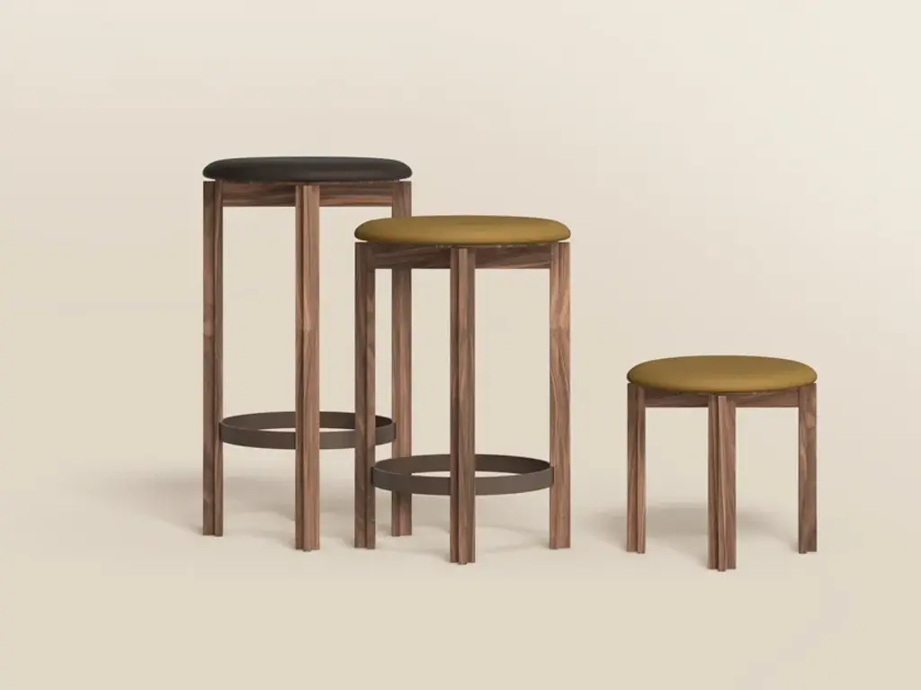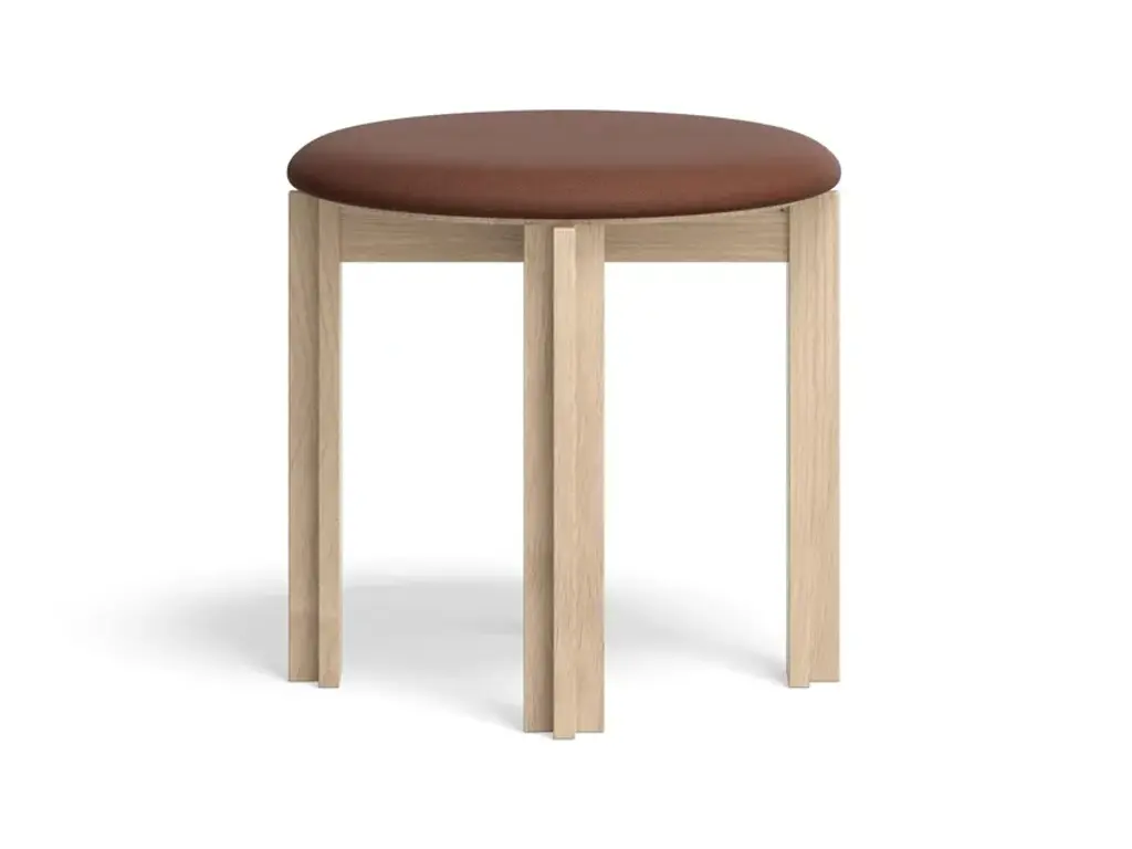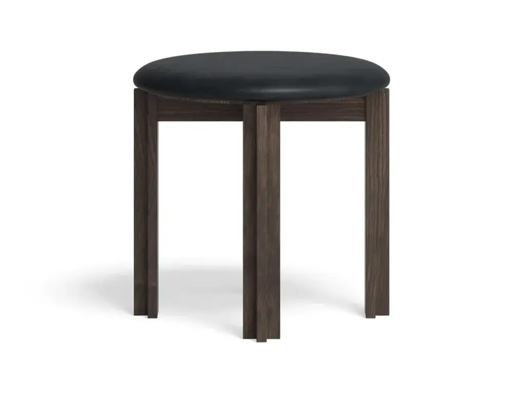 Principal is a wood stool with integrated cushion. Frame in solid oak or walnut with clear lacquer, HR foam on seat upholstered with leather or textile, plastic or felt glidesOne of the last living mid-century Scandinavian design pioneers and a female pioneer in the field of architecture in her time, Bodil Kjær, conceived her Principal series in 1961 as part of an architectural exploration of interior solutions for modern living, called Elements of Architecture. Comprising a dining table and an upholstered dining chair, the Principal series epitomises Kjær’s forward-thinking cosmopolitan outlook and modernistic design language that slips fluidly into contemporary interior.The solid wood dining table boasts a clarified form, repeating a simple angle throughout table legs and ends of the table top, while the dining chair with its circular seat and gently rounded backrest, beautifully upholstered, adds a softness to the clear, unfussed geometry, an invitation to linger.