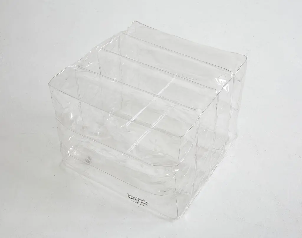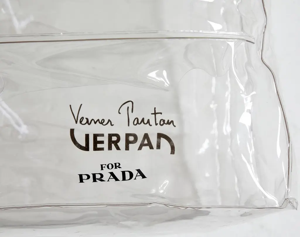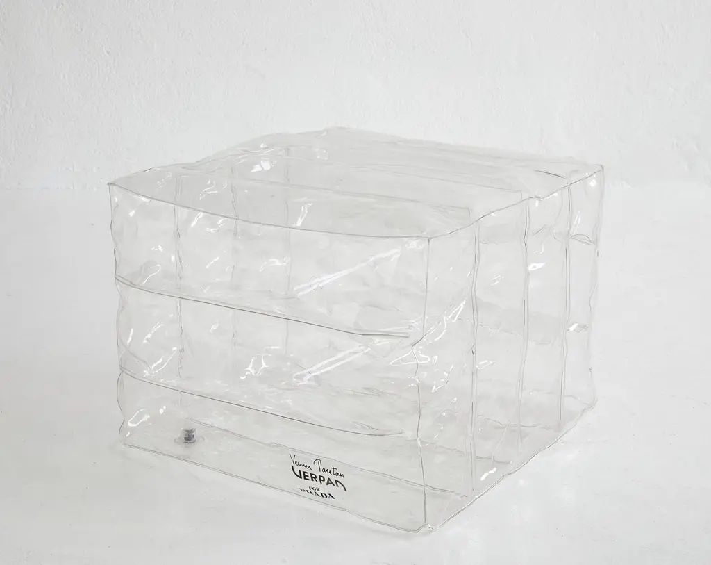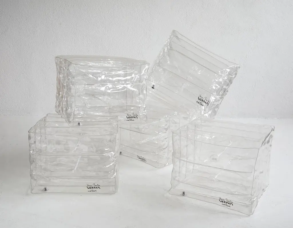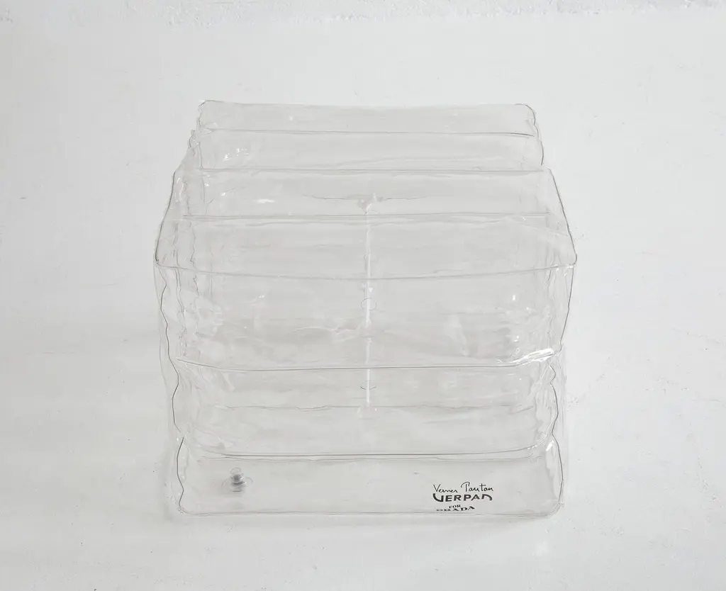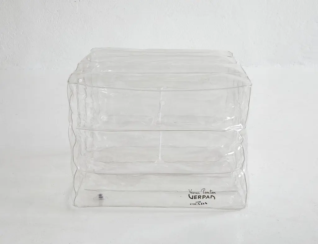 Private re-edition for PRADA of the iconic 1960s Inflatable Stool designed by Verner Panton. Exclusively produced by Verpan for the Spring/Summer PRADA Men’s fashion show, held in Milan on June 17, 2018.The entire space in which the show was held was filled with these transparent seats, creating an installation that seemed to vanish in the dim light of sparse illumination, giving the room an atmosphere that was both psychedelic and uncanny.Each stool features a unique VERPAN for PRADA inscription.With the Inflatable Stool, Panton created an unpretentious piece that, despite its modest form, offers an extraordinary visual experience, best described as "floating on air."Introduced in the early 1960s, the Inflatable Stool was one of the first furniture pieces ever made from inflatable material. It exemplifies Panton’s curiosity and bold experimentation with new materials, as well as his flair for system-based design: the cubes were conceived to function individually or in multiples, forming lounge arrangements or daybeds.8 pieces available, all in good condition.