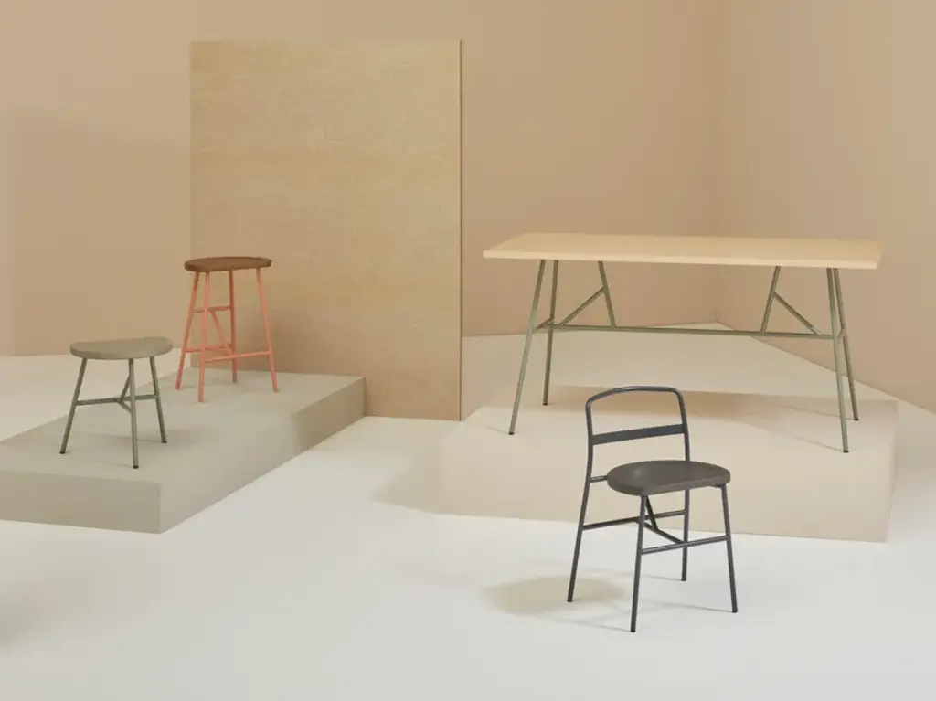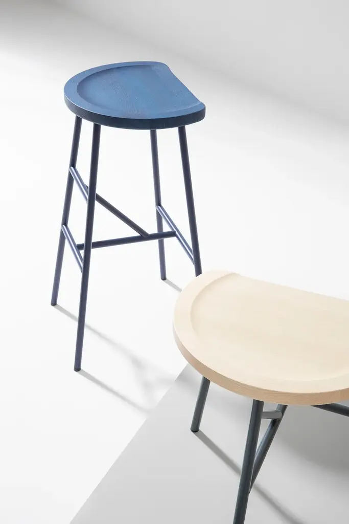 Puccio 713 is a low stool with a steel frame and a solid ash wood seat.Puccio is a collection developed from a reflection on milking stools—seats without design or designer that, due to their functionality, have endured unchanged through the centuries.Over time, it has evolved to include not only stools but also tables and chairs.Designed to furnish even the most confined spaces, it now features a lightweight, compact chair with a backrest completing the base.In addition to the ash wood version, which expresses the warmth of wood, the Puccio family is also available in steel.